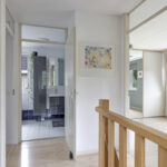 Via een prettige hal met o.a. een zwevend gastentoilet, komen we op de 1e verdieping terecht. Opvallend is dat we op de overloop ook een apart (zwevend) toilet tegenkomen en dat deze dus niet in de badkamer zit. Verder is deze woonlaag ingedeeld met 3 riante slaapkamers van respectievelijk 18m², 10m² en 10m². De slaapkamer aan de achterzijde welke over de volle breedte is gesitueerd en is voorzien van een grote schuifkastenwand zal al snel de hoofdslaapkamer worden. De laminaatvloer is eenduidig over de verdieping gelegd waardoor het een geheel vormt.