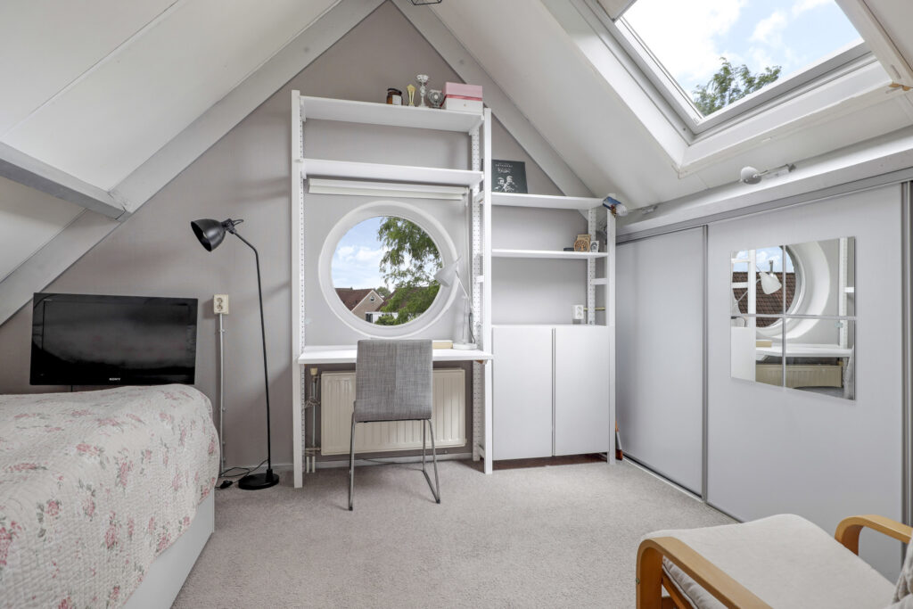 Verrassend is dat er door de hoge nok op de 2e verdieping nóg meer opbergruimte mogelijk is gemaakt. Er is namelijk in de nok een vliering gemaakt met 2 toegangsluiken waardoor je hier eenvoudig de seizoensspullen opbergt.