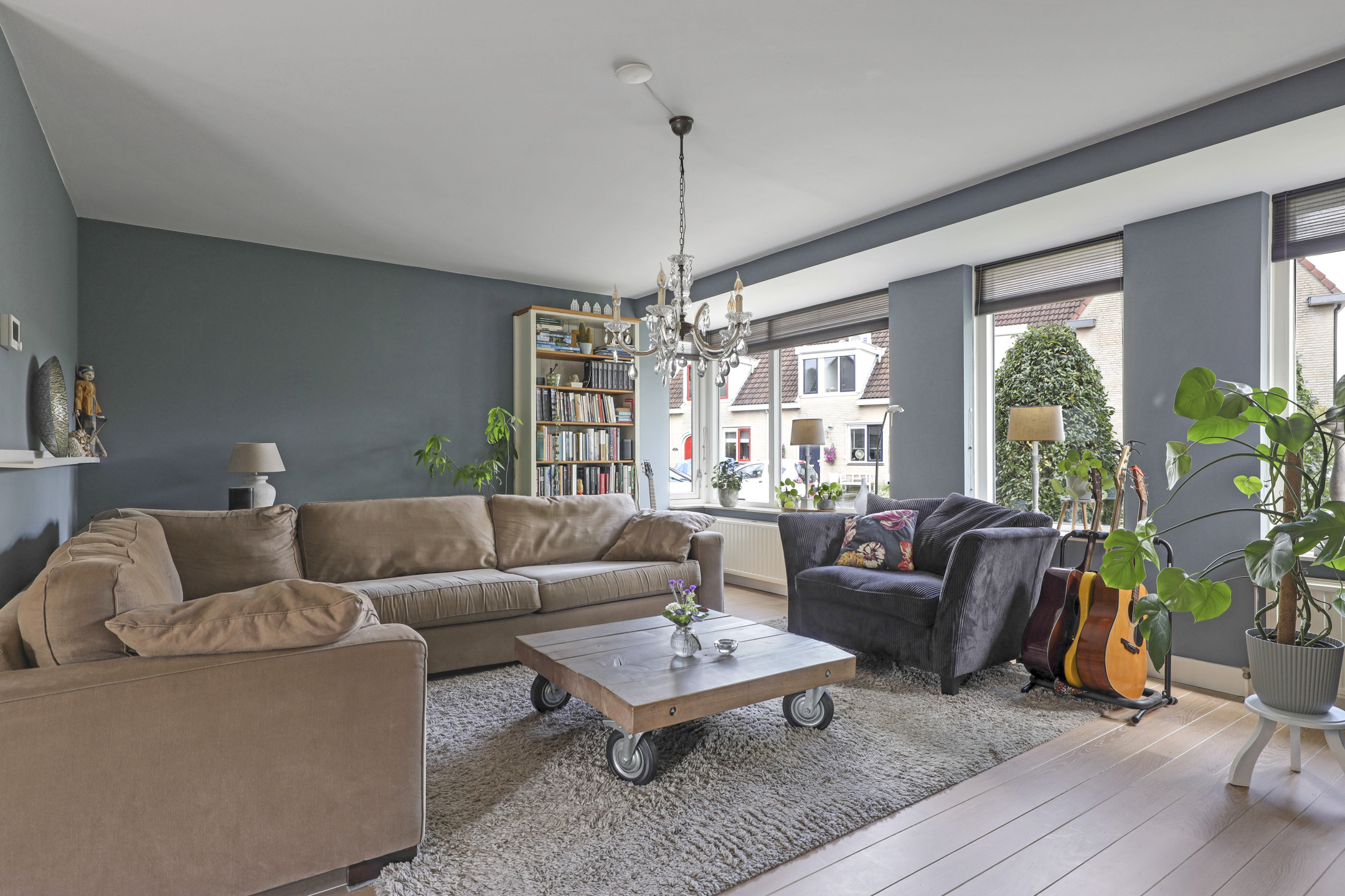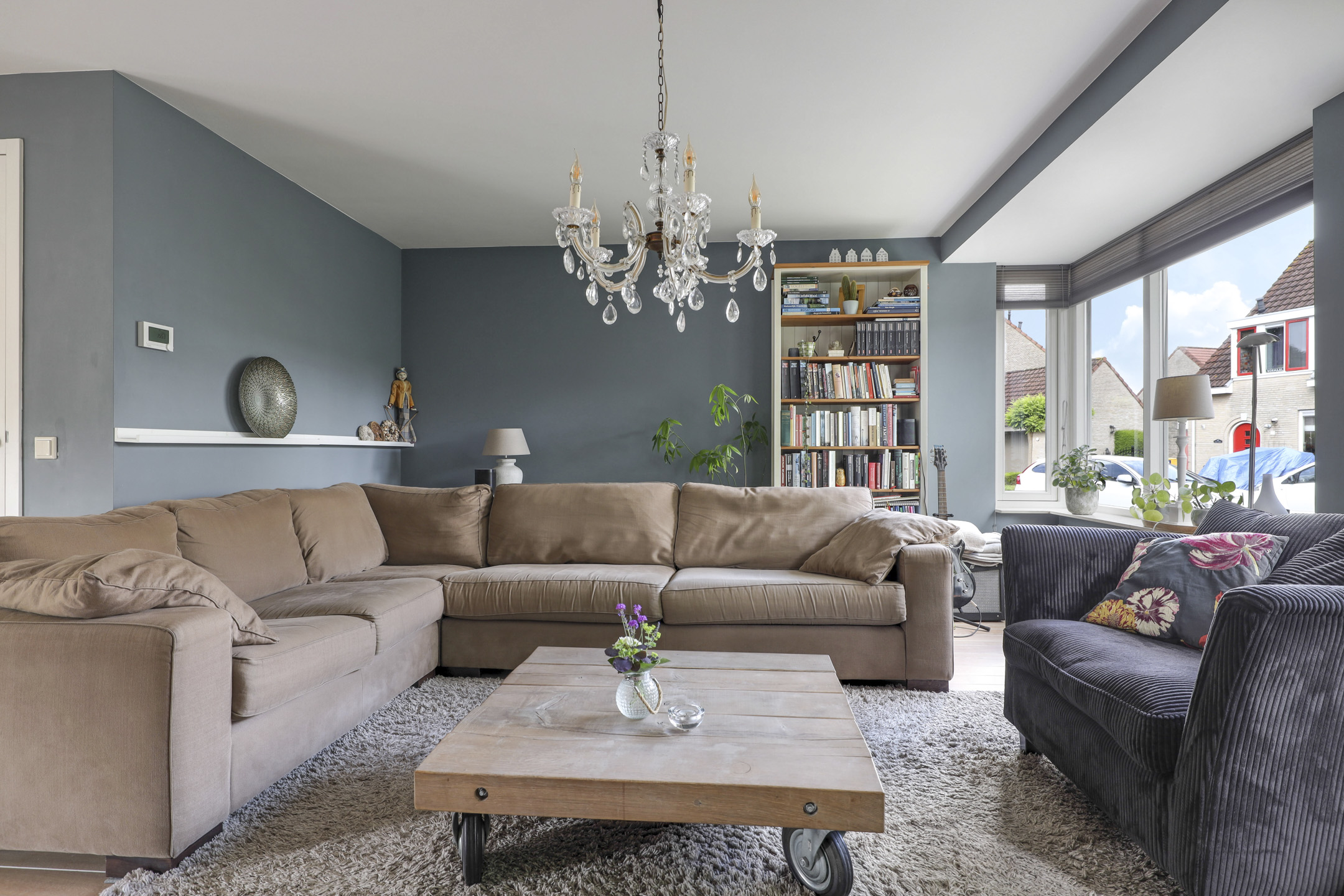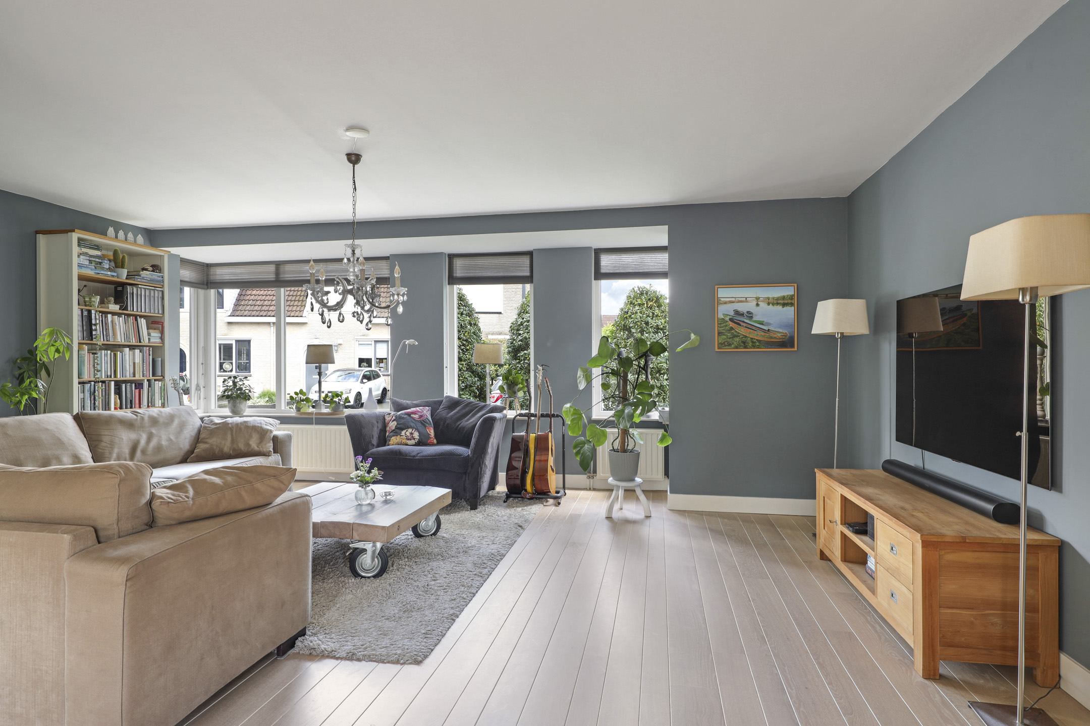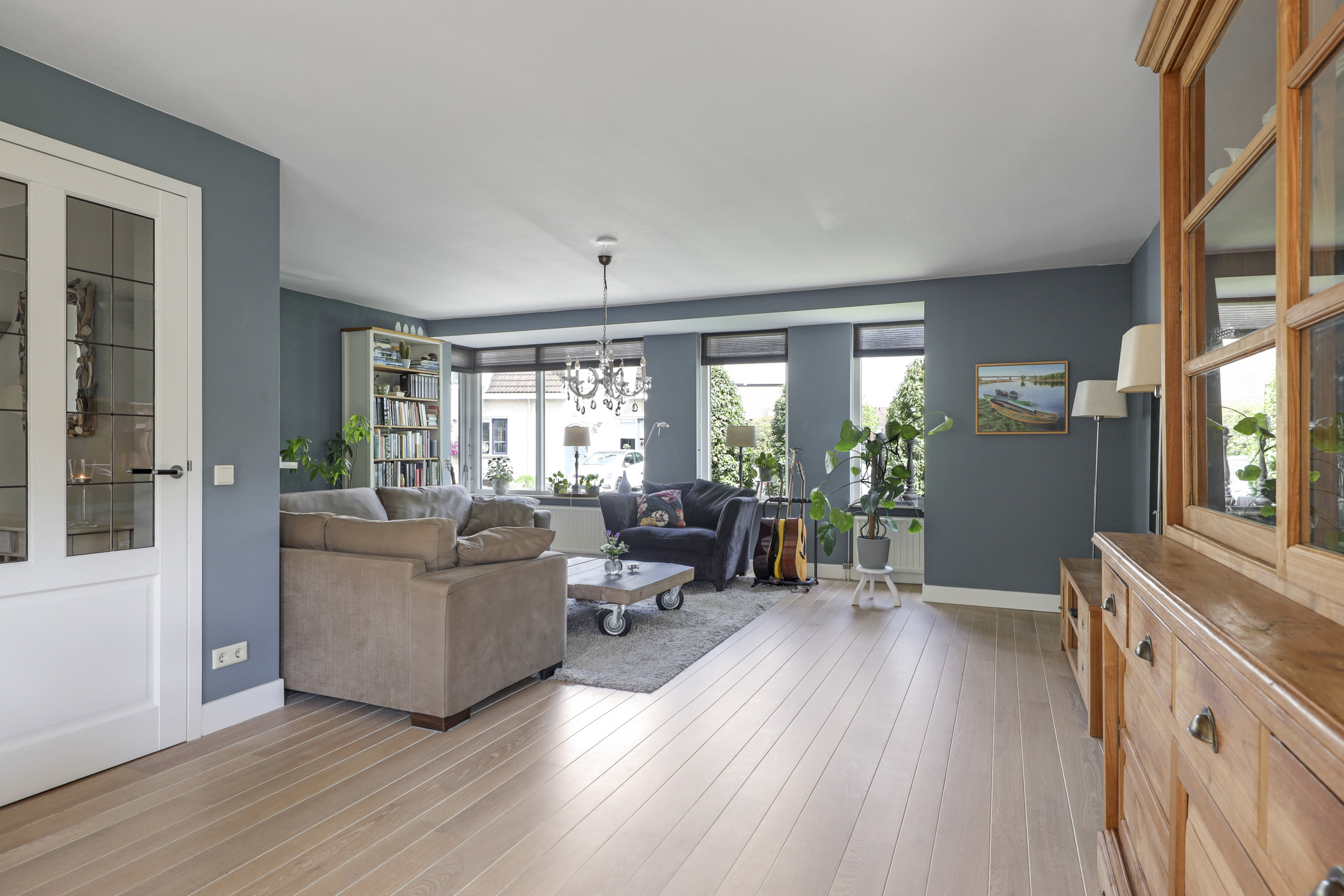 Riante woonkamer met grote erker