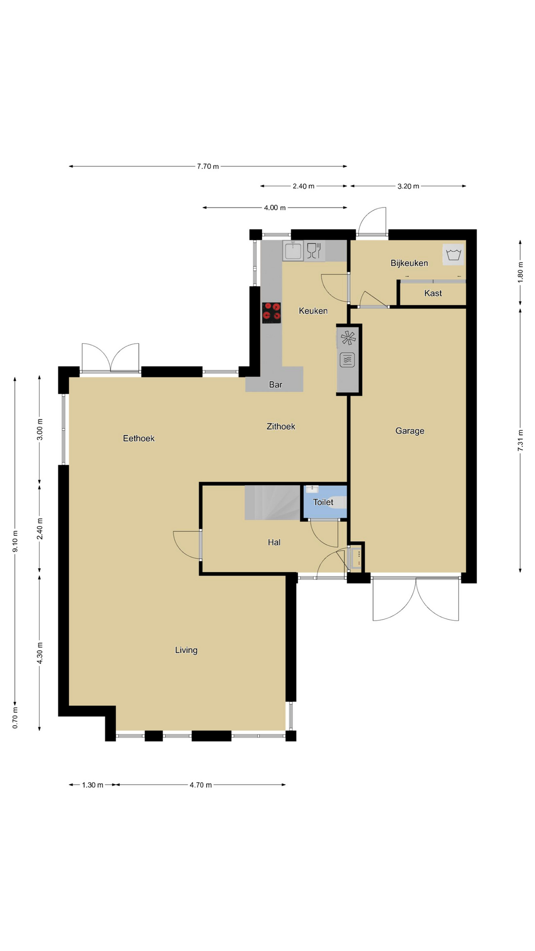 Bij deze woning hoort een inpandige garage. Deze is toegankelijk middels de bijkeuken waardoor dit een extra praktisch ruimte is. Doordat ook de garage groter is dan gemiddeld heb je hier weer lekker veel ruimte. Noemenswaardig zijn de openslaande garagedeuren. Dus geen tochtige stalen kanteldeur, maar degelijke, houten deuren die ook nog bijdragen aan een fraai vooraanzicht.
