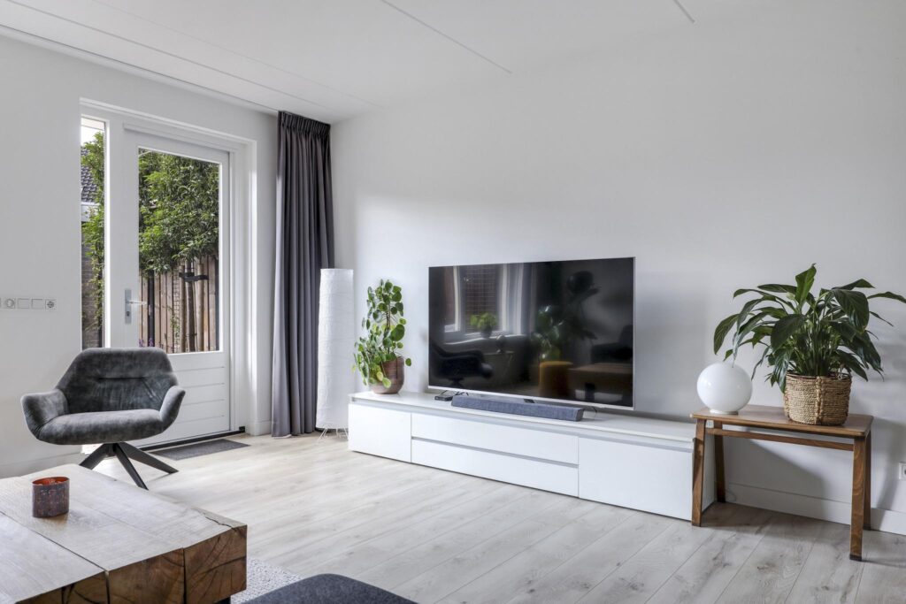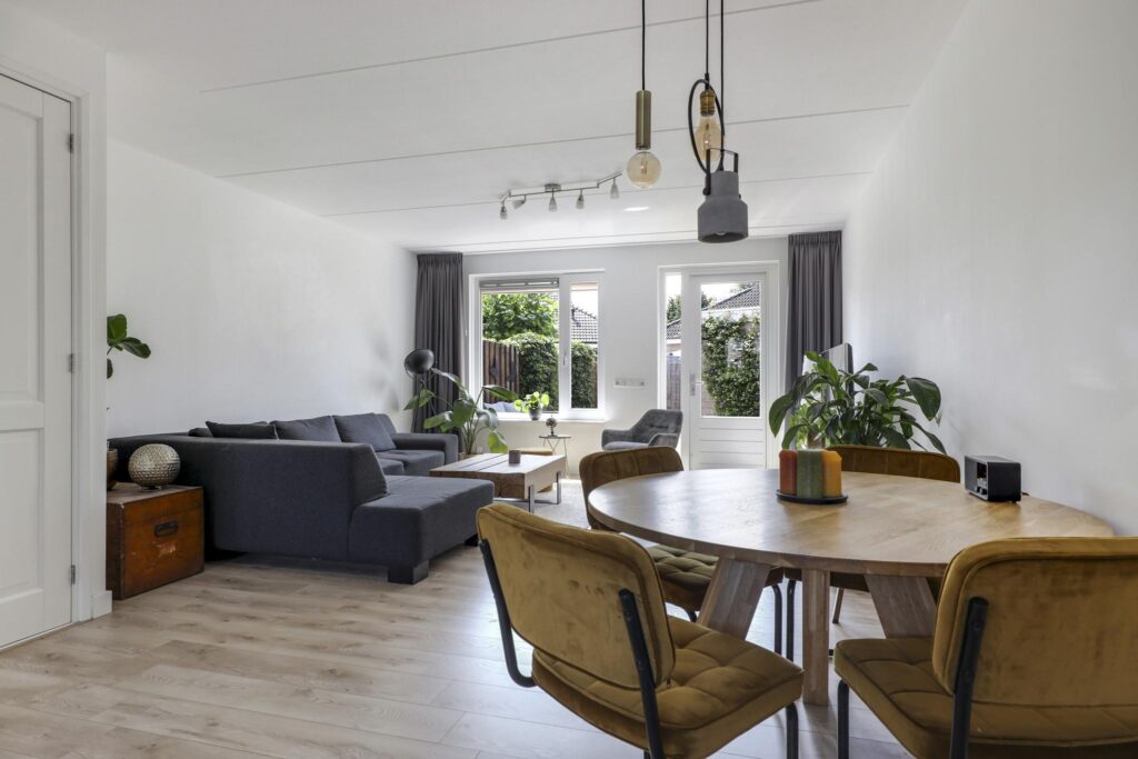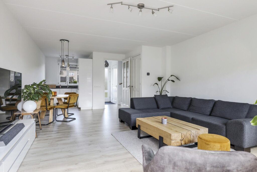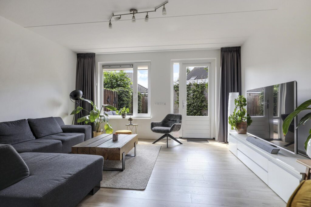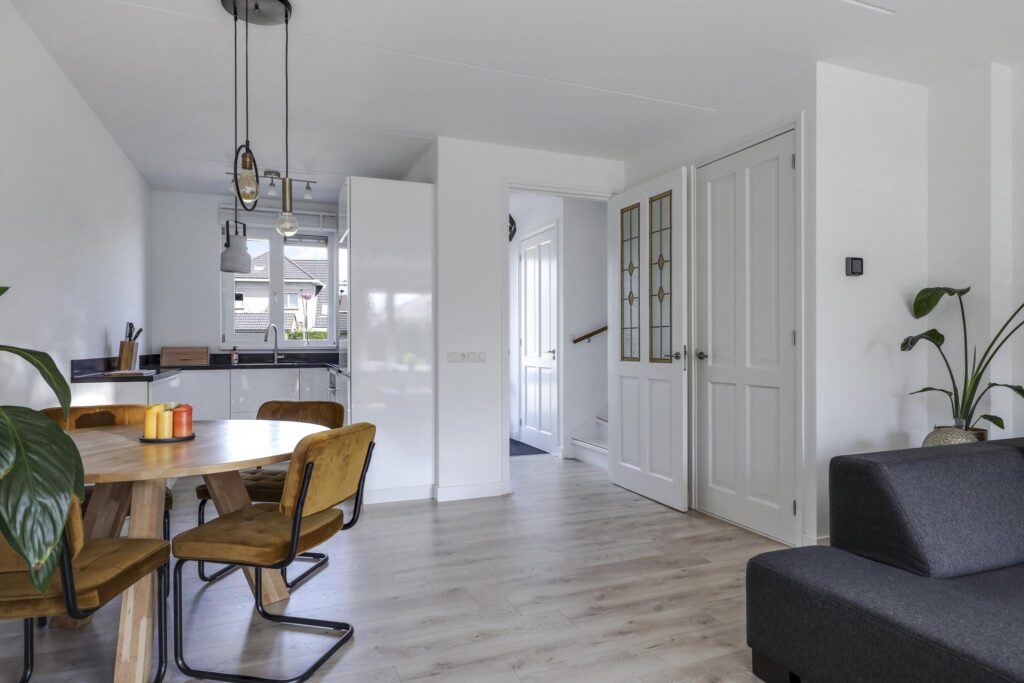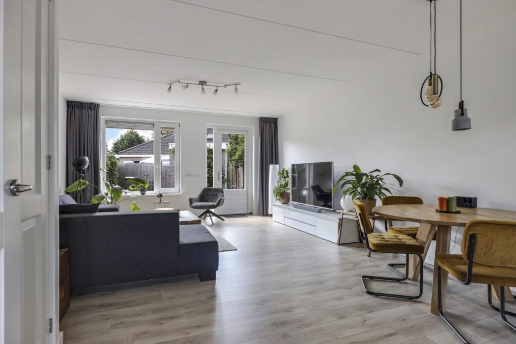 Bij binnenkomst wordt het al meteen duidelijk dat het hier om een verzorgde en neutrale woning gaat. De woonkamer heeft de volle breedte van de woning waardoor de ruimte flexibel is in te richten. Je kunt er met gemak een grote hoekbank en een 6-persoons eettafel kwijt. De woonkamer is tuingericht waarbij een tuindeur direct toegang geeft tot het buitenterras. Op de vloer ligt een strakke laminaatvloer welke is voorzien van vloerverwarming. Verder heeft de woonkamer een handige trapkast waar je veel voorraad en een stofzuiger kwijt kunt. Tijdens de bouw is er, anders dan de standaard, direct gekozen voor houten binnen deuren en kozijnen wat voor een extra hoogwaardige afwerking zorgt.
