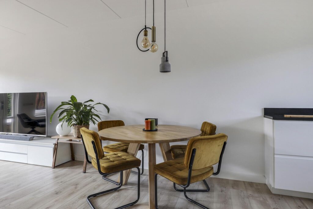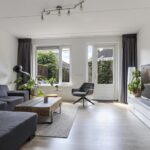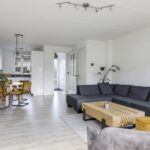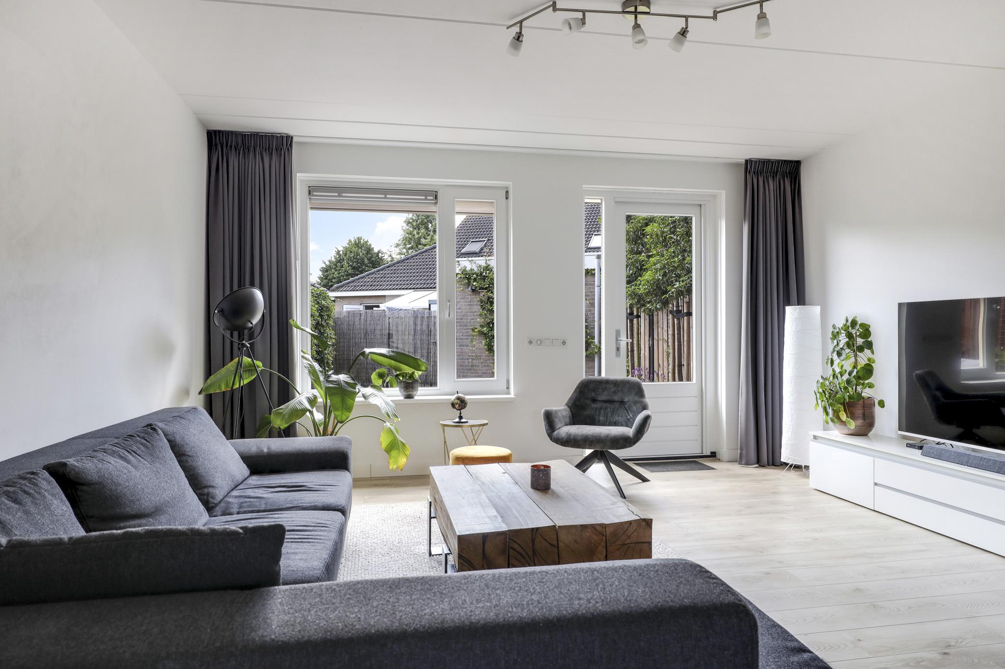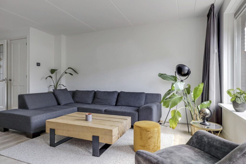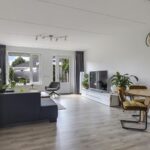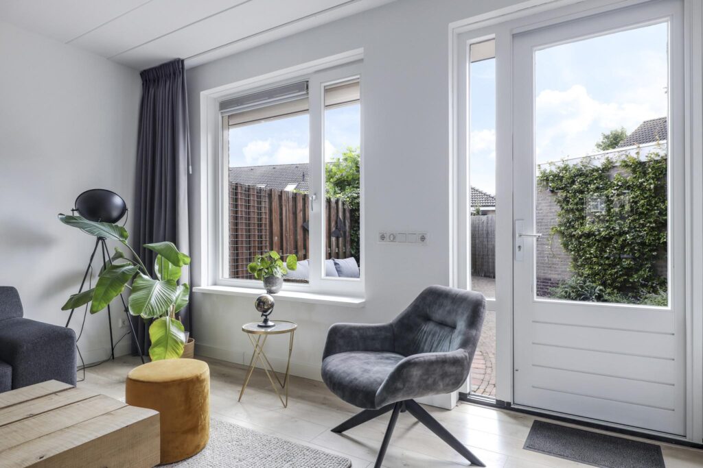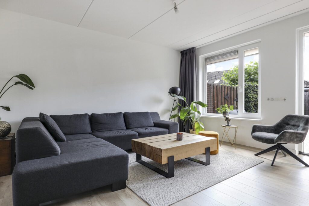 Bij binnenkomst wordt het al meteen duidelijk dat het hier om een verzorgde en neutrale woning gaat. De woonkamer heeft de volle breedte van de woning waardoor de ruimte flexibel is in te richten. Je kunt er met gemak een grote hoekbank en een 6-persoons eettafel kwijt. De woonkamer is tuingericht waarbij een tuindeur direct toegang geeft tot het buitenterras. Op de vloer ligt een strakke laminaatvloer welke is voorzien van vloerverwarming. Verder heeft de woonkamer een handige trapkast waar je veel voorraad en een stofzuiger kwijt kunt. Tijdens de bouw is er, anders dan de standaard, direct gekozen voor houten binnen deuren en kozijnen wat voor een extra hoogwaardige afwerking zorgt.