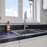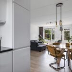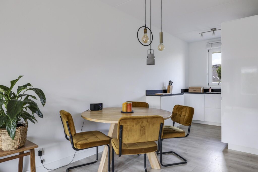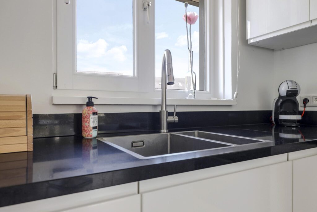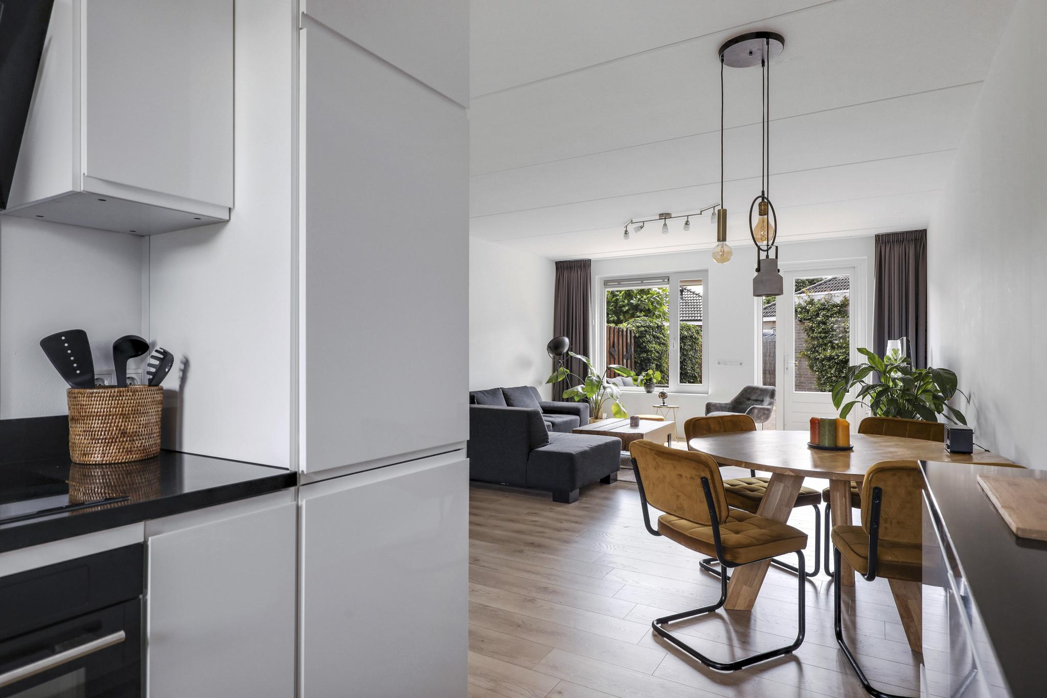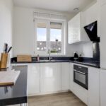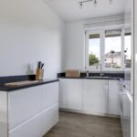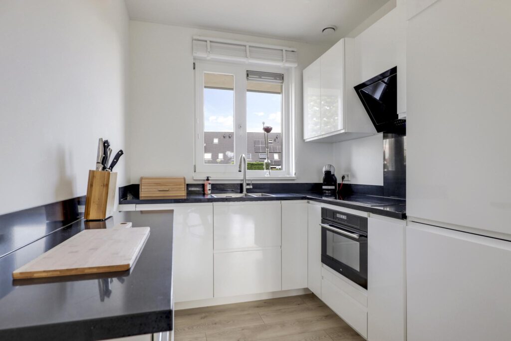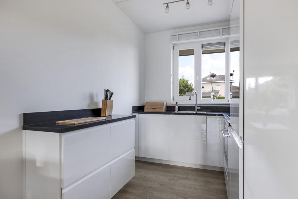 De keuken is aan de voorzijde gelegen en heeft een open karakter naar de woonkamer toe. In 2020 is de keuken vernieuwd waarbij er goed is nagedacht over de ruimte. Er is gekozen voor een moderne uitstraling met witte, strakke deurpanelen en een zwart granieten aanrechtblad. Het keukenblok is in een hoekopstelling geplaatst in combinatie met een 2e keukenblok voor extra werk- en opbergruimte. De inbouwapparatuur bestaat uit een vaatwasser, een koel/vries-combinatie, een 4-pits inductieplaat, een afzuiger en een combi-oven magnetron.