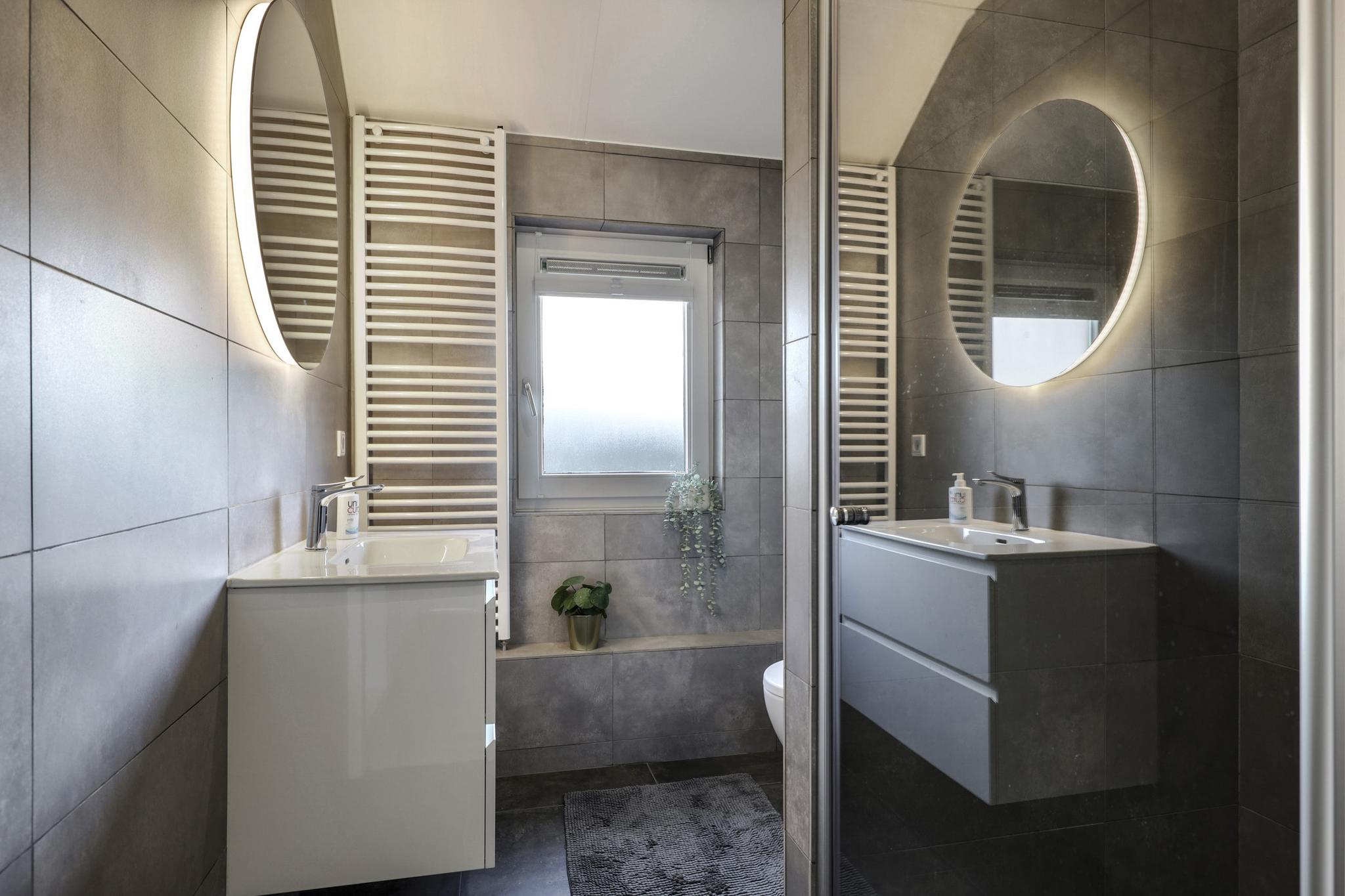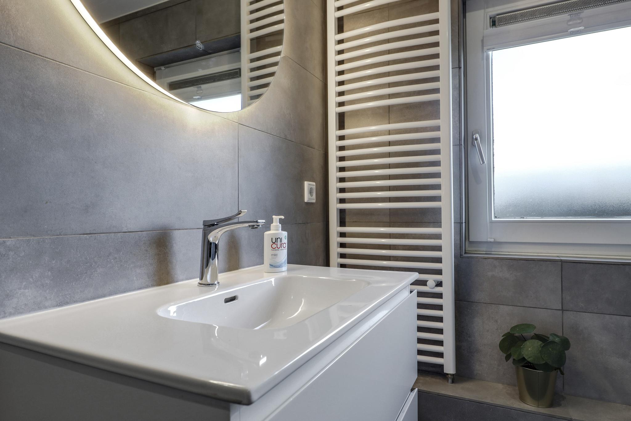 Deze badkamer is in 2020 vernieuwd en heeft dan ook een moderne en trendy uitstraling. De ruimte is ingedeeld met een inloopdouche, een 2e zwevend toilet en een wastafelmeubel met ladekorven. Daarboven is een spiegel met verlichting geplaatst. De inloopdouche is voorzien van een comfortabele grote regendouche. Verder heeft de badkamer een praktisch draai/kiepraam. Hierdoor is er niet alleen daglichttoetreding, maar kun je de badkamer ook goed ventileren. Overigens kun je ook ventileren middels de mechanische ventilatie. De badkamer wordt afgemaakt met een handdoekradiator.