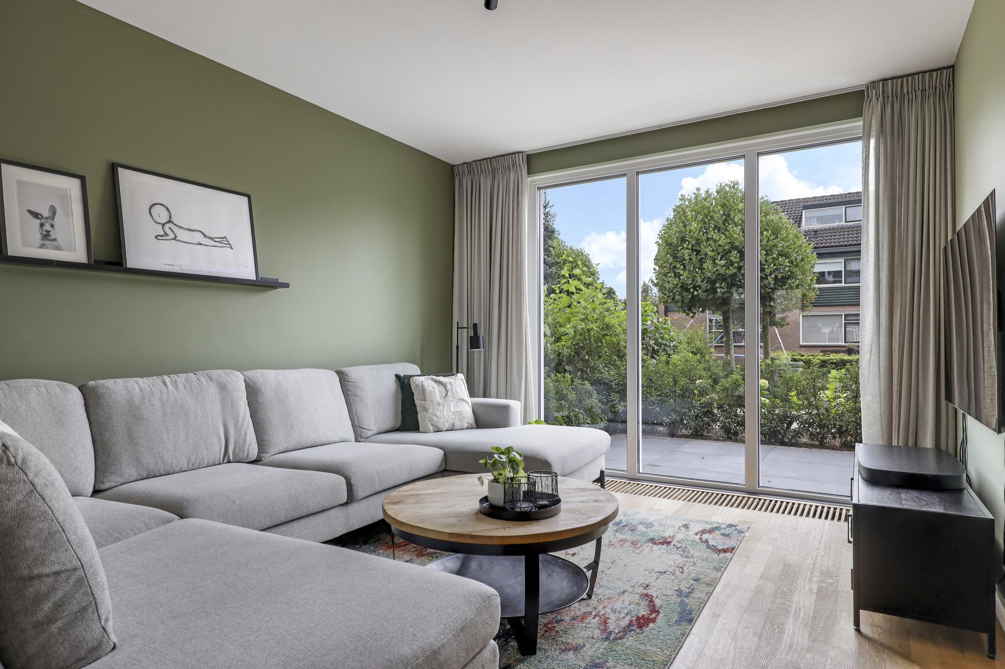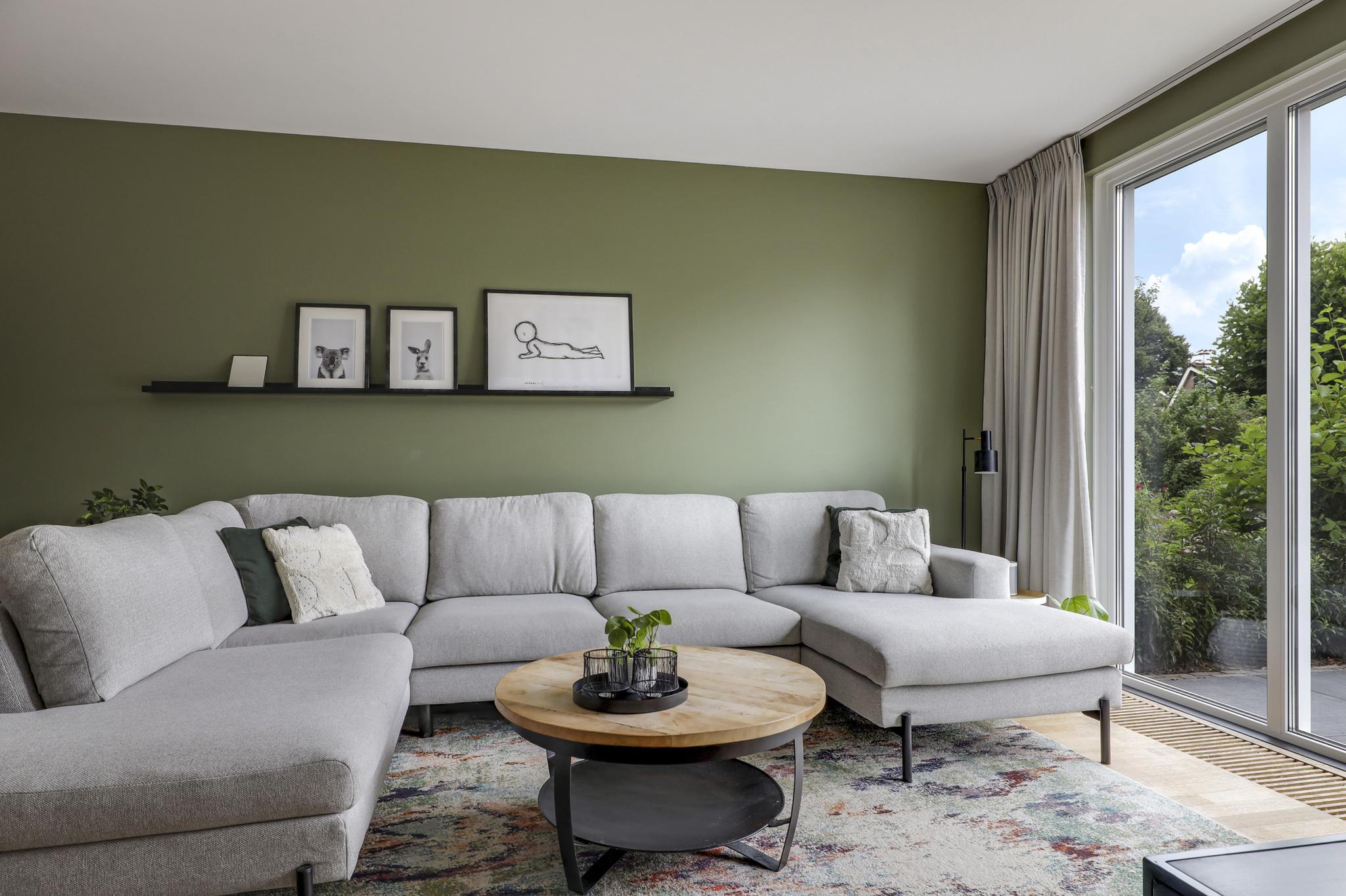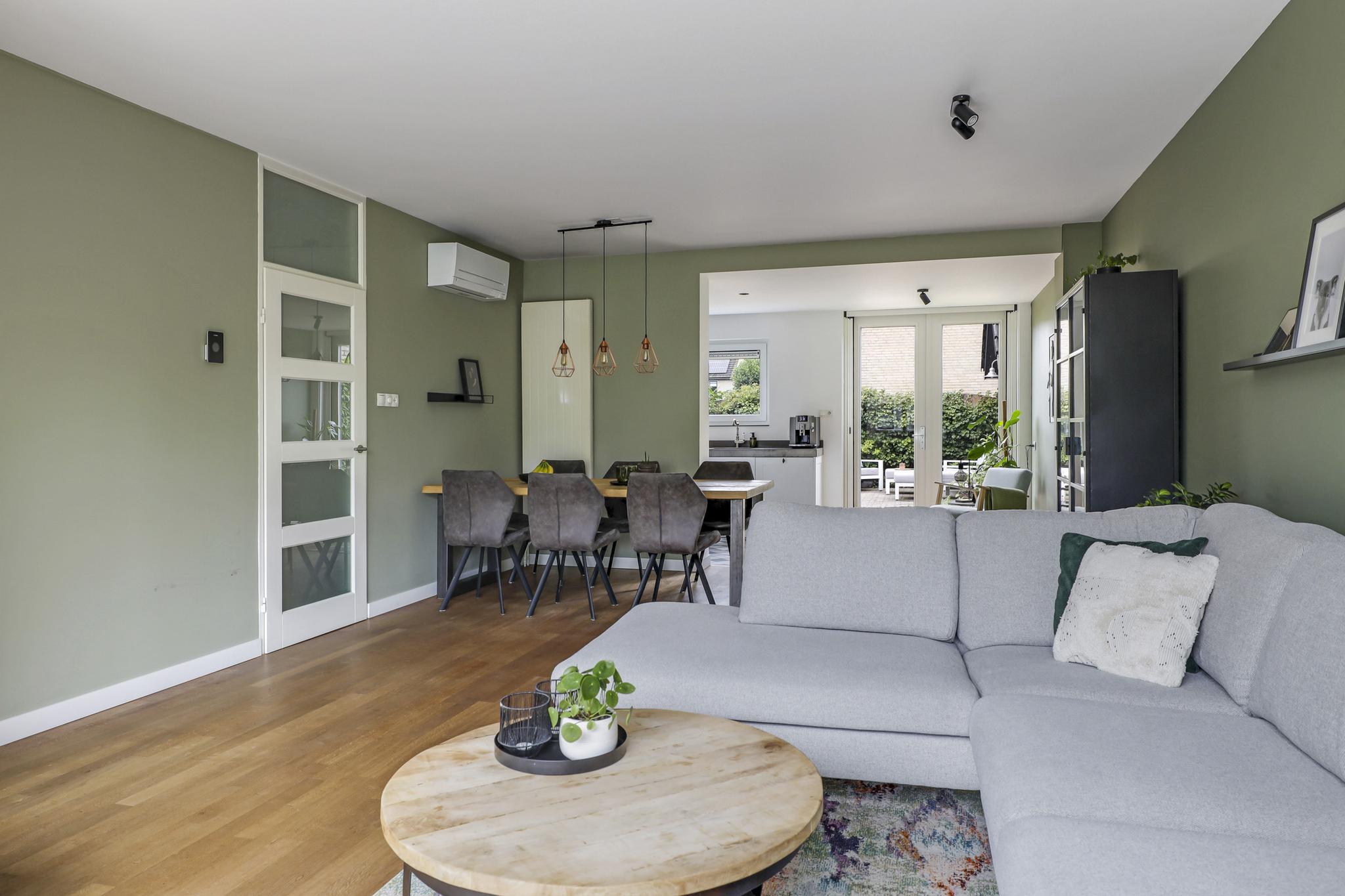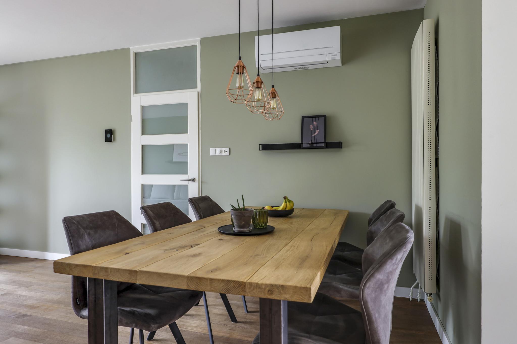 De woonkamer heeft een ruimtelijke indeling. Doordat de woonkamer 4,5 meter breed is en de keuken in de aanbouw een plek heeft gekregen, zijn er volop inrichtingsmogelijkheden voor een grote hoekbank en een mooie, ronde eettafel. De glaspui aan de voorzijde met rolluik, die doorloopt tot aan de vloer, zorgt voor enorm veel lichtinval wat het ruimtelijke gevoel versterkt. Een houten vloer zorgt daarbij voor een warme woonsfeer waarbij de radiator fraai in de vloer ‘verzonken’ is (een zogenoemde convectorput). Strakke stucwanden en plafond zorgen voor een verzorgde uitstraling waarbij je eenvoudig met een trendy kleur je eigen stempel op de woning kan drukken. In 2023 is er een airconditioning in de woonkamer geïnstalleerd die zowel kan koelen als verwarmen.