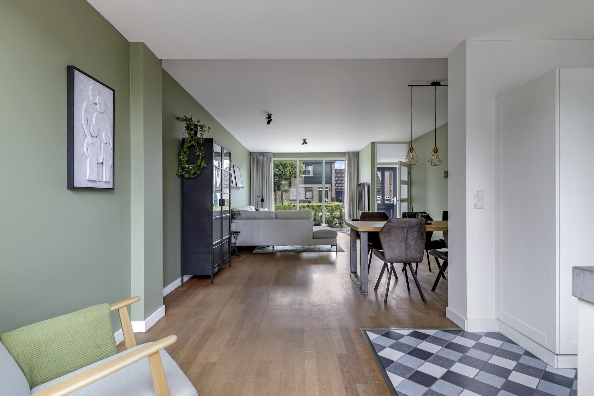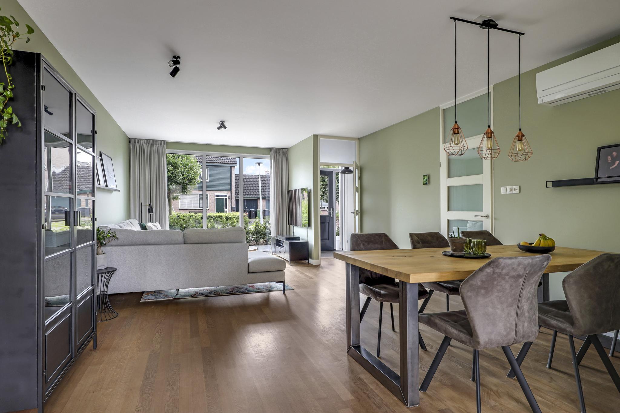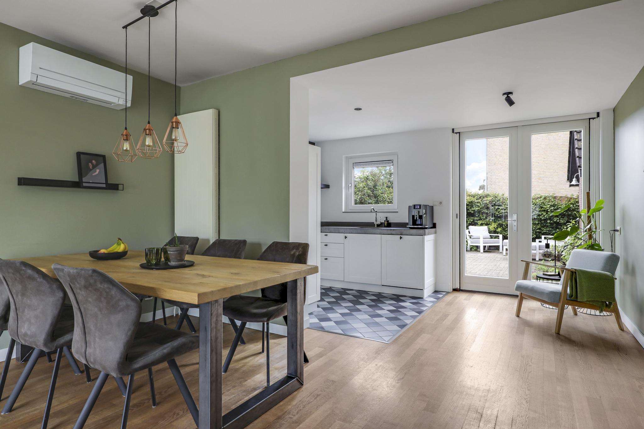 De woonkamer heeft een ruimtelijke indeling. Doordat de woonkamer 4,5 meter breed is en de keuken in de aanbouw een plek heeft gekregen, zijn er volop inrichtingsmogelijkheden voor een grote hoekbank en een mooie, ronde eettafel. De glaspui aan de voorzijde met rolluik, die doorloopt tot aan de vloer, zorgt voor enorm veel lichtinval wat het ruimtelijke gevoel versterkt. Een houten vloer zorgt daarbij voor een warme woonsfeer waarbij de radiator fraai in de vloer ‘verzonken’ is (een zogenoemde convectorput). Strakke stucwanden en plafond zorgen voor een verzorgde uitstraling waarbij je eenvoudig met een trendy kleur je eigen stempel op de woning kan drukken. In 2023 is er een airconditioning in de woonkamer geïnstalleerd die zowel kan koelen als verwarmen.