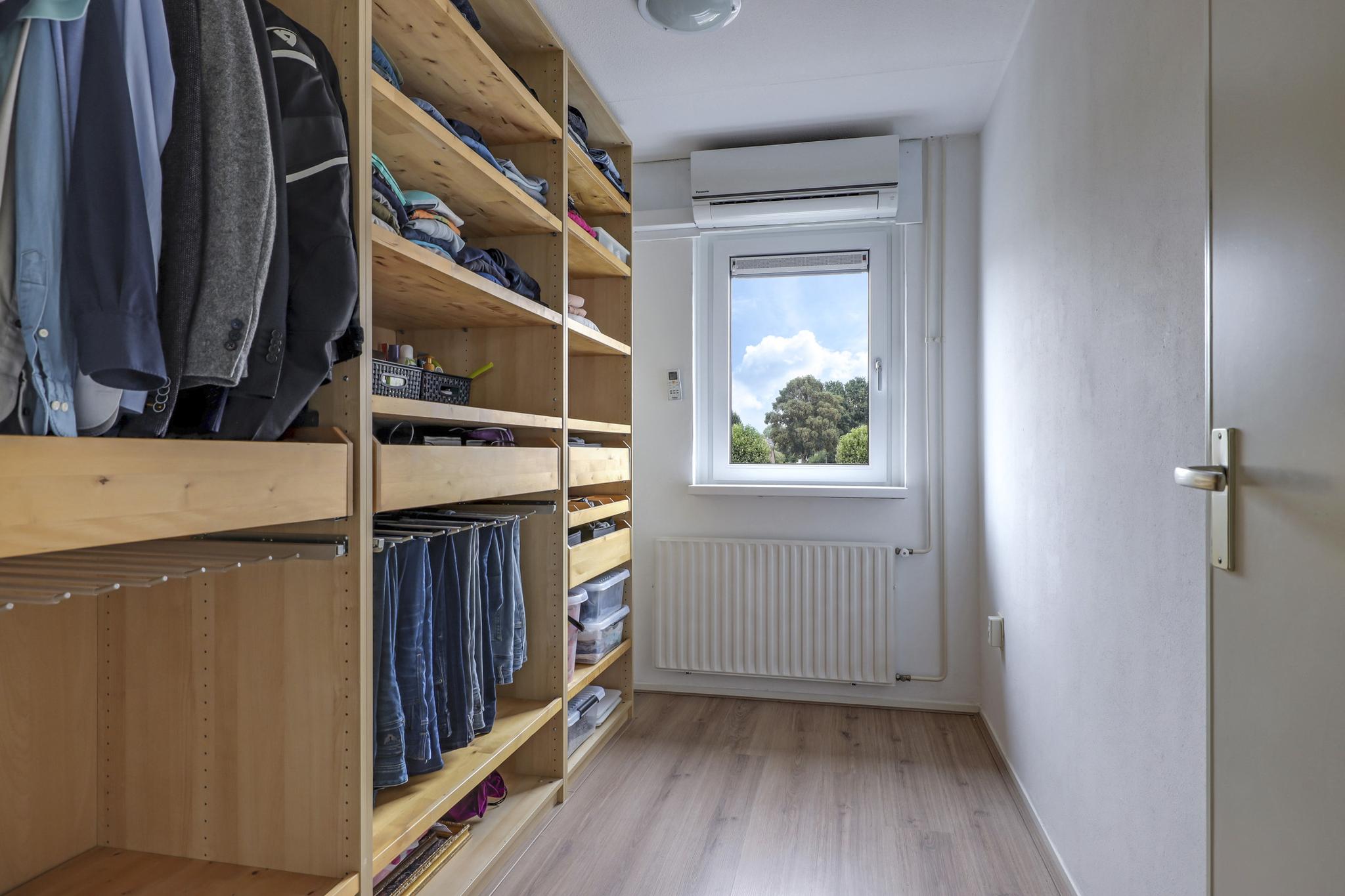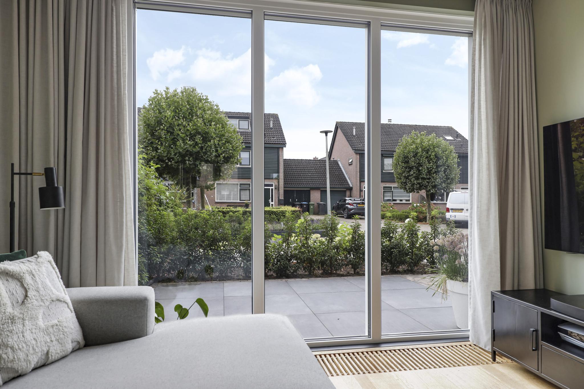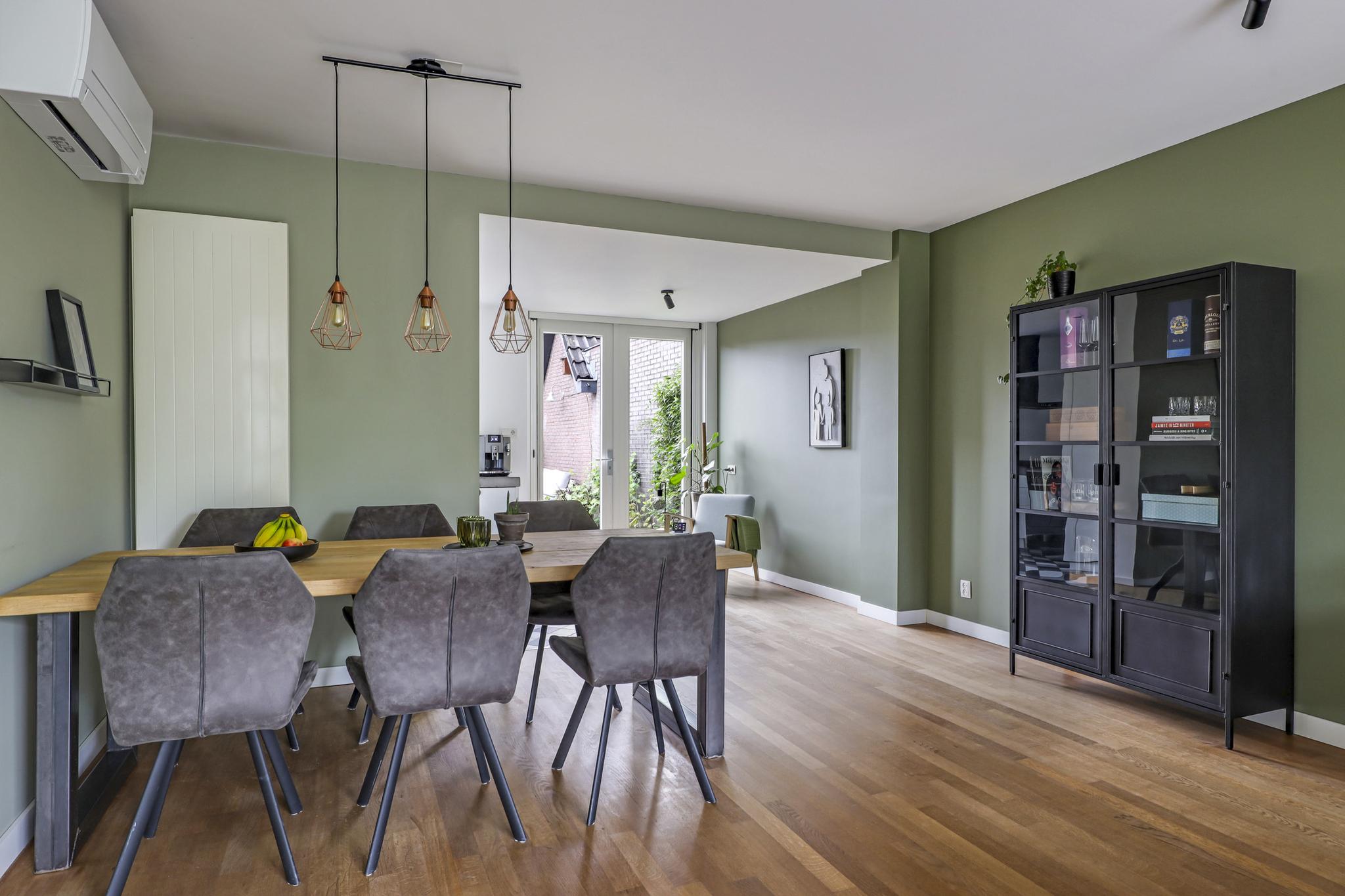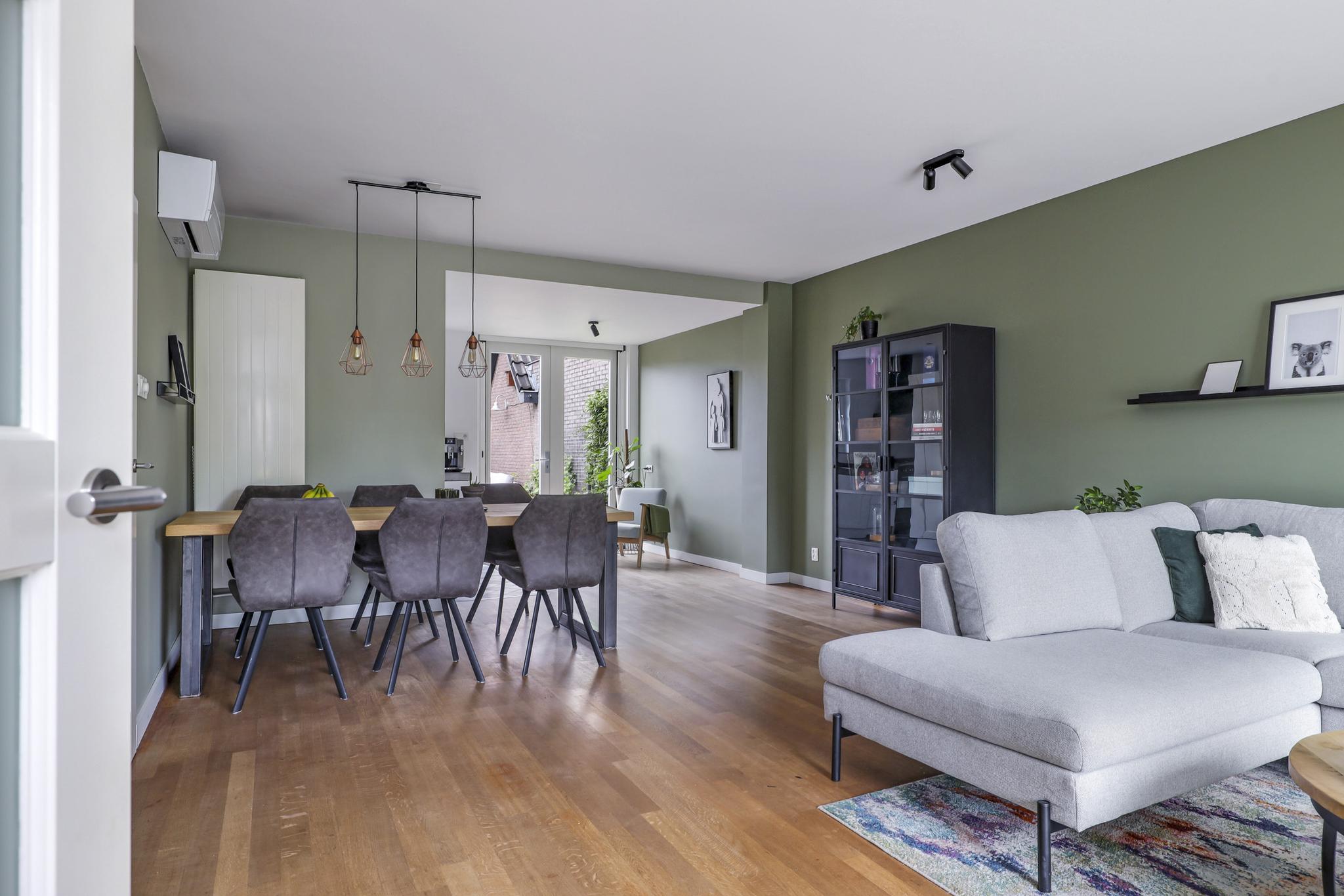 De woonkamer heeft een ruimtelijke indeling. Doordat de woonkamer 4,5 meter breed is en de keuken in de aanbouw een plek heeft gekregen, zijn er volop inrichtingsmogelijkheden voor een grote hoekbank en een mooie, ronde eettafel. De glaspui aan de voorzijde met rolluik, die doorloopt tot aan de vloer, zorgt voor enorm veel lichtinval wat het ruimtelijke gevoel versterkt. Een houten vloer zorgt daarbij voor een warme woonsfeer waarbij de radiator fraai in de vloer ‘verzonken’ is (een zogenoemde convectorput). Strakke stucwanden en plafond zorgen voor een verzorgde uitstraling waarbij je eenvoudig met een trendy kleur je eigen stempel op de woning kan drukken. In 2023 is er een airconditioning in de woonkamer geïnstalleerd die zowel kan koelen als verwarmen.