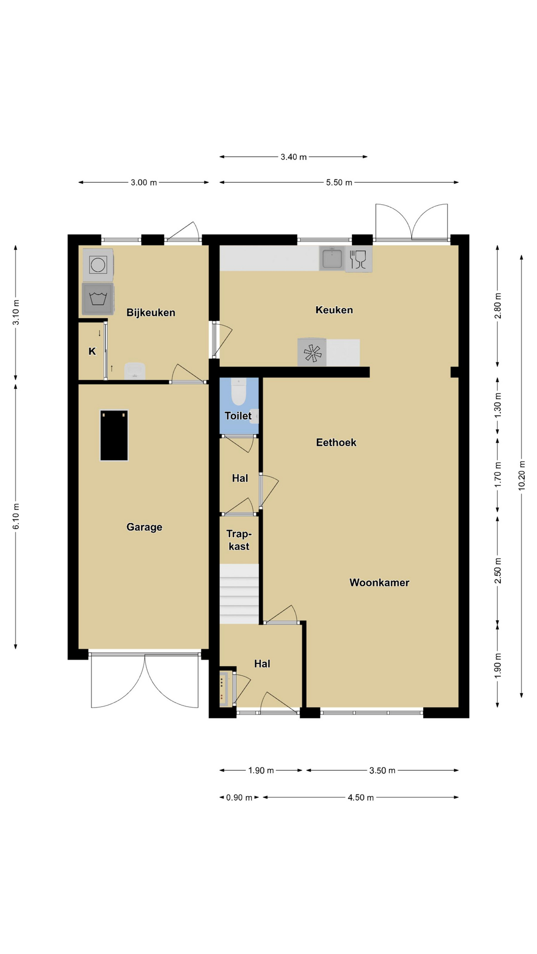 Vanuit de bijkeuken loop je de inpandige garage in. Met een lengte van meer dan 6 meter en een inpandige breedtemaat van minimaal 3 meter is deze zeer volwaardig te noemen. Hier kun je met gemak meerdere (elektrische) fietsen en/of een motor kwijt. De garage is goed toegankelijk middels de dubbele (geïsoleerde) deuren naar de oprit.