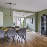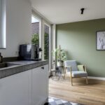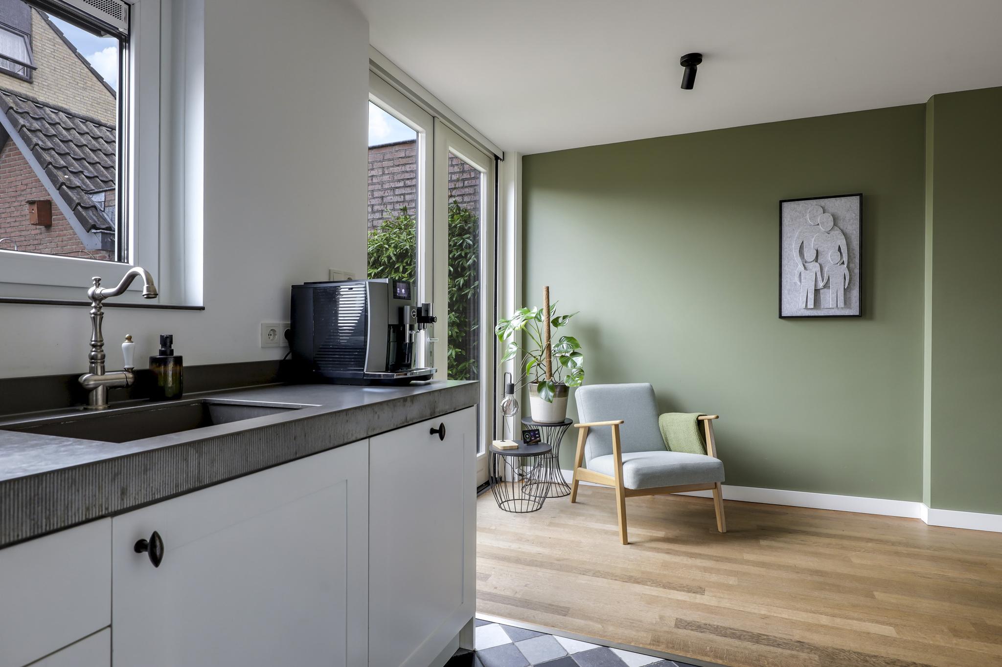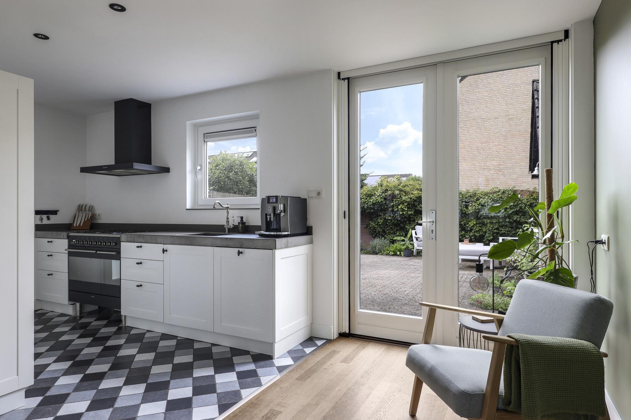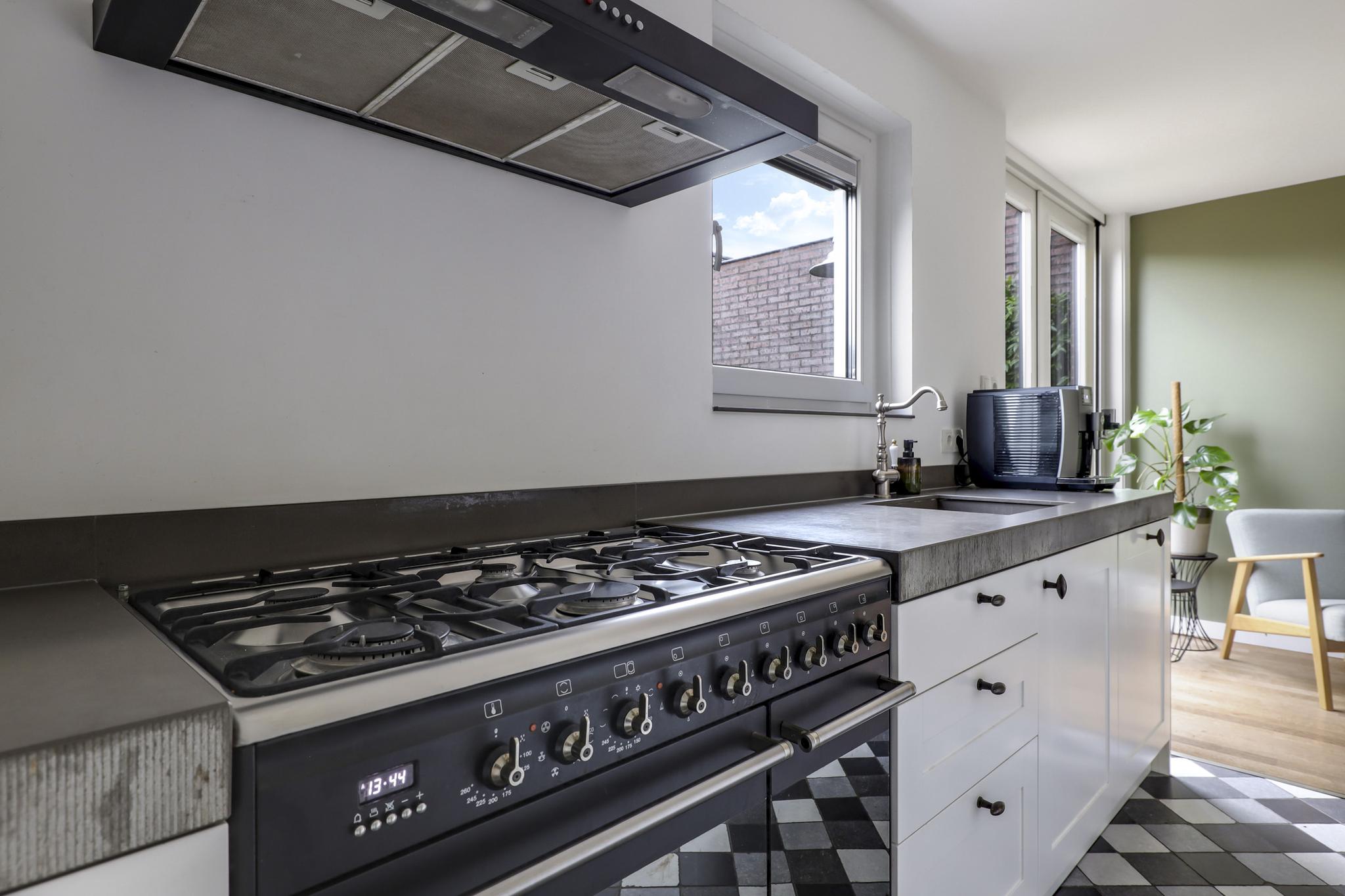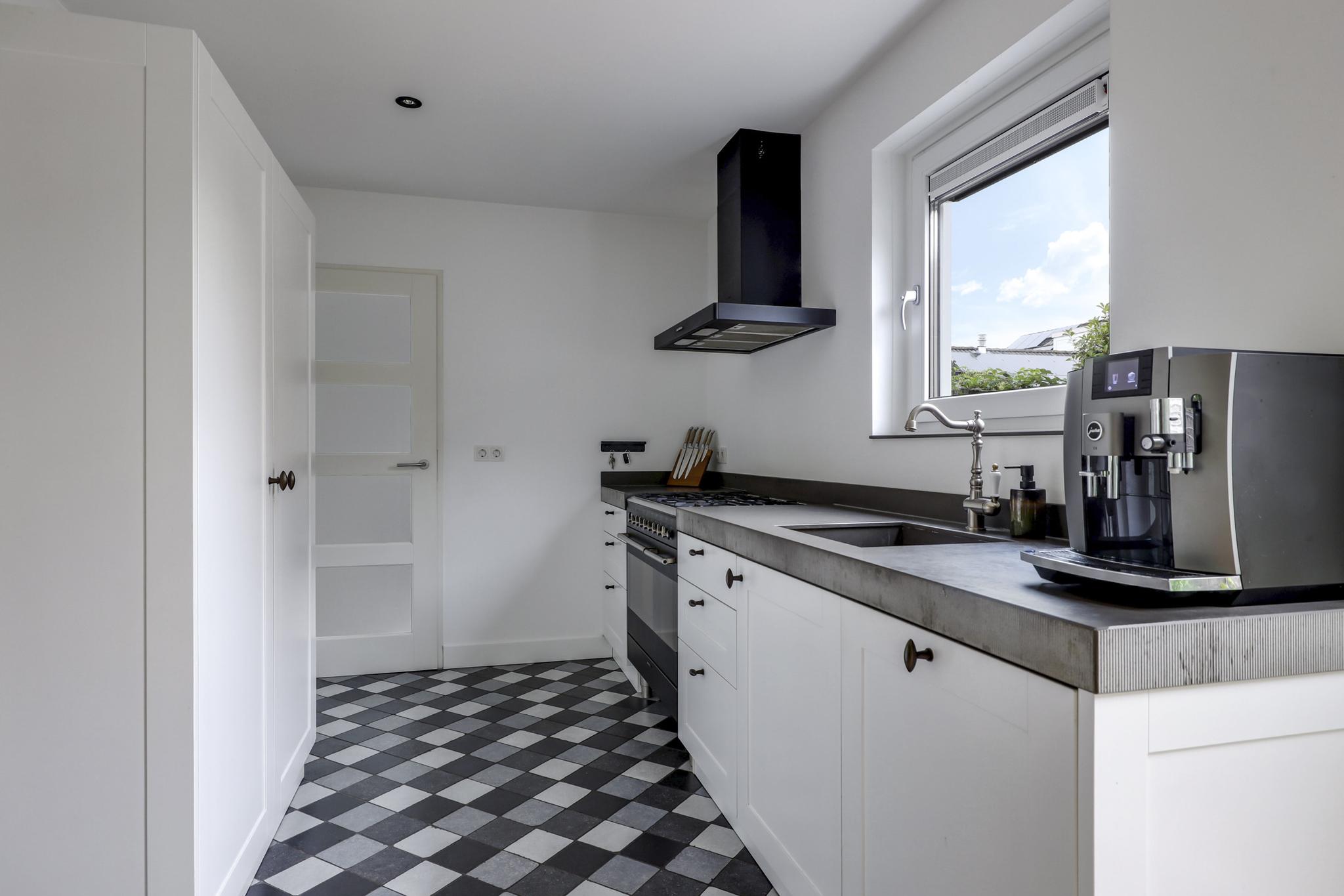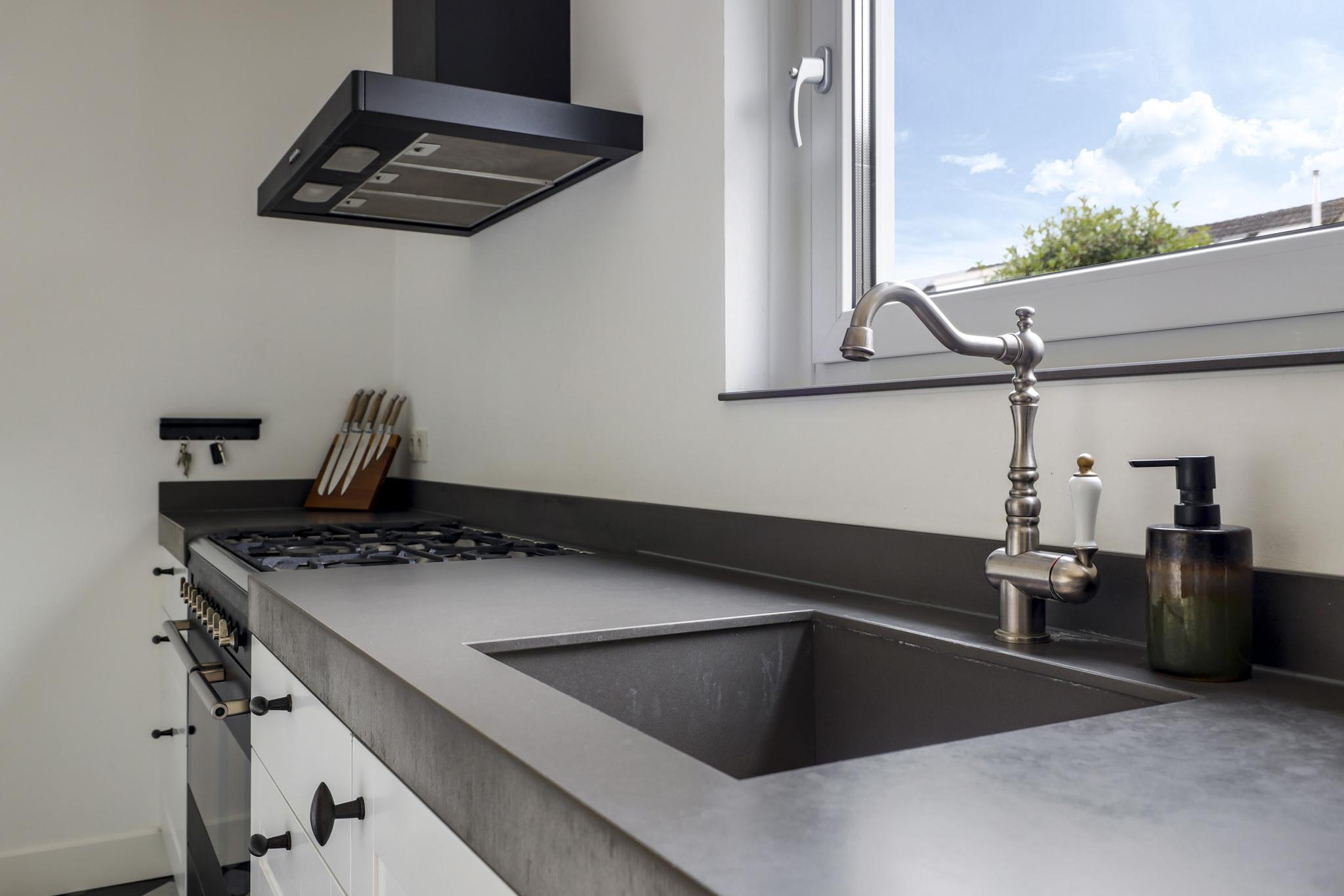 De woning is over de volle breedte 3 meter uitgebouwd hetgeen veel extra leefruimte heeft opgeleverd. Hier is dankbaar gebruik van gemaakt door er de keuken te plaatsen. Het heeft een open karakter naar de woonkamer zonder dat je vanaf de bank direct op het aanrechtblad kijkt.
