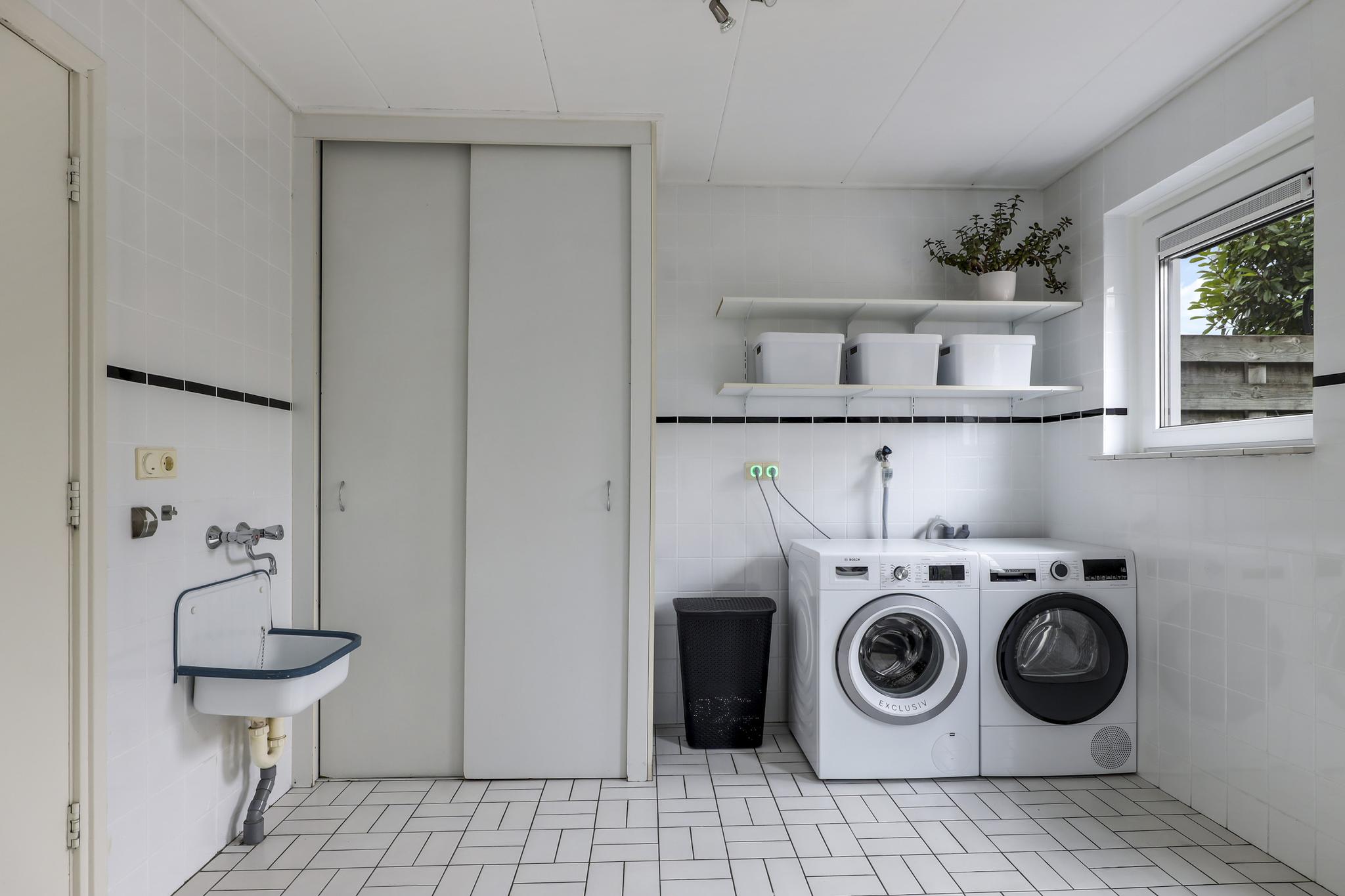 Vanuit de keuken is er een doorloop naar de naastgelegen bijkeuken. Deze is iets groter dan 9m2 en dat is best ruim voor een bijkeuken. Hier vindt je dan ook lekker de ruimte om enkele witgoedapparaten te plaatsen zoals een wasmachine, wasdroger en een vriezer. Er is een extra wastafel geplaatst en in de aanwezige vaste kast kun je de nodige voorraad en schoonmaakspullen kwijt. Een raam en een tuindeur zorgen voor een fijne lichtinval.