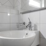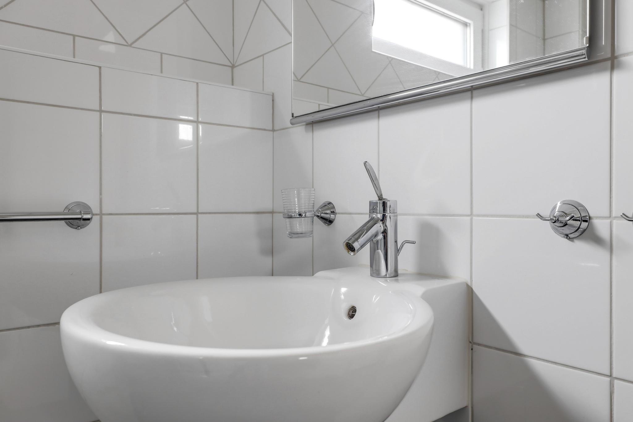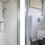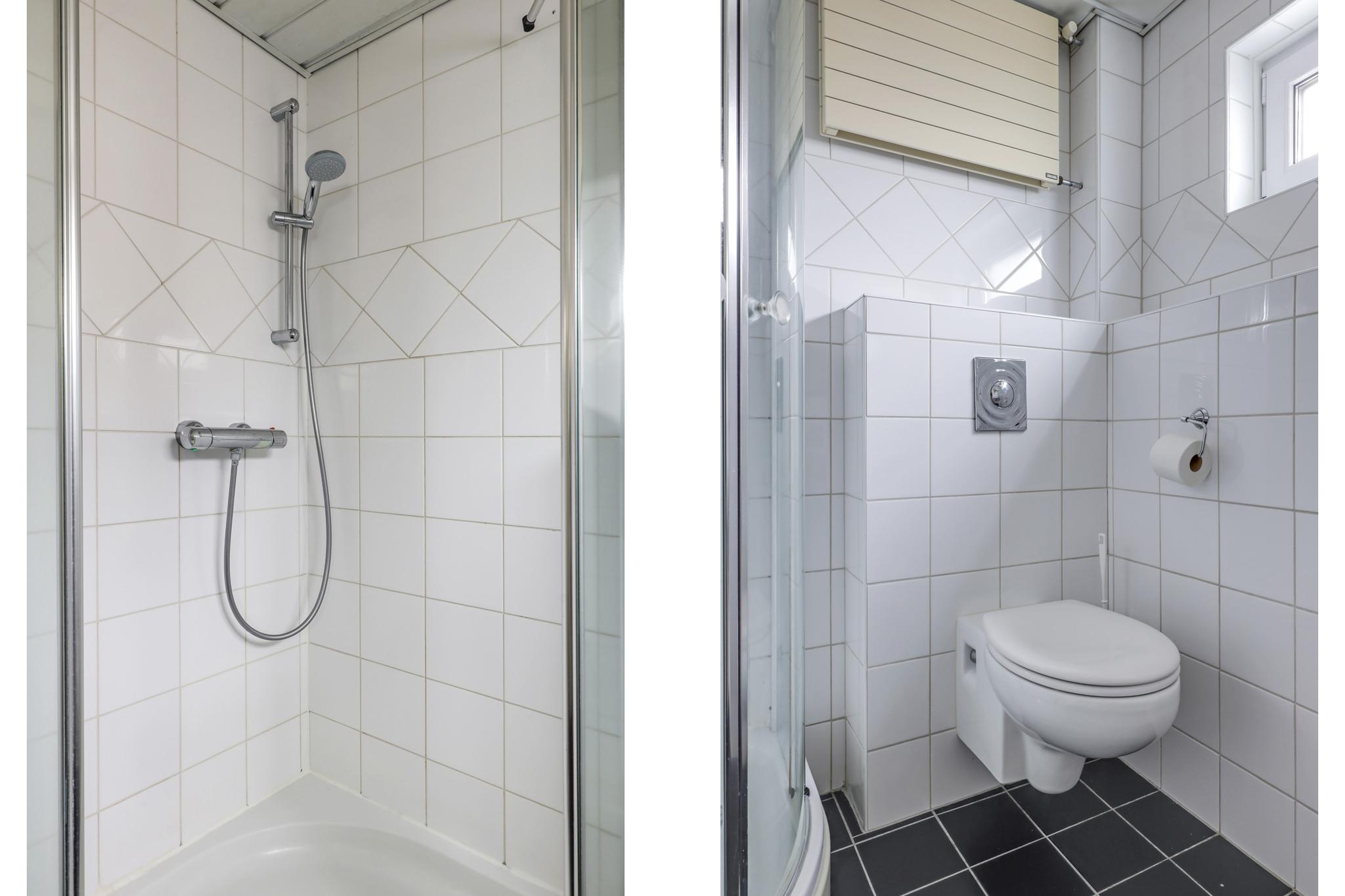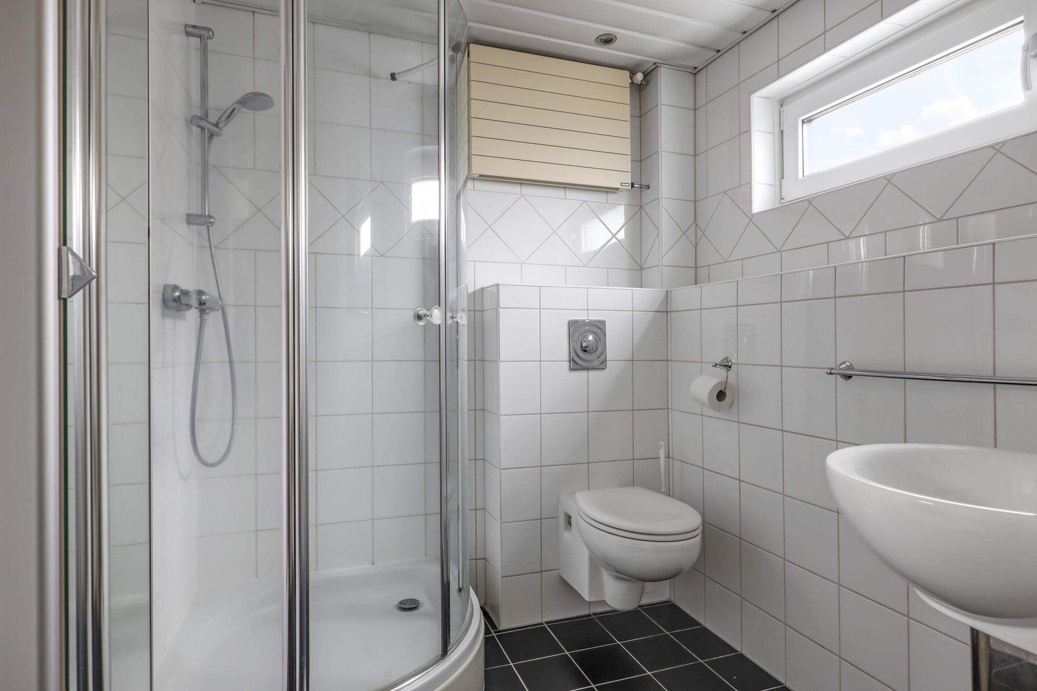De badkamer is degelijk afgewerkt en betegeld in neutrale zwart/witte kleurstellingen. De ruimte is ingedeeld met een douchecel, een wastafel met spiegel erboven en een 2e toilet. Deze is, net als het gastentoilet in de hal beneden, zwevend als een wandcloset uitgevoerd. Een kolomkastje naast de wastafel biedt de nodige opbergmogelijkheden voor toiletspullen. In het plafond zijn inbouwspots aangebracht en wat veel mensen prettig zullen vinden is het aanwezige raam die voor de nodige lichtinval zorgt. Ook dit betreft een draai/kiepraam waardoor de badkamer goed te ventileren is. Overigens is er ook afzuiging aanwezig.
