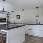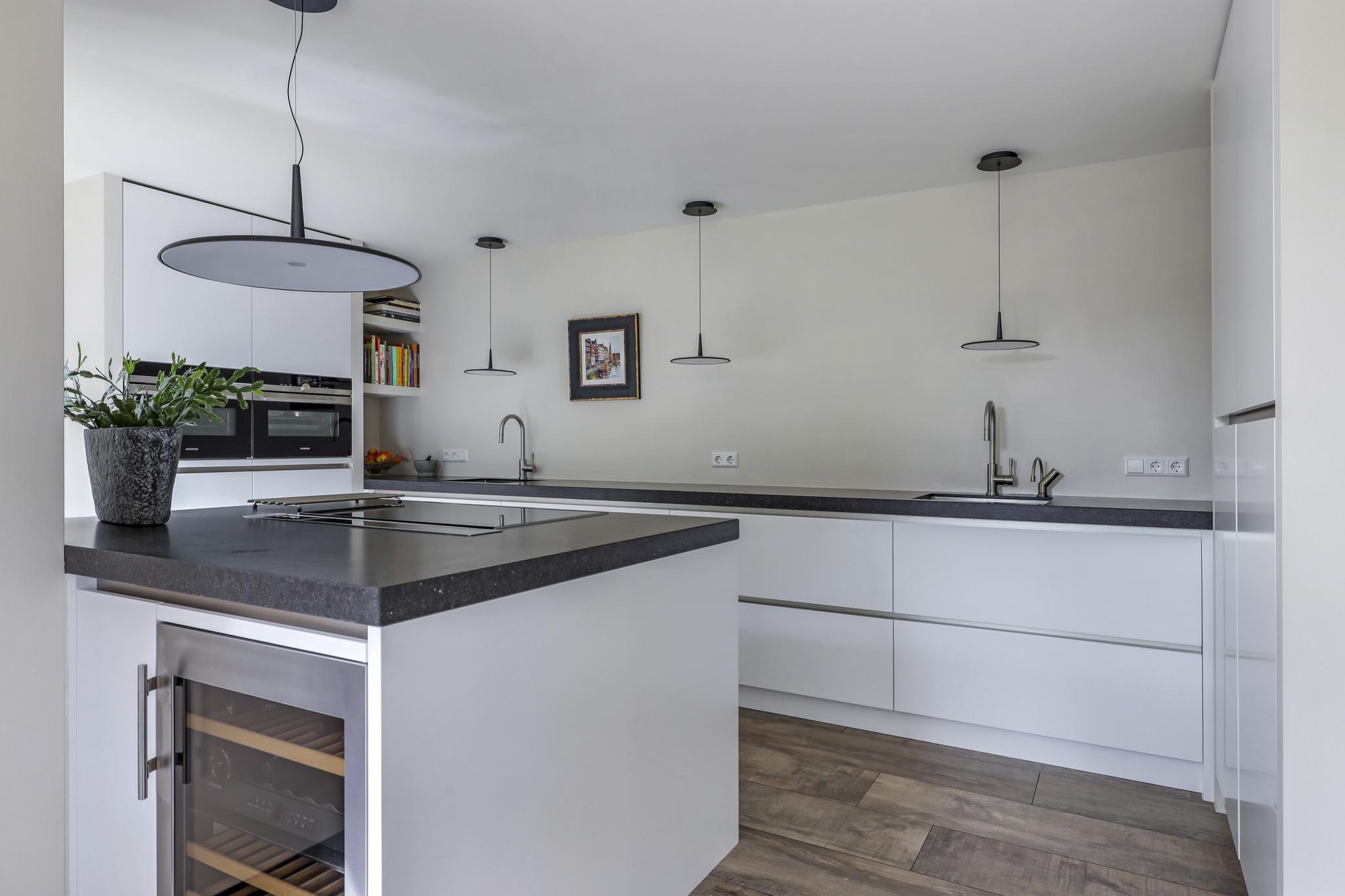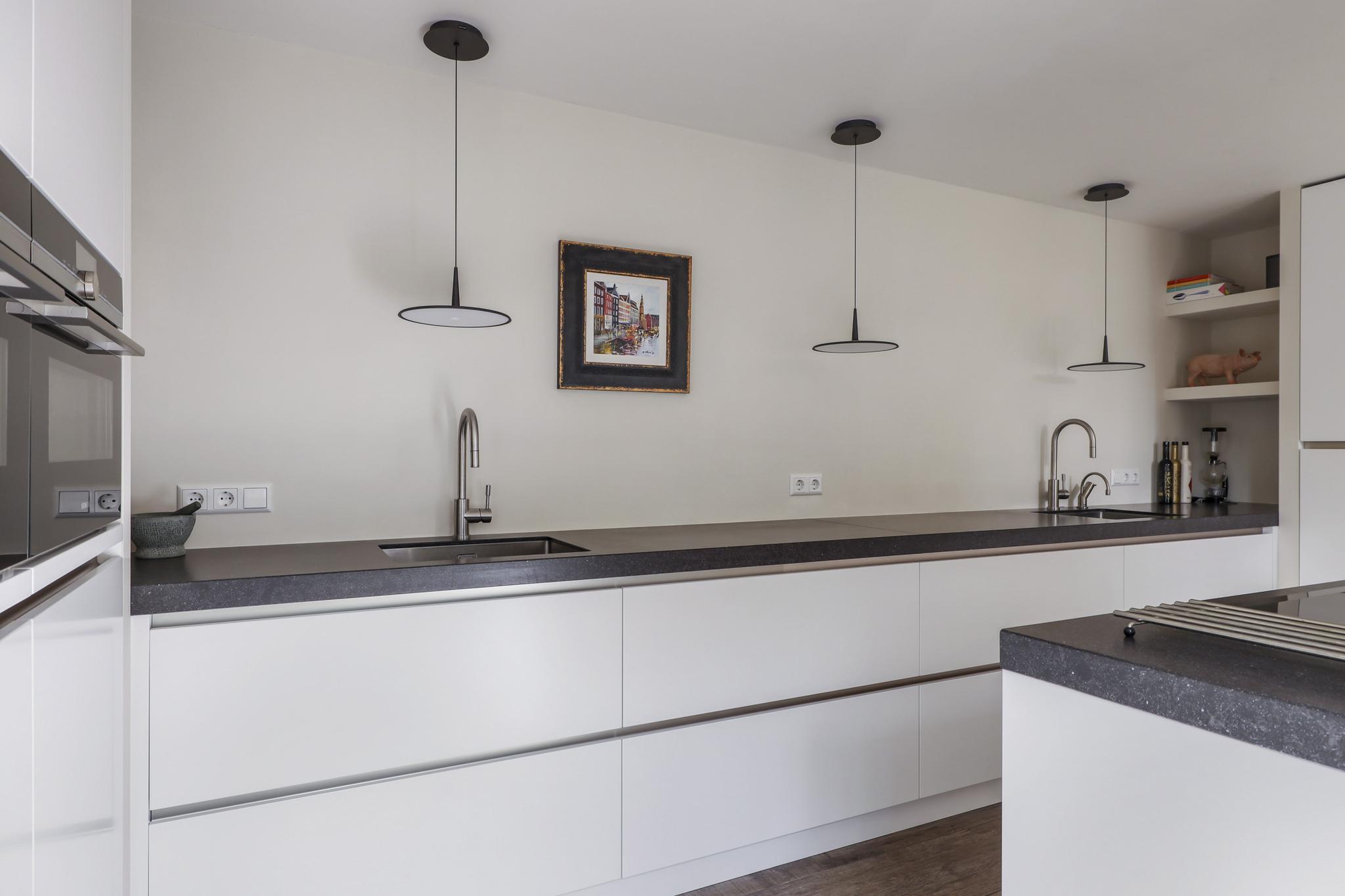 Een echte eye-catcher van deze woning is de keuken. Doordat de voormalige bijkeuken erbij is getrokken, is de keuken noemenswaardig vergroot en werd er ruimte gecreëerd voor een uitgebreide, maatwerk keukenopstelling met schiereiland. Het betreft een ‘Rhijnartkeuken’ die bekend staan om hun hoogwaardige kwaliteit en weten hoe ze het speciaals moeten maken. Hier is er gekozen voor een U-opstelling waarbij het aanrechtblad maar liefst 5,3 (!) meter lang is en aan weerzijden hoge kastenwanden zijn geplaatst (symmetrisch). De opstelling wordt compleet gemaakt met een schiereiland die eveneens is voorzien van een werkblad van composiet.