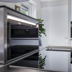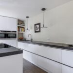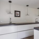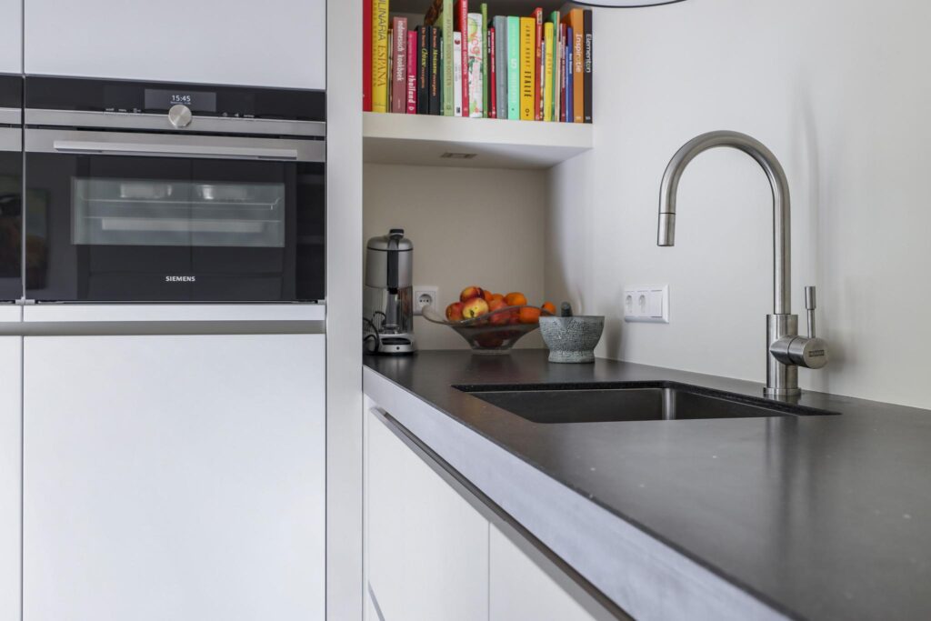 Deze keuken is voorzien van mooie inbouwapparaten van het merk Siemens zoals een brede, inductie kookplaat met flexzones met erachter een afzuigunit die vanuit het aanrechtblad omhoog komt, een vaatwasser, een koelkast, een heteluchtoven en een 2e oven maar dan met stoomfunctie. Ook is er een klimaatkast (wijnkoeler) ingebouwd waarin je bijvoorbeeld wijn op temperatuur kunt houden. Opvallend zijn de 2 gootstenen die in het lange aanrechtblad zijn verwerkt waarvan er 1 is voorzien van een Quooker (kokend waterkraan). In de nisjes boven het aanrecht zijn schappen aangebracht waar je speels mee om kunt gaan door er bijvoorbeeld kookboeken neer te leggen. Hetzelfde geldt voor de lichtpunten aan het plafond waardoor je de mogelijkheid hebt om naar eigen wens enkele hanglampen op te hangen. Kortom, hier is ‘out-of-the-box’ gedacht en dat maakt deze keuken exclusief en bijzonder.