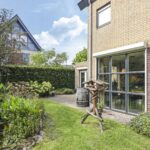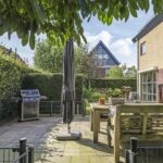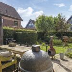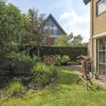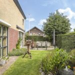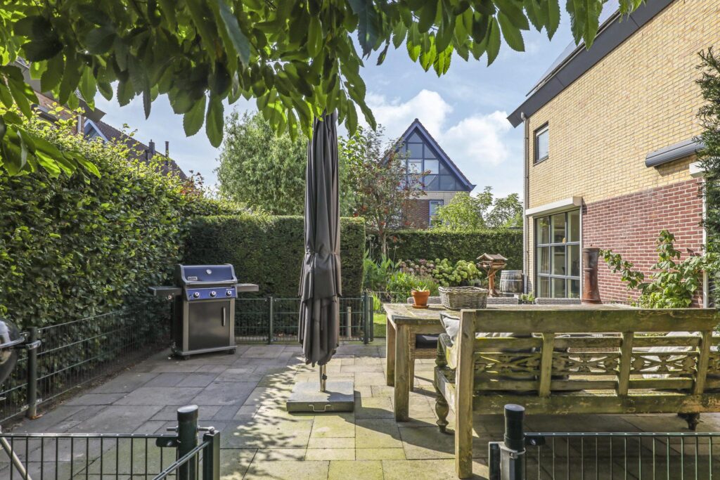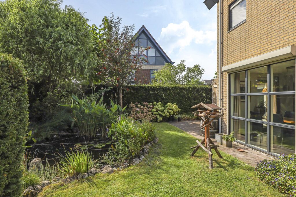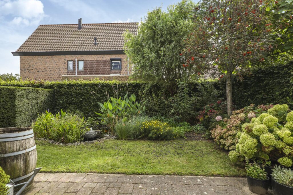 De woning staat op een mooi perceel van bijna 400m2. De woning is daarbij gunstig op het perceel geplaatst waardoor de meeste tuin zich aan de zonnige zuidkant bevindt. De tuin is verzorgd aangelegd met 2 terrassen waarbij beukenhagen, een gazon, hortensias en enkele bomen voor een groen karakter en de nodige privacy zorgen. De terrassen bieden maximaal aantal zonuren hetgeen al snel uitnodigt voor een barbecue met familie of vrienden. Om op een warme zomerdag toch enigszins uit de zon te kunnen zitten, is er zonwering aanwezig. Eén terras is ‘omheind’ met een laag hekwerk, hetgeen eenvoudig te verwijderen is. Om de tuin ook in de zomer groen te houden, is er een beregeningsinstallatie in de tuin aangelegd.