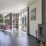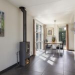 Woonkamer (L-indeling) met dubbele terrasdeuren en een houtkachel