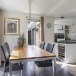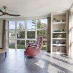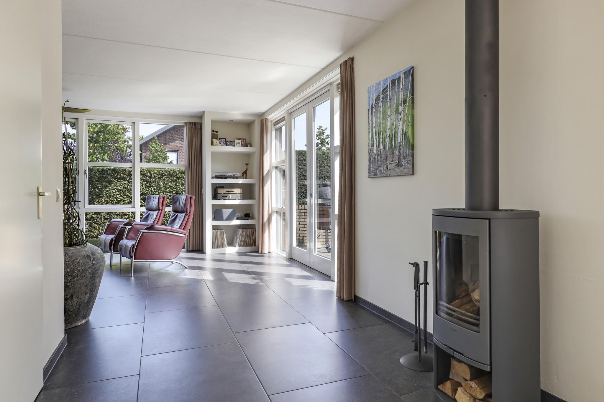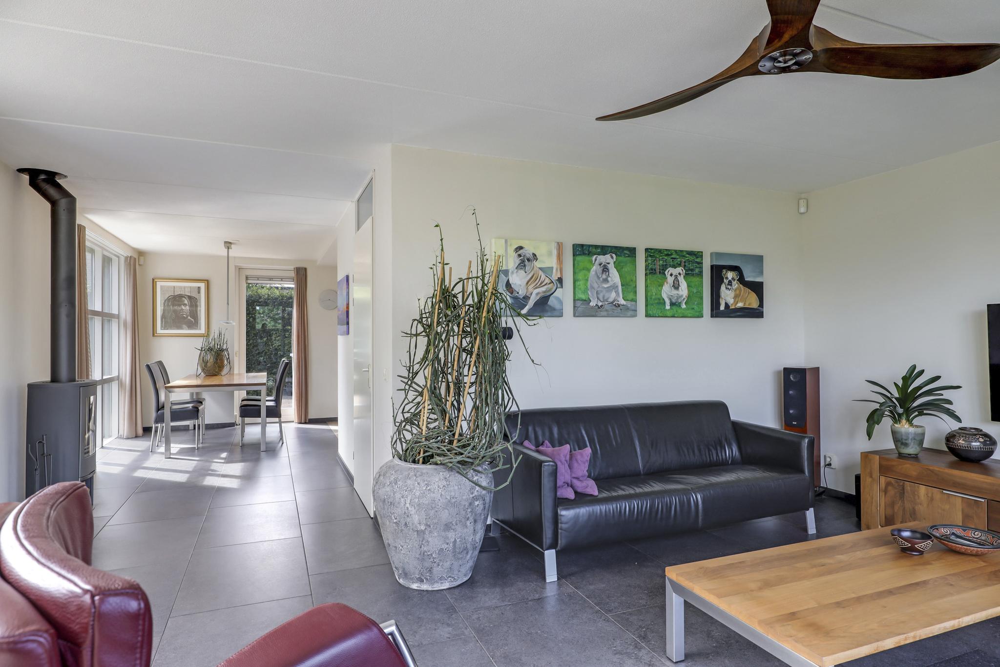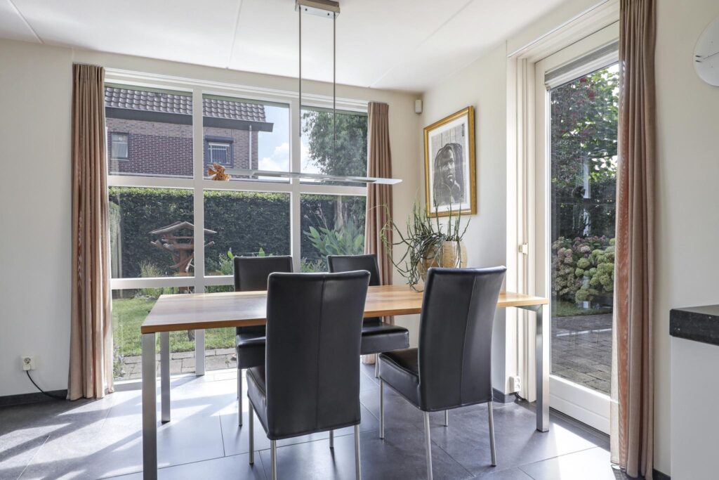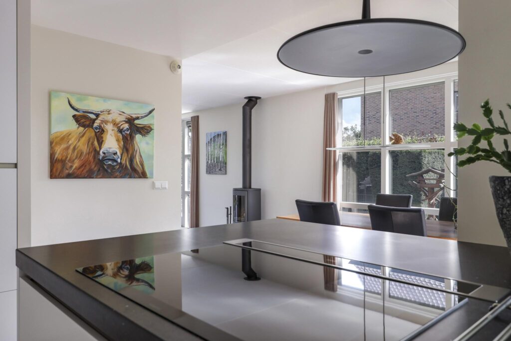 De woonkamer is aan de voorzijde gelegen (zithoek) en loopt door naar de keuken aan de achterzijde waar je een zithoek kwijt kunt. Grote raampartijen met speelse vakverdeling tot aan de vloer zorgen voor veel lichtinval en een ruimtelijke beleving. De zithoek is goed bemeten waardoor je er prima een lekkere hoekbank kwijt kunt. Ook is er een lange muur waar je een grote TV kunt ophangen. Aan de andere zijde is er een gezellige houtkachel geplaatst (2022). Leuk detail is de ‘ingestucte’ nis met schappen waar je leuke accessoires in kwijt kunt. Dubbele tuindeuren in de zijgevel geven direct toegang tot het zonnige buitenterras waardoor je het buitenleven eenvoudig bij de woonkamer betrekt.