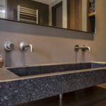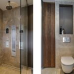 Erg fraai is het zwevende wastafelmeubel van composiet waarbij 2 kranen uit de gestucte wand komen. De grote spiegel erboven heeft dezelfde breedte gekregen. Hetgeen deze badkamer verder zo bijzonder maakt zijn de eikenhouten accenten die door een timmerman zijn vervaardigd zoals het lademeubel onder de zwevende wastafel en de kolomkast die naadloos is ingestuct. Inbouwspots, vloerverwarming, een designradiator en verschillende ingestucte nisjes maken deze badkamer compleet. En niet te vergeten het aanwezige raam die niet alleen voor daglicht zorgt, maar ook voor een prettige ventilatiemogelijkheid.