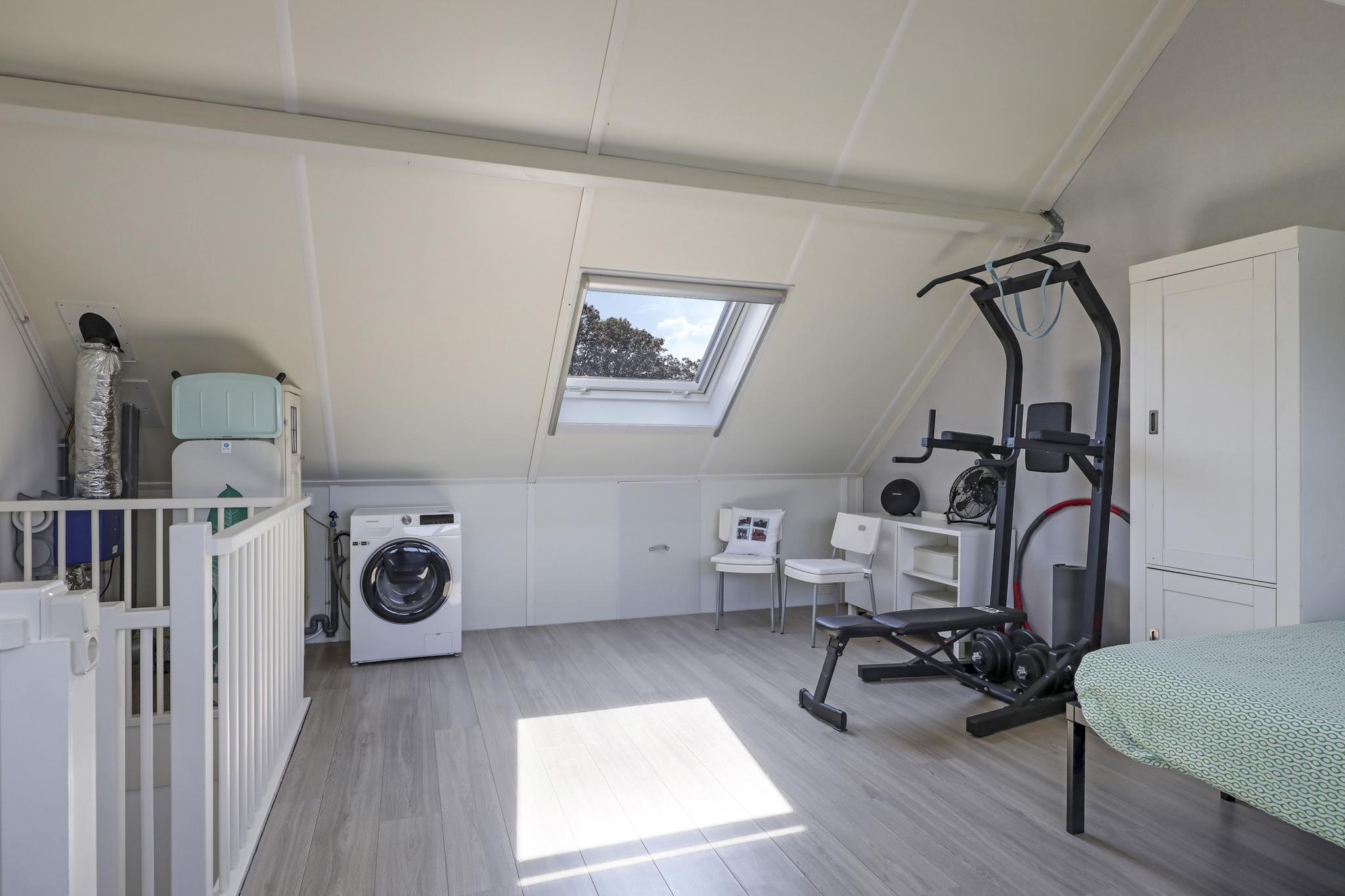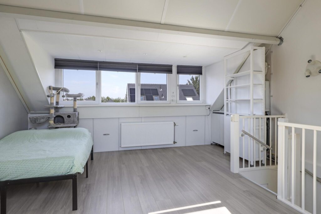 De grootste verrassing kom je op de bovenste woonlaag tegen. Wanneer je de trap oploopt naar de 2e verdieping, komt je een zee aan ruimte tegemoet. De combinatie van een hoge nok (3,3 meter), een maximaal brede dakkapel en een extra (groot) dakvenster, maakt deze verdieping tot een ‘balzaal’. Dit bied je behoorlijk veel perspectief om het naar eigen wens in te richten. Je kunt er een gym maken of de ruimte juist opdelen in 2 extra (slaap)kamers. Mocht je veel vanuit huis werken, kunnen we ons ook voorstellen dat het een heerlijke ruimte betreft voor een werkplek met groot bureau. Onder de schuine zijden zijn knieschotten aangebracht waar je de nodige (seizoen)spullen kunt opbergen. Een wasmachine en wasdroger kun je in de hoek kwijt waar de aansluitingen zijn voorzien. In de andere hoek zijn de cv-ketel en de mechanische ventilatie geïnstalleerd.