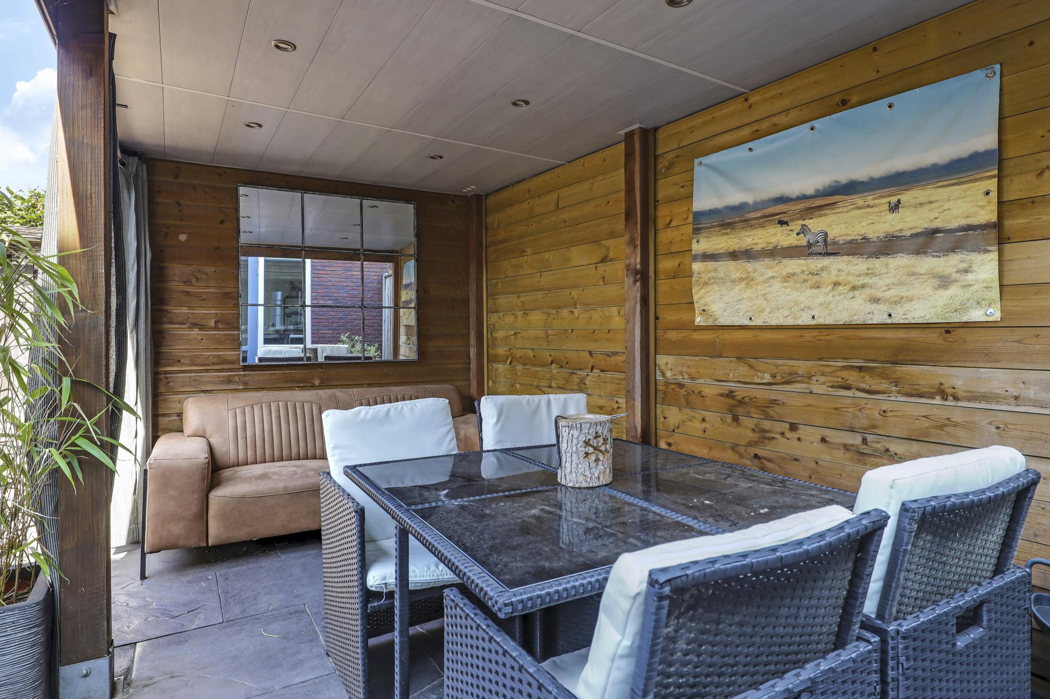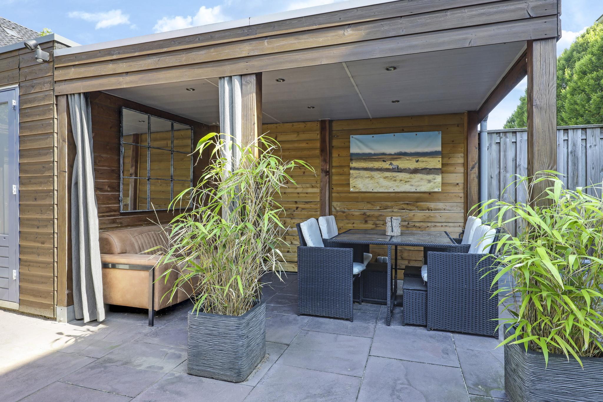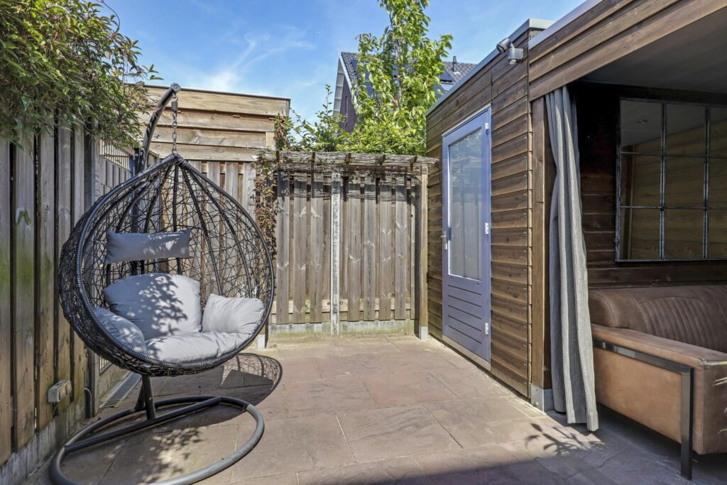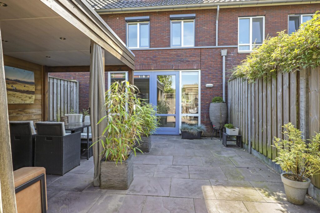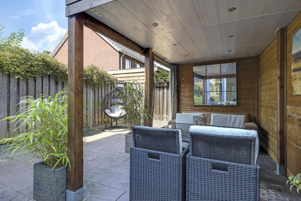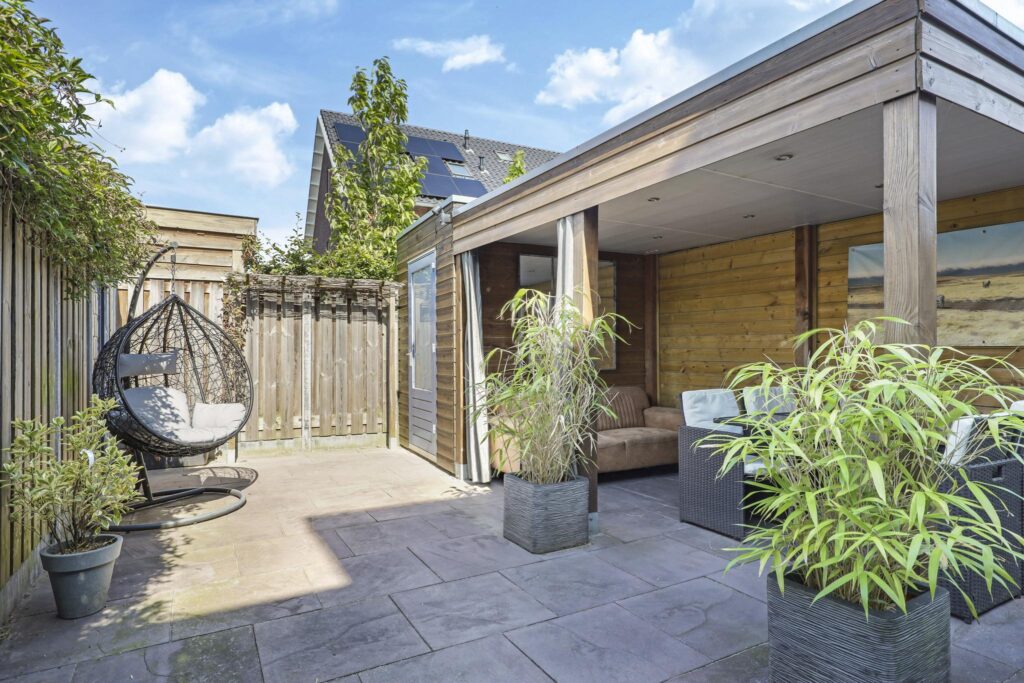 De achtertuin biedt een heerlijke buitenruimte waar je relatief veel privacy geniet. Er is maar weinig tot geen inkijk wat je een vrij gevoel zal geven. Zeker wanneer je onder de veranda zit, zit je lekker beschut tegen de zon en wind. Stevige ‘gordijnen’ aan de zijkant maken het extra comfortabel. En wanneer het donker wordt, doe je de spotverlichting in het plafond lekker aan. Doordat de tuin geheel is bestraat en daardoor onderhoudsarm te noemen is, hou je juist tijd over om te genieten van het buitenleven. Achter de veranda vind je nog een schuur waar je meerdere fietsen en misschien wel een motor kunt stallen. De poort van de achterom is daarbij gunstig gelegen aangezien je geen draai hoeft te maken.