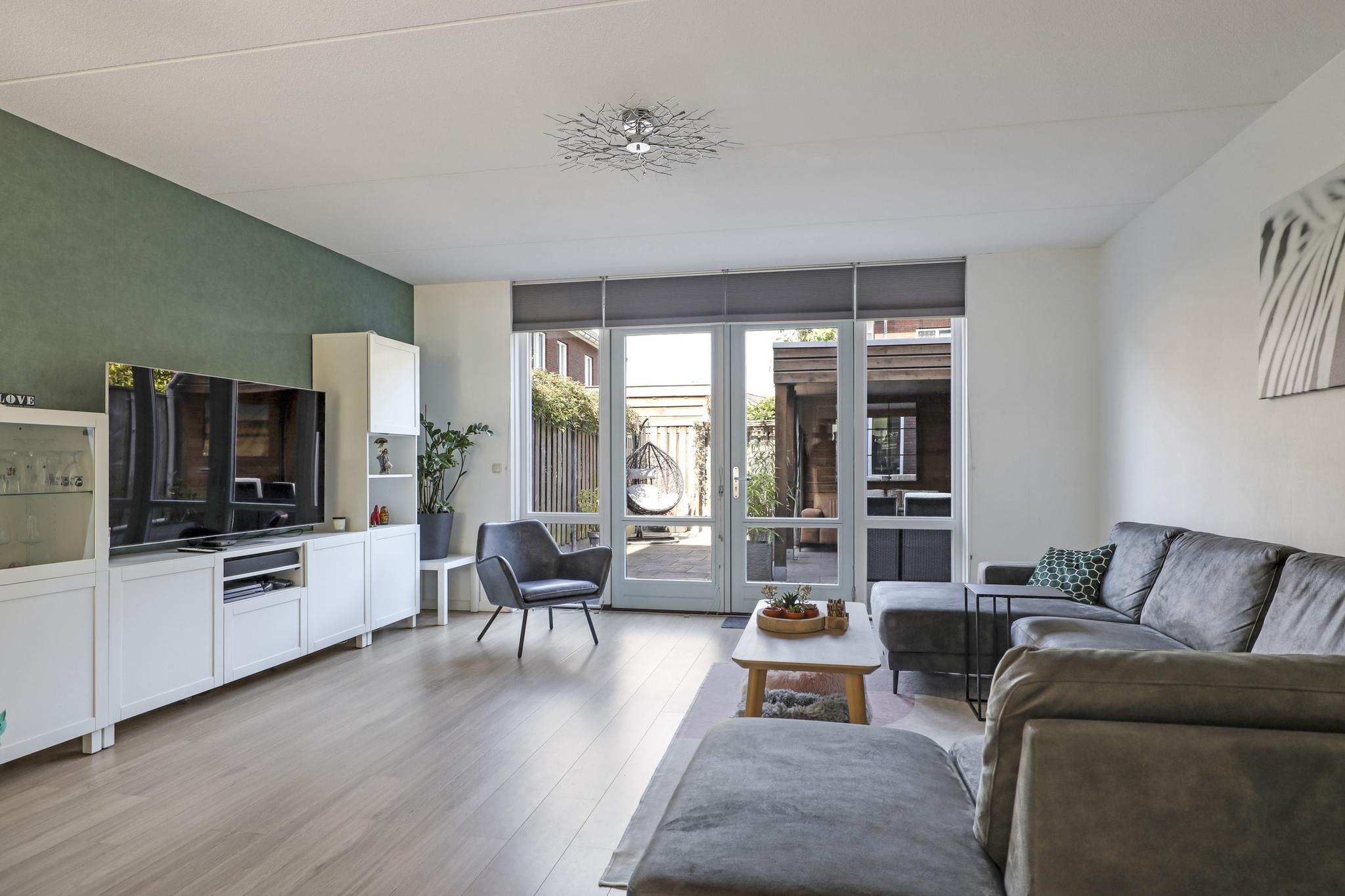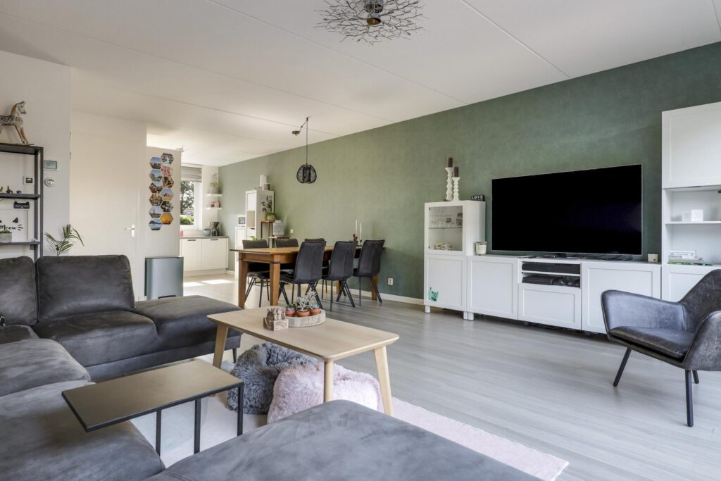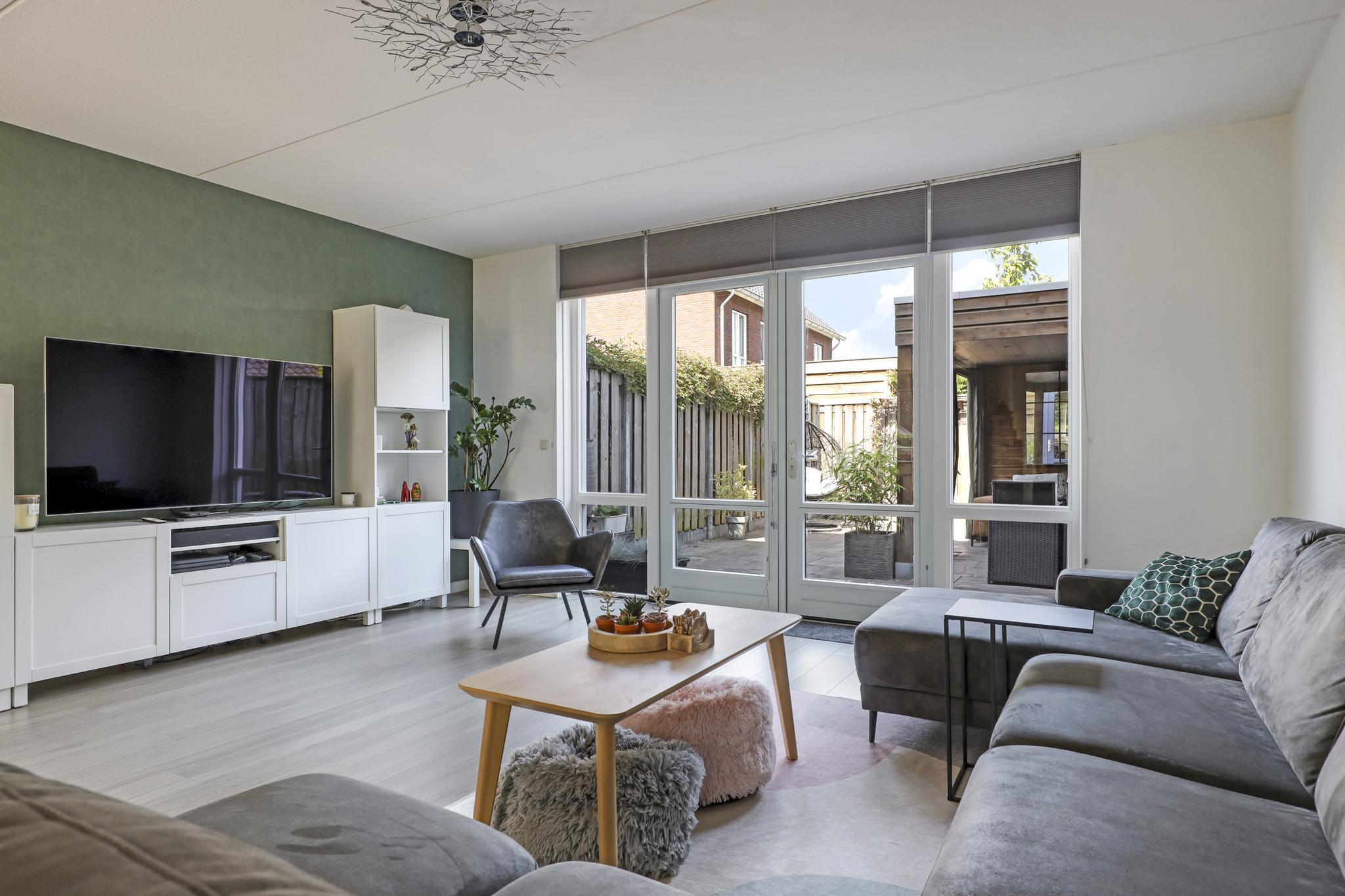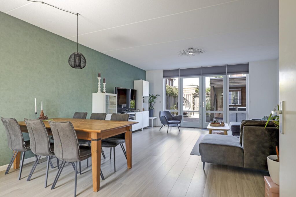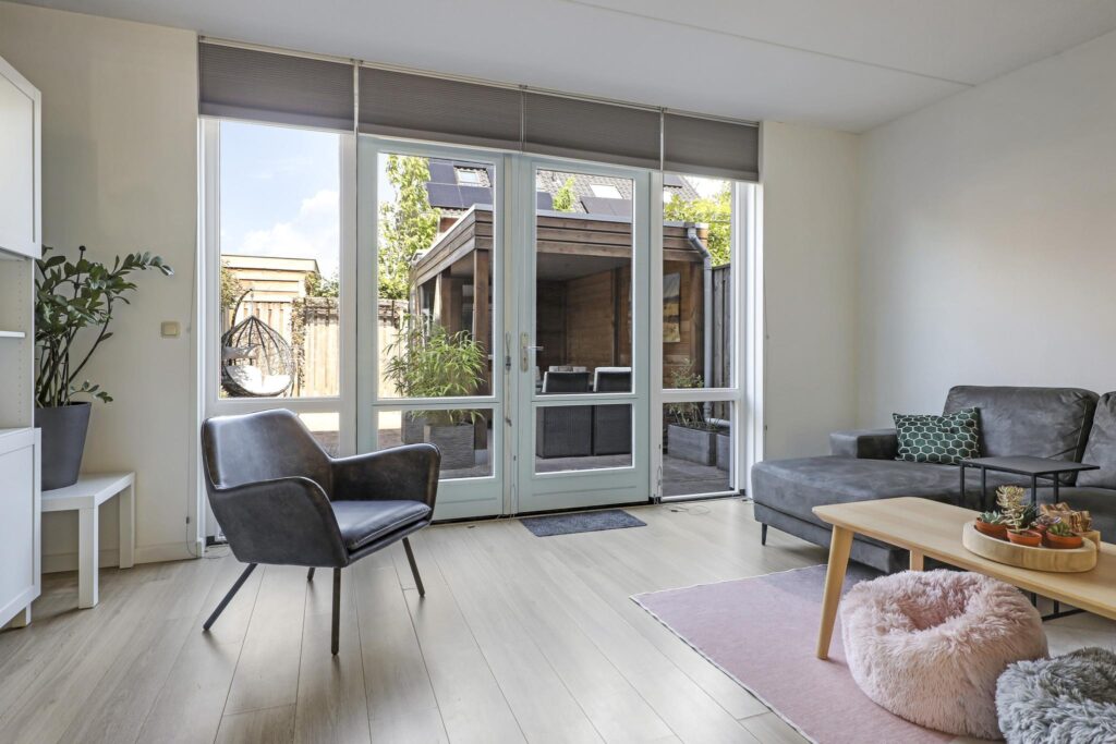 Uitgebouwde woonkamer met trap/voorraadkast en dubbele terrasdeuren