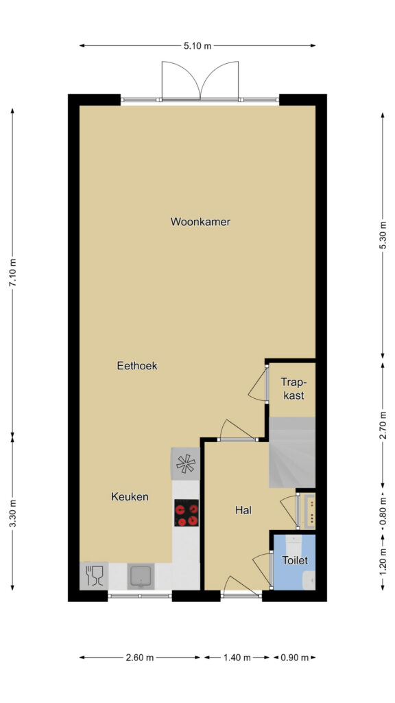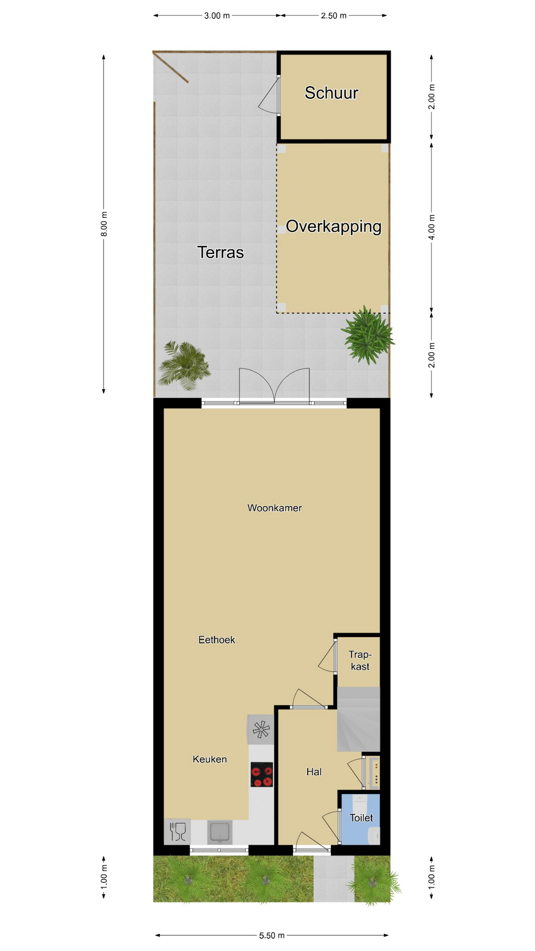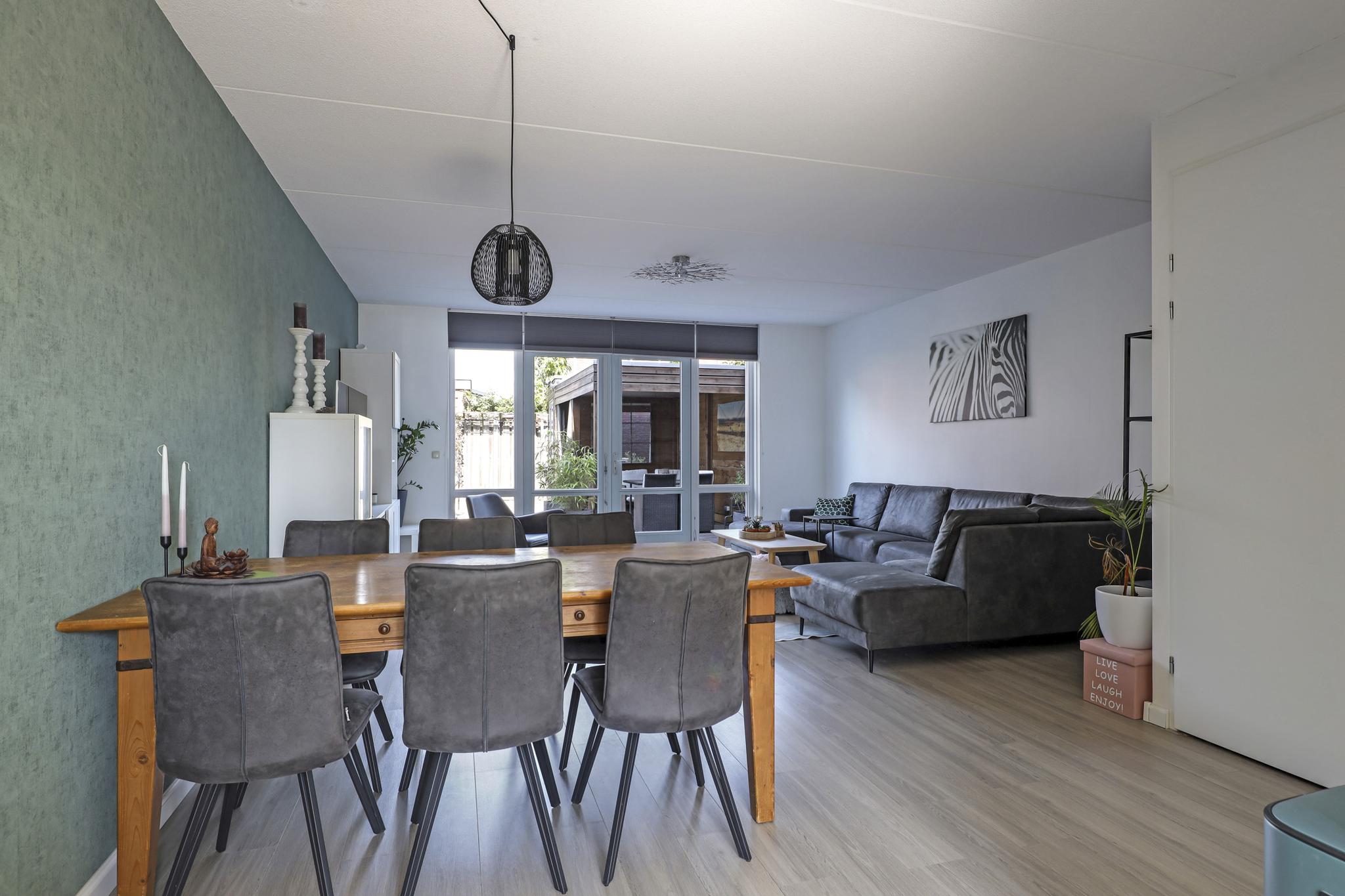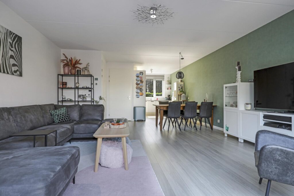 Uitgebouwde woonkamer met trap/voorraadkast en dubbele terrasdeuren