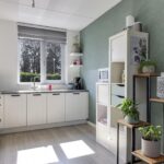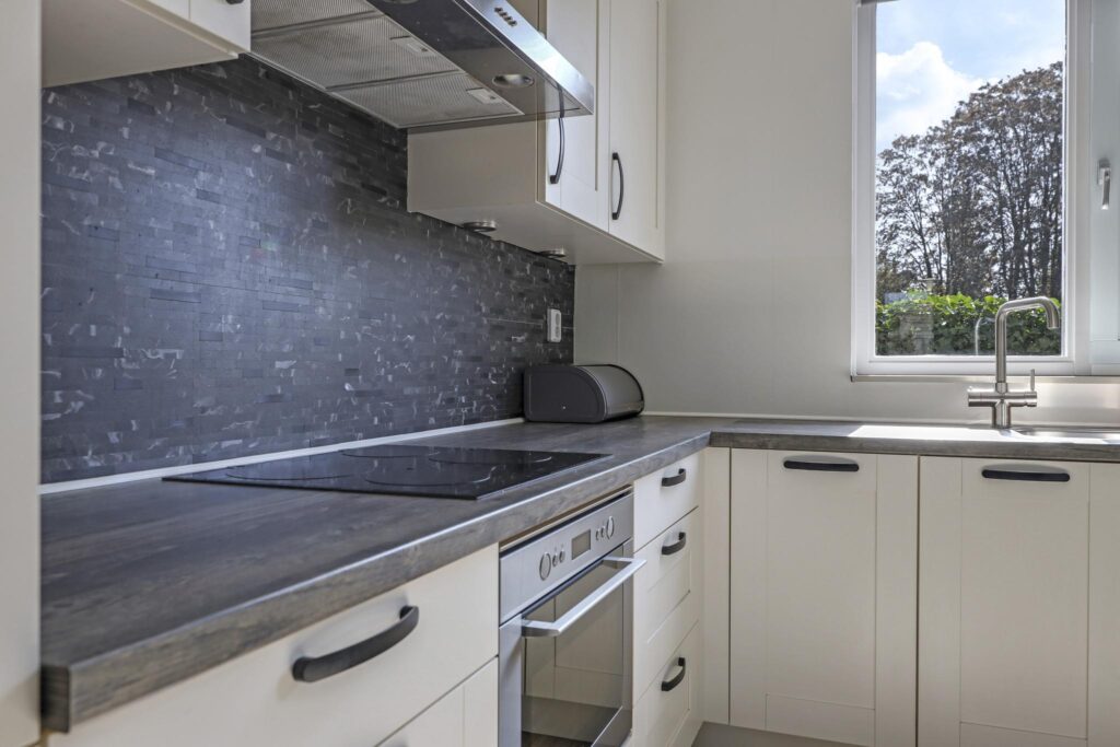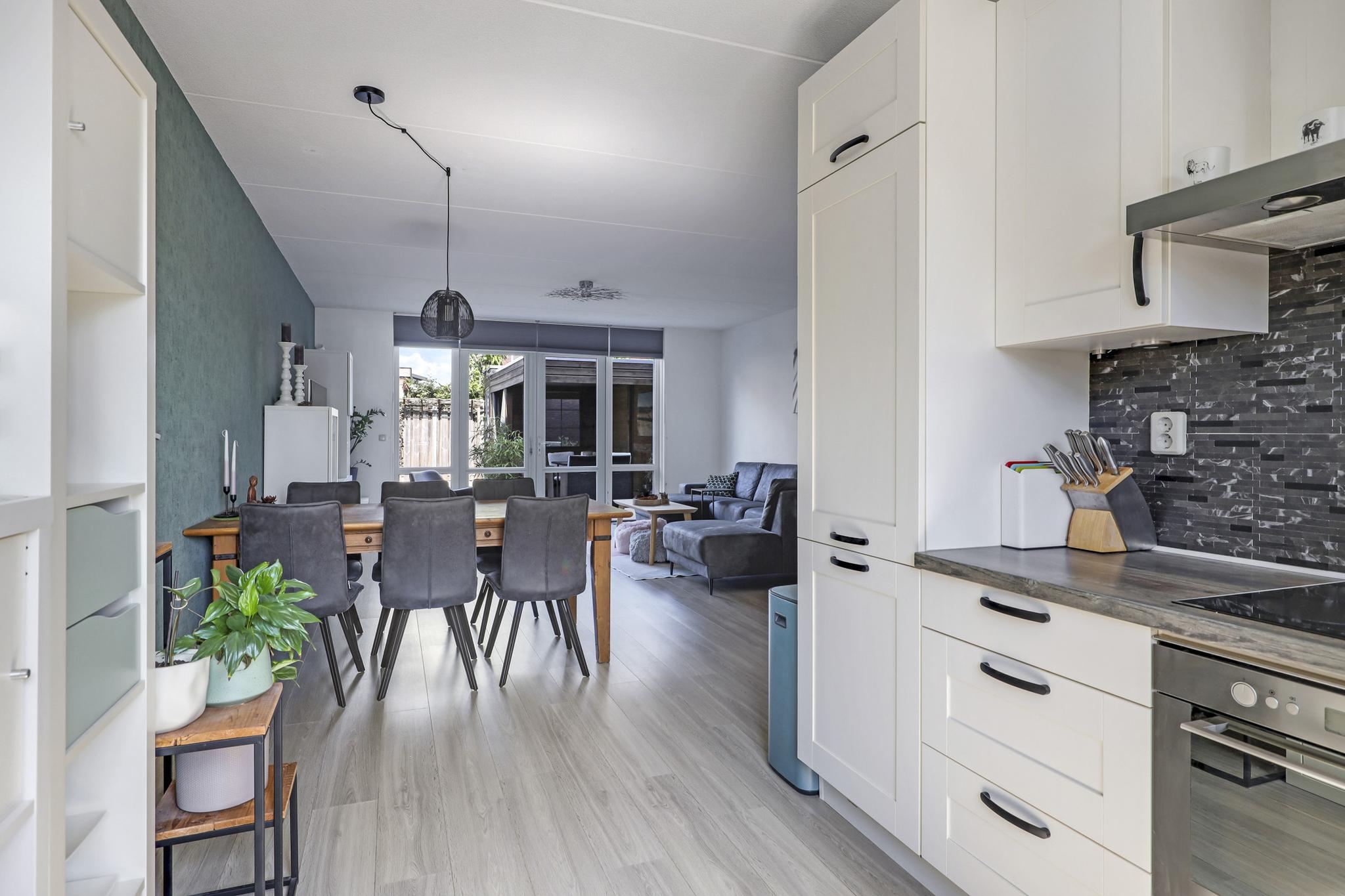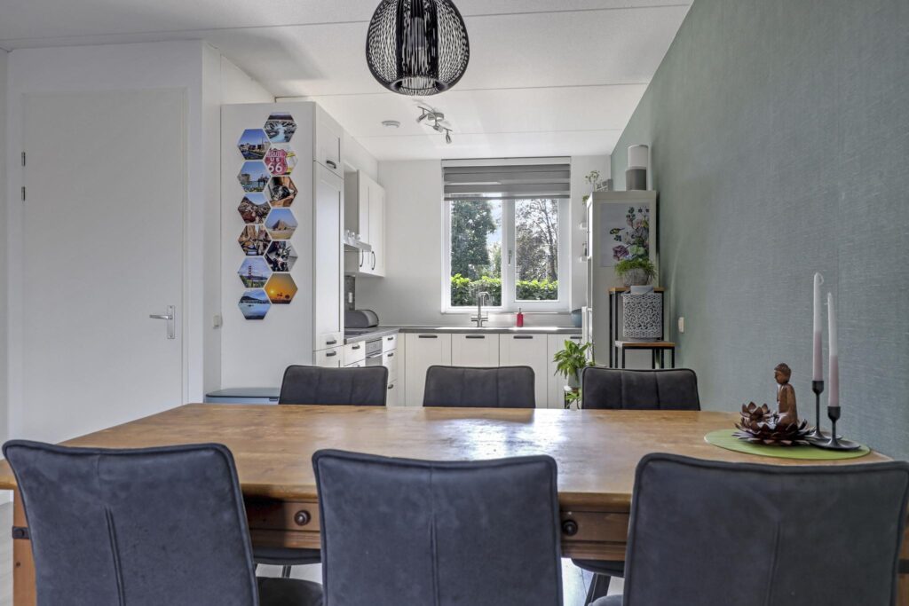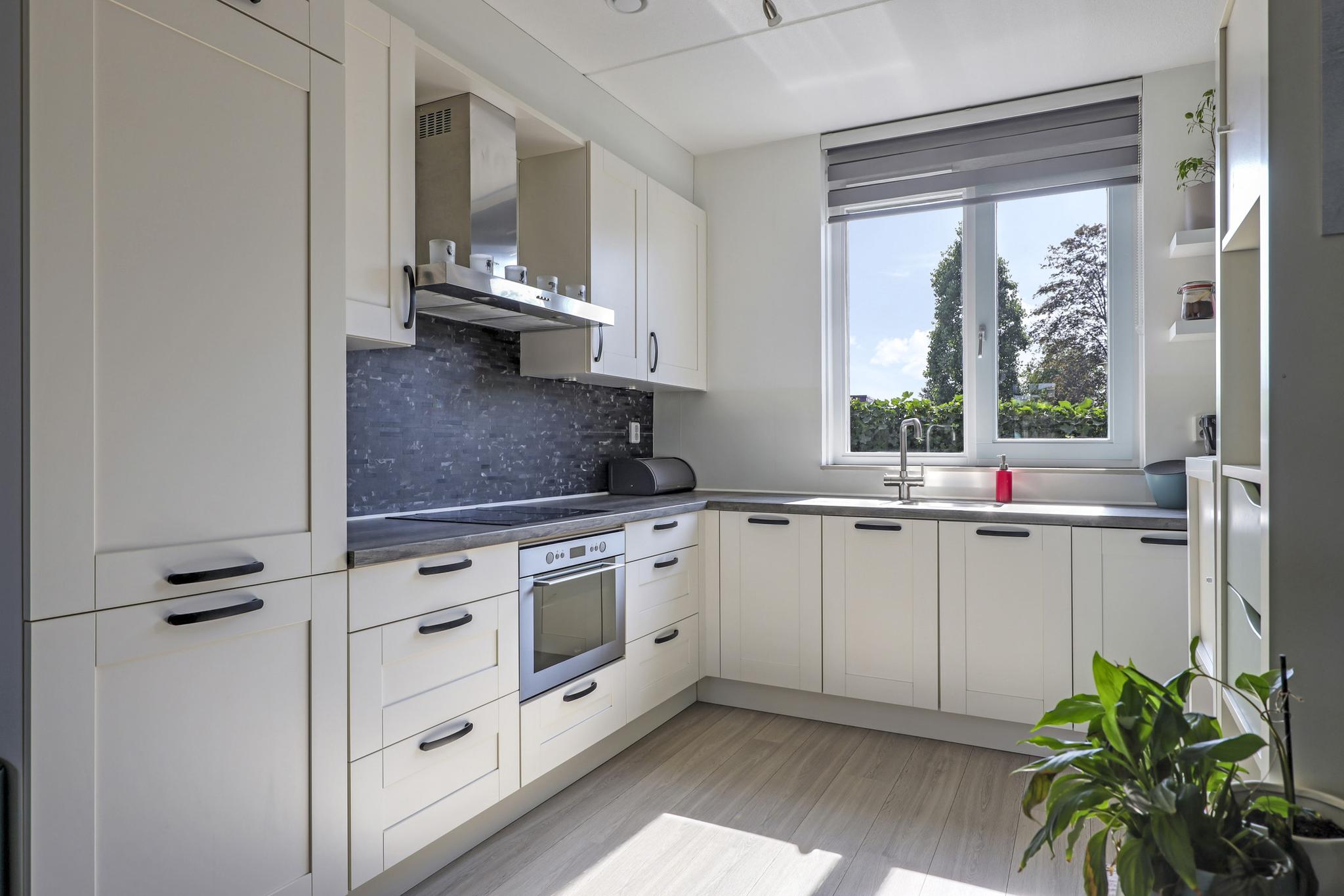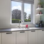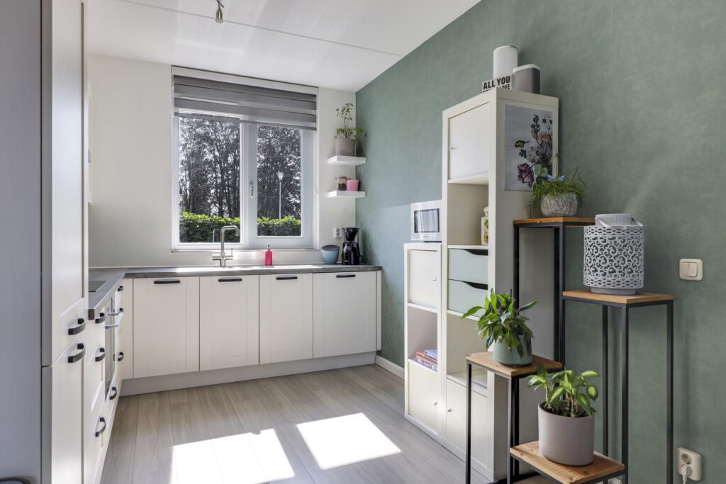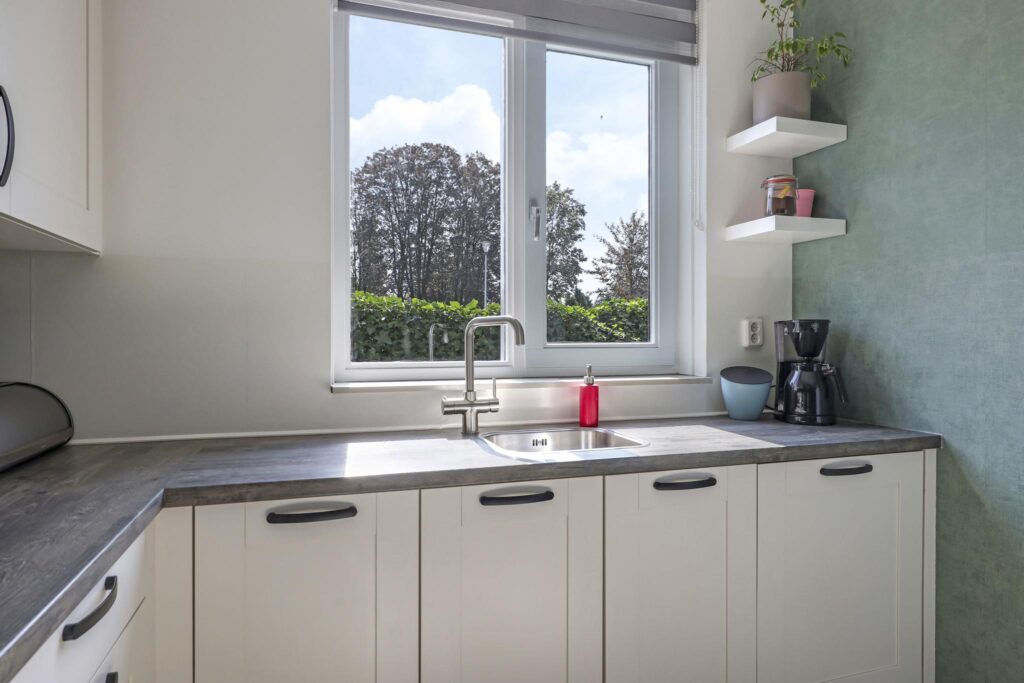 De keuken is aan de voorzijde gelegen en heeft een open karakter naar de woonkamer toe. Een neutrale hoekopstelling biedt ruimte aan diverse inbouwapparatuur zoals een vaatwasser, een koel/vriescombi, een 4-pits inductie kookplaat met afzuigschouw en een combi-oven/magnetron (de laatste functie is defect). Dit jaar is de keuken uitgebreid met een kokend waterkraan die voor veel extra gemak zorgt. Er is praktische kastruimte te vinden waaronder een hoekkast met draaicarrousel. En niet te vergeten het draai/kiepraam waardoor je eenvoudig kunt ventileren. Met name in de keuken kan dat erg prettig zijn wanneer je bijvoorbeeld aan het koken bent.