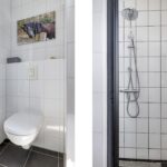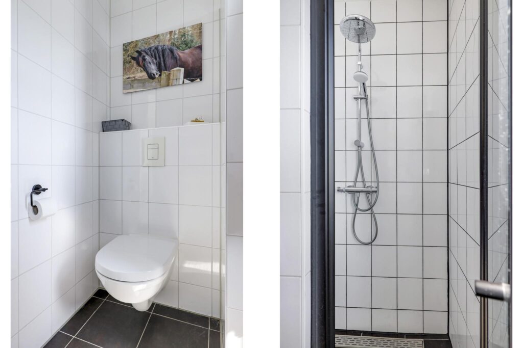 Het zal je niet verbazen dat er ook aan de badkamer net even iets extra meer aandacht is besteed. Deze is namelijk ingericht met een comfortabele inloopdouche waarbij de wand is betegeld en een glazen deur de douche afsluit. Een handdouche, een regendouche en een drainafvoer maken de douche vervolgens compleet.