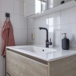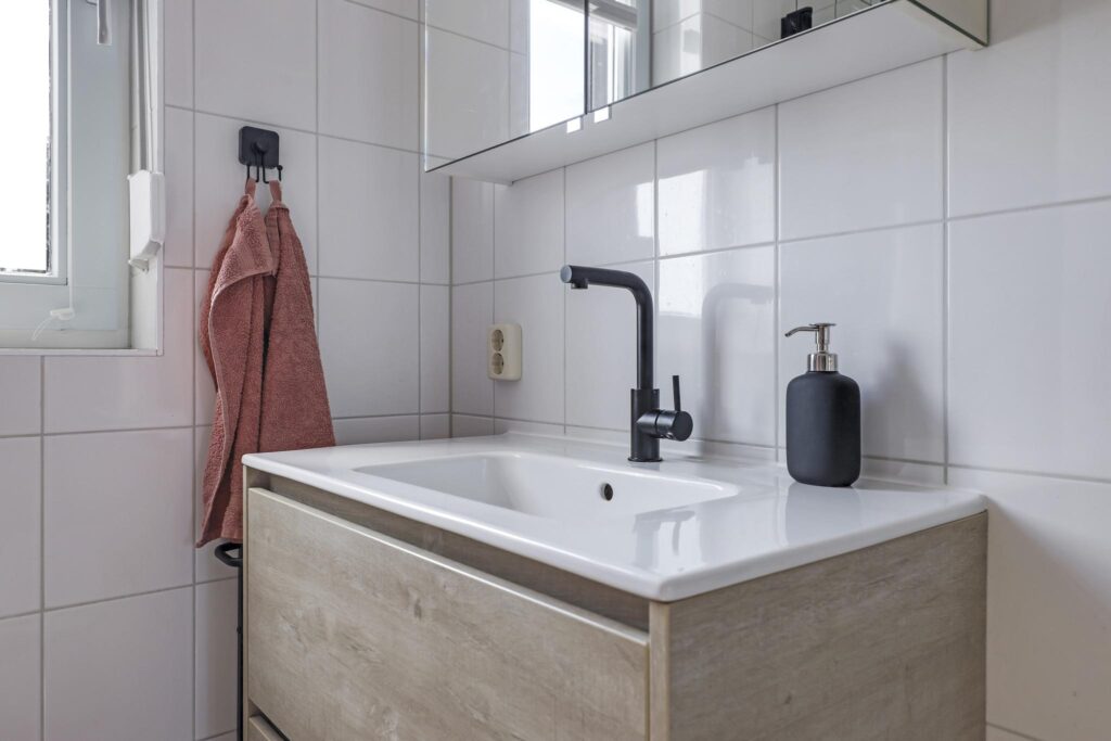 Tegenover de douche is een wastafelmeubel geplaatst. Deze is v.v. van 2-handige ladekorven waar je de nodige toiletspullen kunt opbergen, net als in de spiegelkast die erboven is geplaatst. En natuurlijk ontbreekt het 2e (zwevende) wandcloset niet. Erg prettig is het aanwezige draai/kiepraam, eveneens met rolluik. Het raam zorgt niet alleen voor de ideale ventilatiemogelijkheid, maar ook voor een prettige lichtinval. Een handdoekradiator maakt de badkamer compleet.