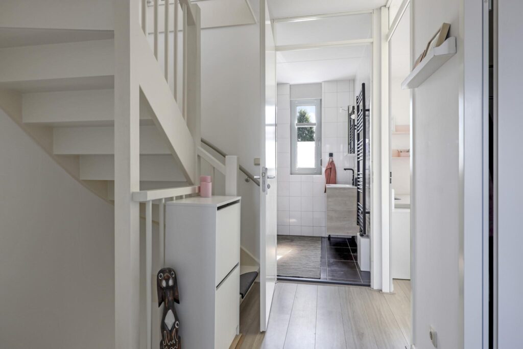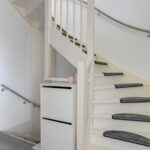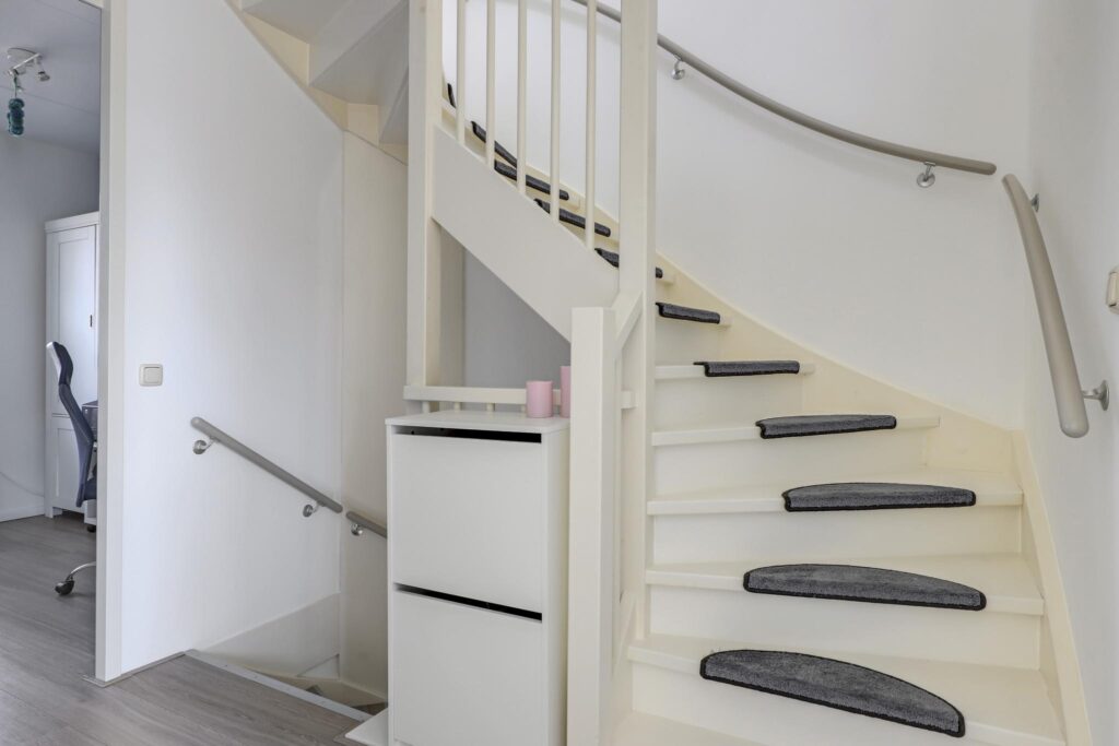 Voordat we naar de 1e verdieping gaan, willen we graag nog de trap uitlichten. De trap heeft namelijk een ‘traprenovatie’ gekregen waarbij die fraai is bekleed met laminaat en is voorzien van extra spotverlichting. Met name wanneer het donker is, ziet dit er erg fraai uit.
