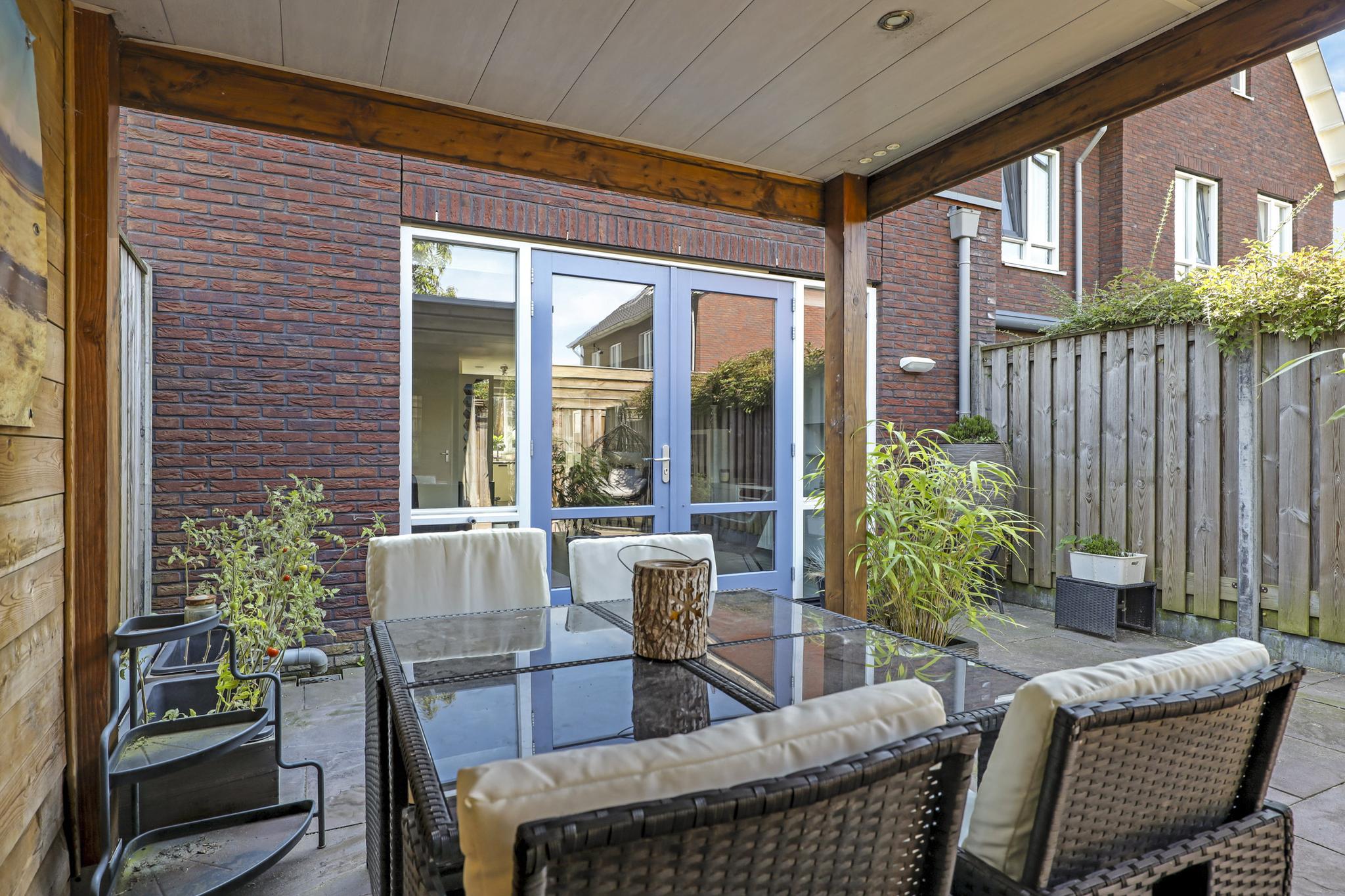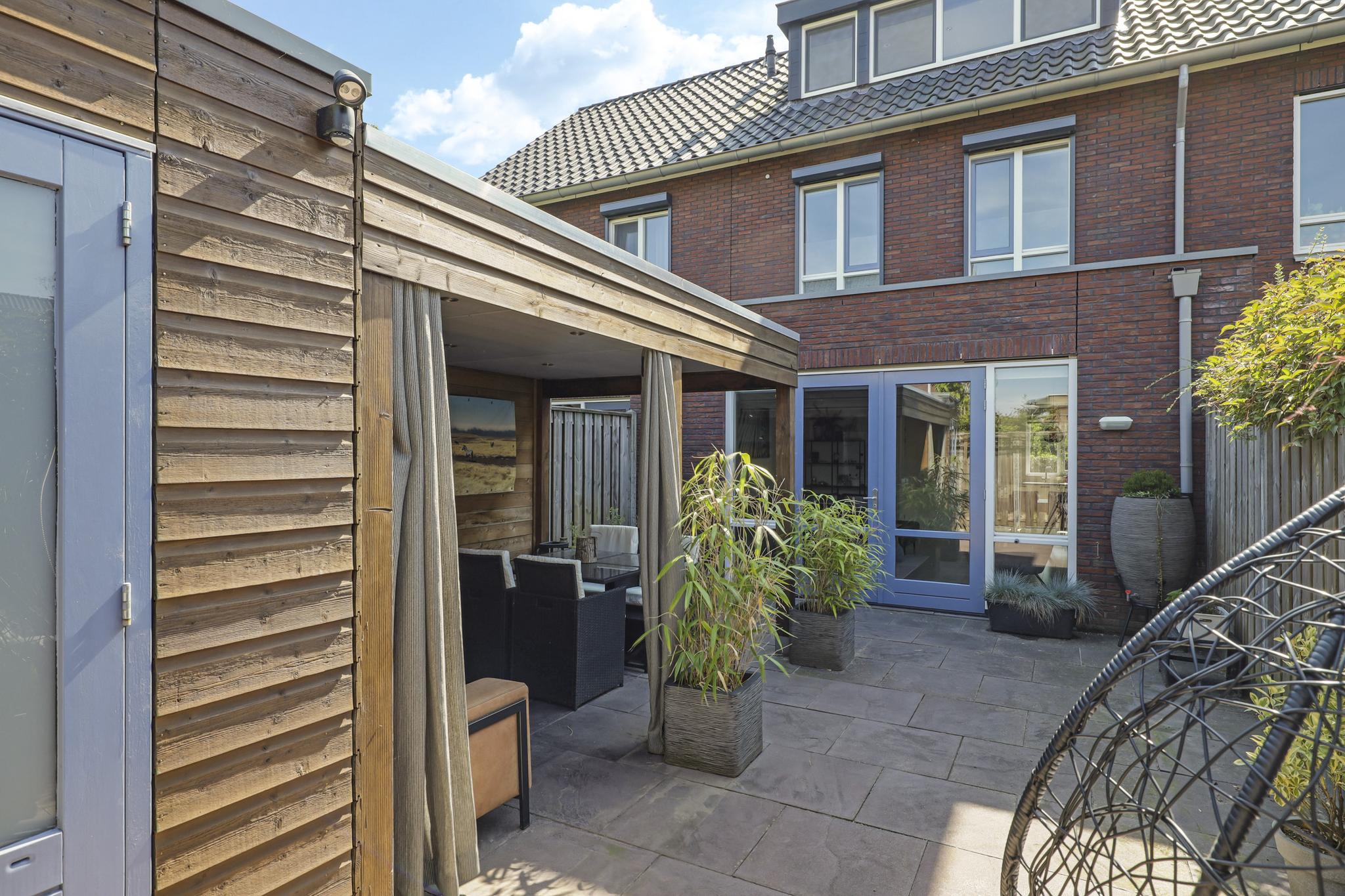 De achtertuin is net even iets dieper dan bij de buurwoning, heeft een praktische schuur als fietsenstalling en een leuke veranda v.v. inbouwspots. De tuin is onderhoudsarm aangelegd en heeft een achterom naar de openbare weg. De woning heeft een centrale ligging in het dorp met alle voorzieningen zoals het dorpsplein en supermarkt op loopafstand. Een basisschool is zelfs op steenworp afstand gelegen.
