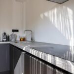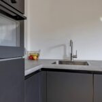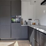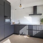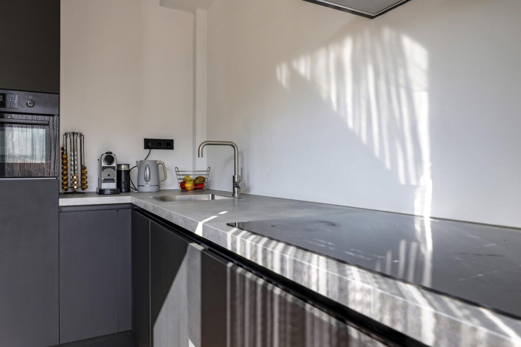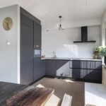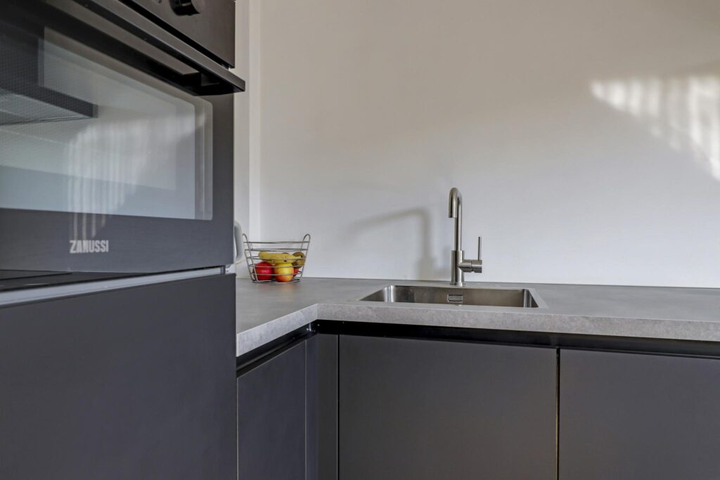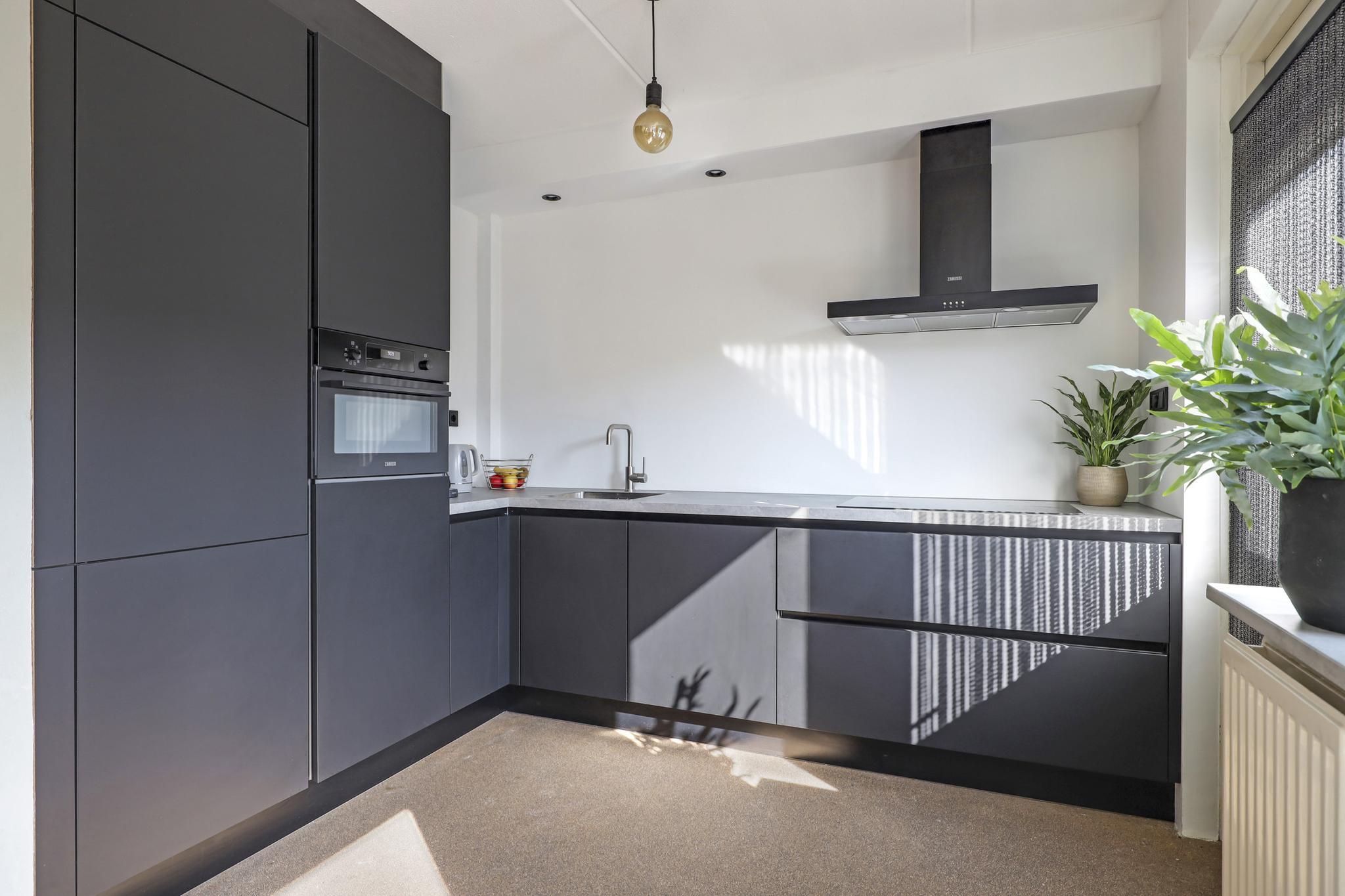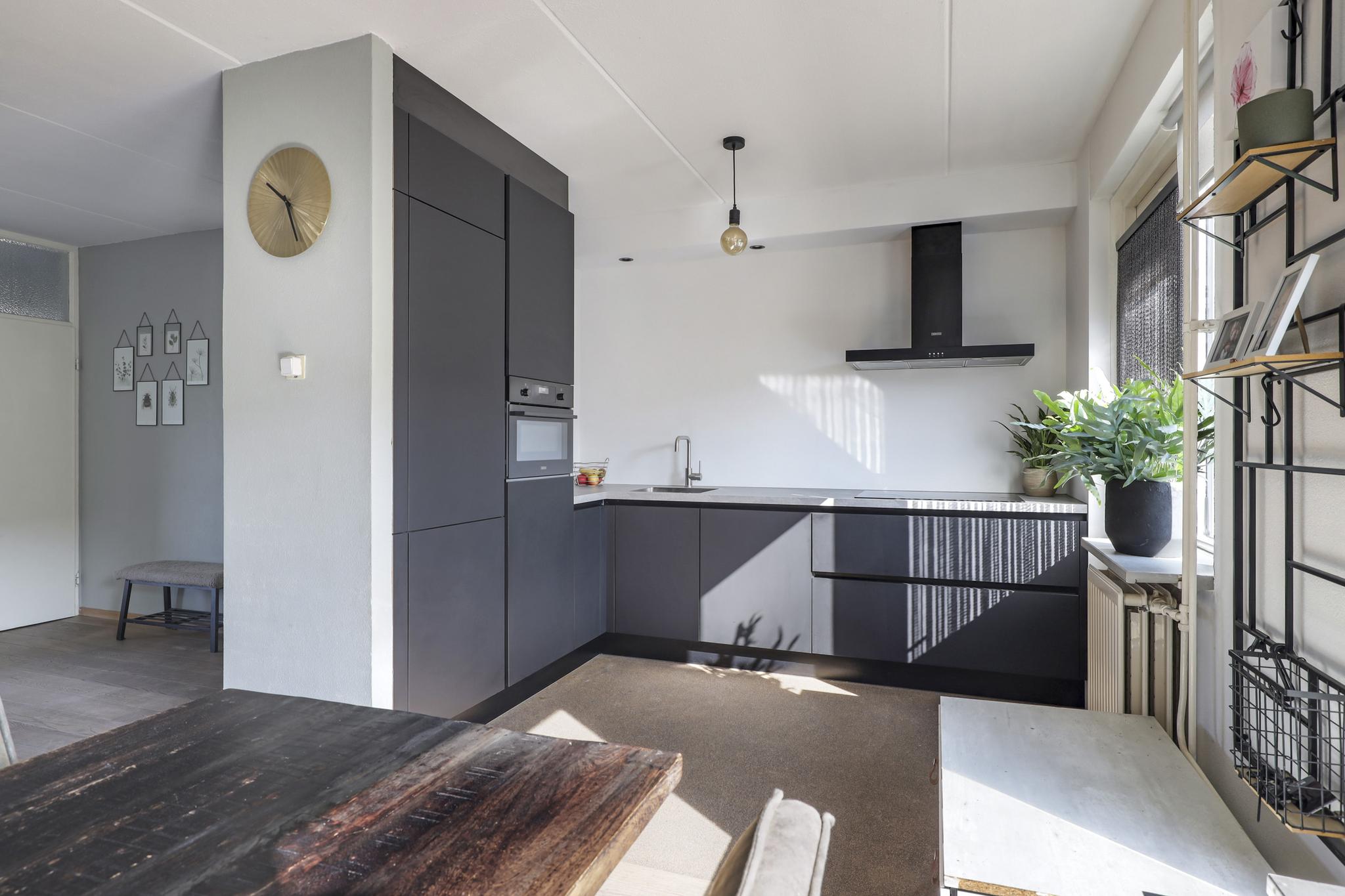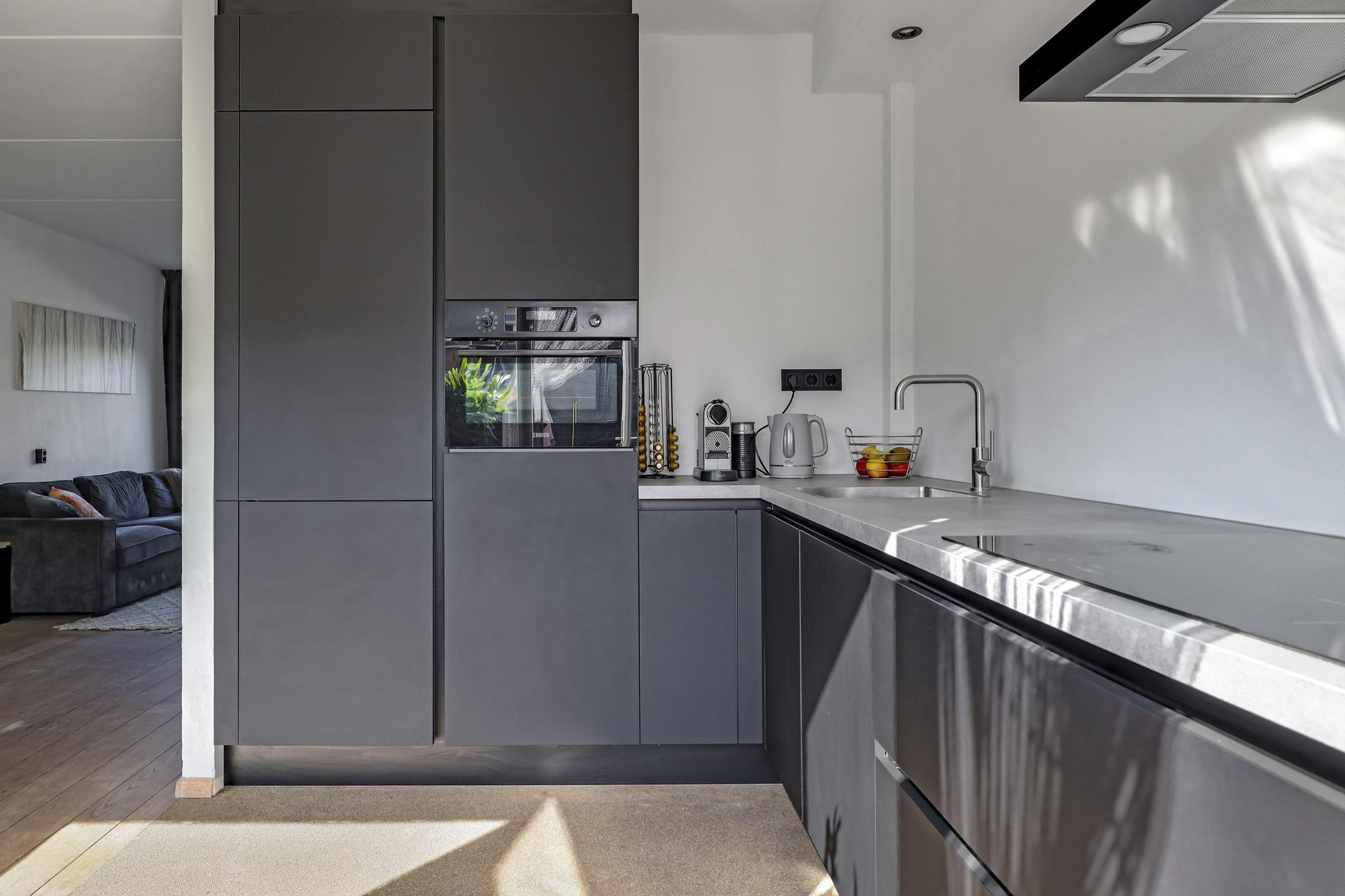 Wanneer je vanuit de woonkamer naar achteren loopt en om het hoekje kijkt, dan wordt je verrast door een ruim opgezette keuken die pas 2 jaar geleden geplaatst is. De hoekopstelling heeft een strakke en moderne uitstraling, mede door de trendy kleurstellingen en greeploze fronten. De inbouwapparatuur bestaat uit een vaatwasser, een combi-oven/magnetron, een koelkast, een brede 4-pits inductie kookplaat en een afzuigschouw. Een moderne kraan, nieuwe wandcontactdozen en inbouwspots, uitgevoerd in zwarte accenten maken deze keuken compleet. Een tuindeur geeft direct toegang tot het buitenterras.
