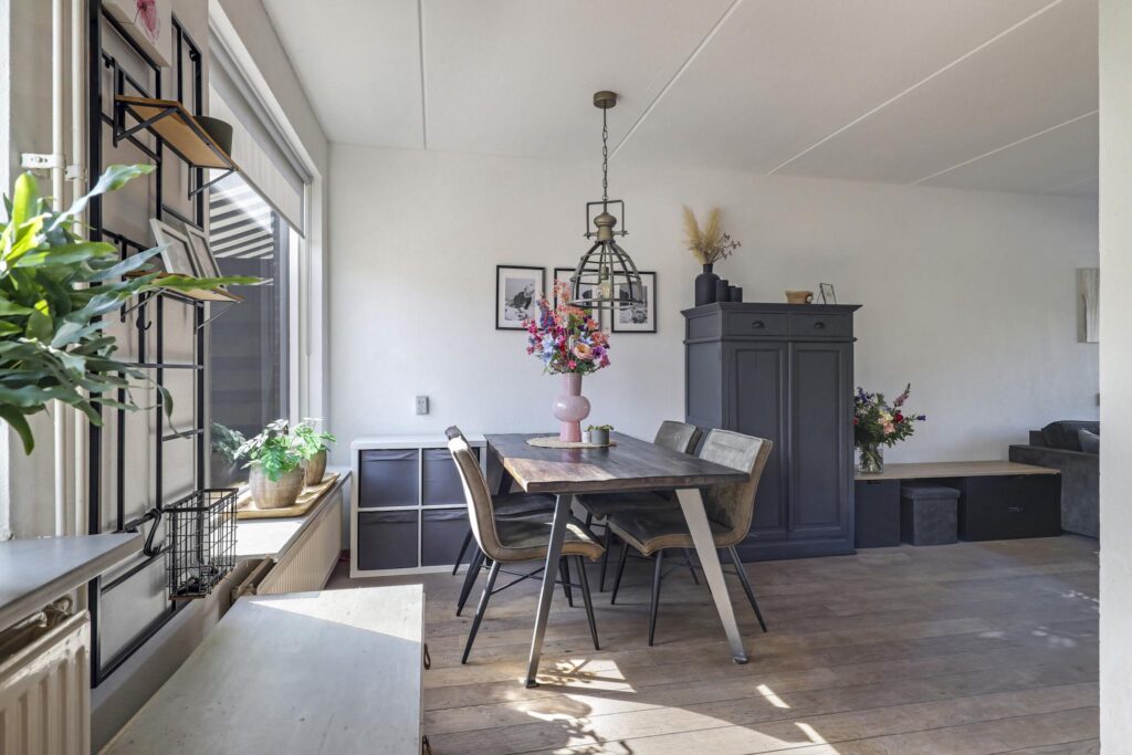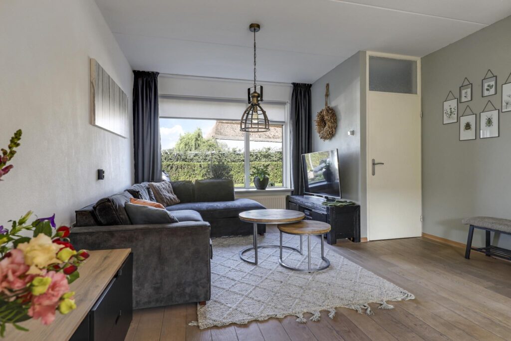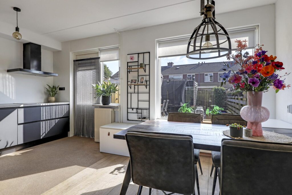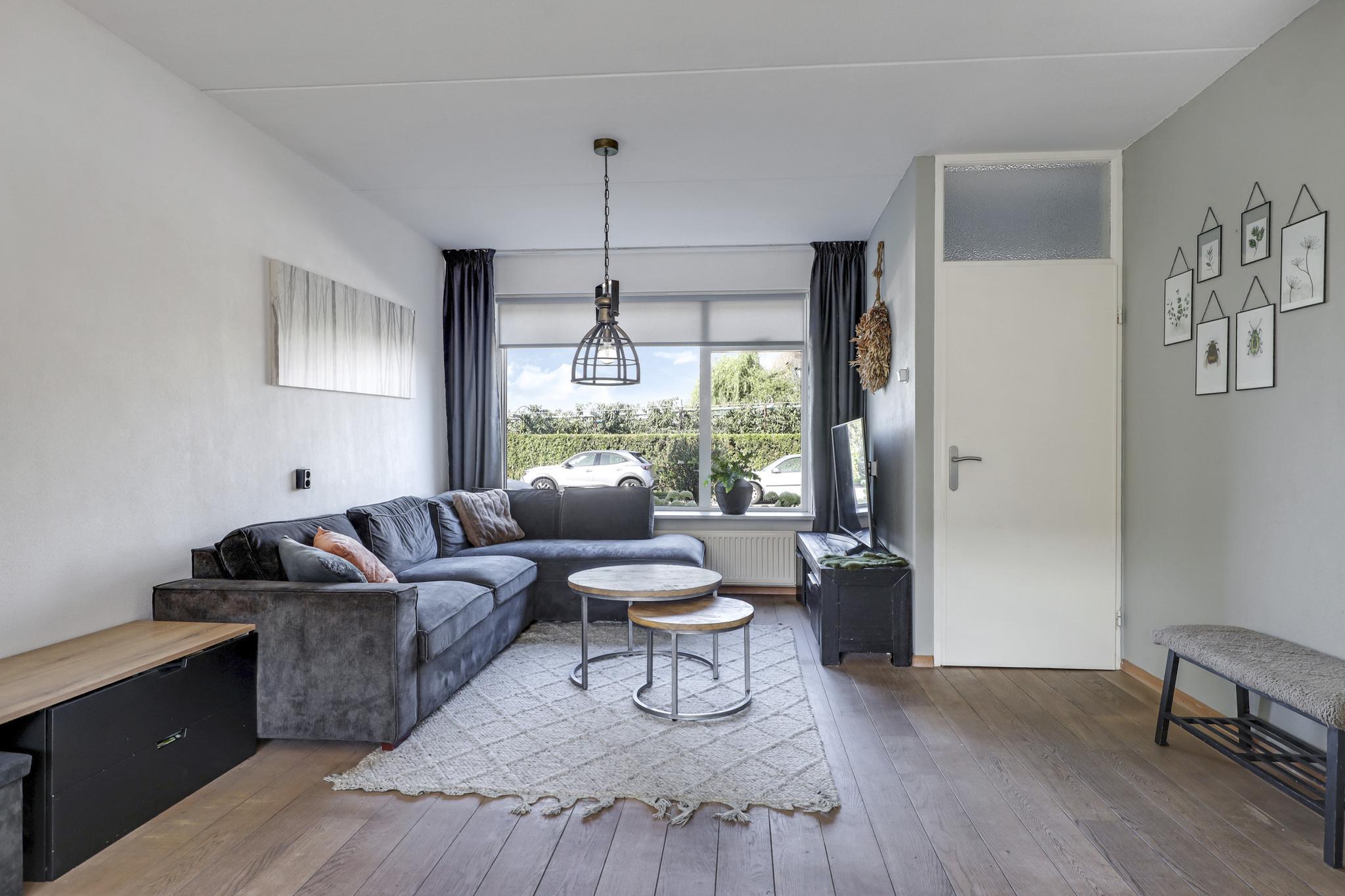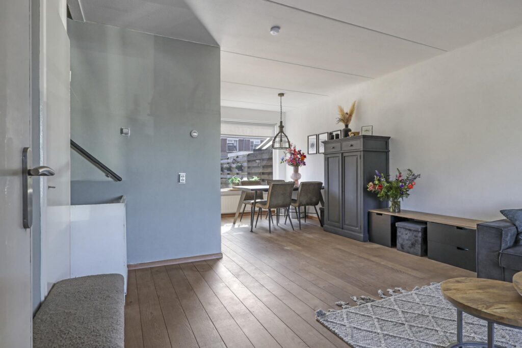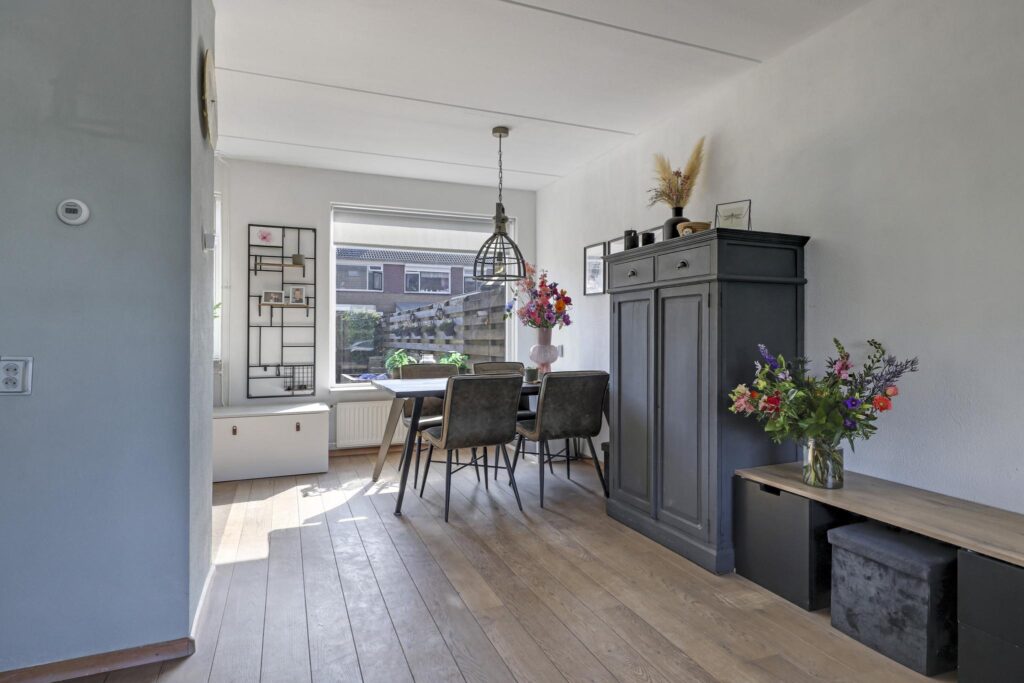Deze woning wordt verzorgd bewoond waarbij de aankleding en afwerking voor een prettige woonsfeer zorgen. Dat wordt al meteen duidelijk wanneer je vanuit de hal de woonkamer in loopt. De massief houten vloer zal je daarbij direct aanspreken. De woonkamer heeft een ruimtelijke indeling waar je prima een hoekbank en een 6-persoons eettafel kwijt kunt. Grote ramen in voor- en achtergevel geven een fijne lichtinval waarbij je aan de voorzijde weg kijkt op een groene haag en fruitbomen (in plaats van overburen).