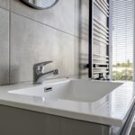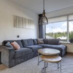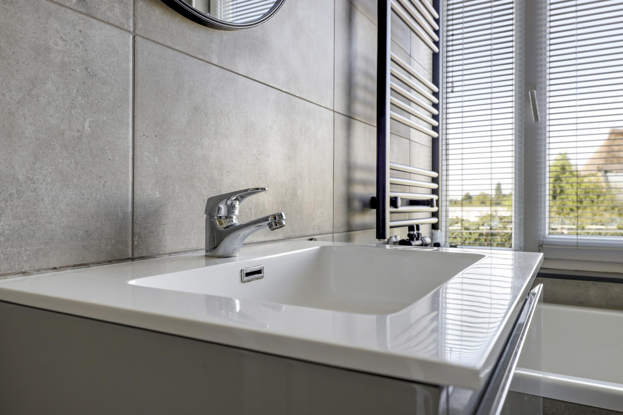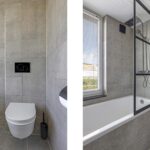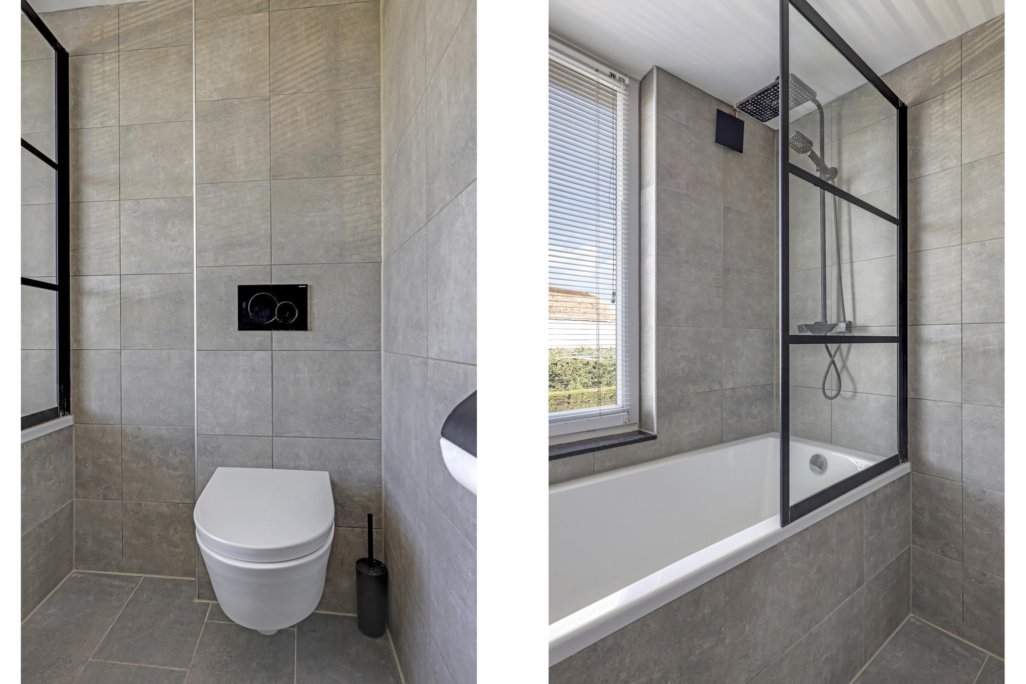 Net als de keuken is ook de badkamer nog relatief nieuw. Tijdens de volledige moderniseren is er gekozen voor groot formaat tegels (betonlook) en zwarte accenten hetgeen de badkamer een frisse en trendy uitstraling geeft. De ruimte is ingedeeld met een groot ligbad met douchegedeelte, een wastafelmeubel en een 2e (zwevend) toilet. Opvallend is de zwartstalen glaswand op de rand van het bad waardoor je het (spat)water ‘binnenboord’ houdt. En ook het zwarte douche-armatuur is het benoemen waard aangezien er is gekozen voor een grote rainshower in combinatie met een handdouche. Het wastafelmeubel heeft 2 ladekorven waar je de nodige badkamerspullen kunt opbergen. Erboven is een leuke, ronde spiegel geplaatst. Er is ventilatie aangebracht, maar je kunt ook een raam openzetten om te ventileren. Bovendien zorgt het grote raam voor een bijzonder prettige lichtinval. Een handdoekradiator maakt deze badkamer compleet.