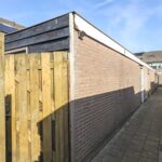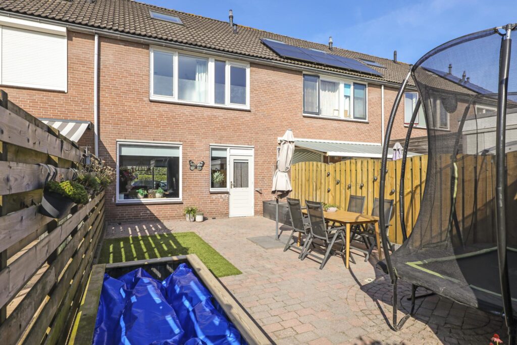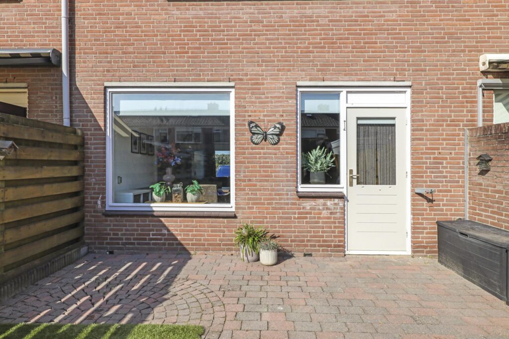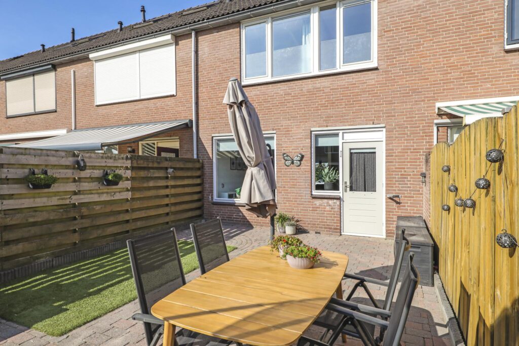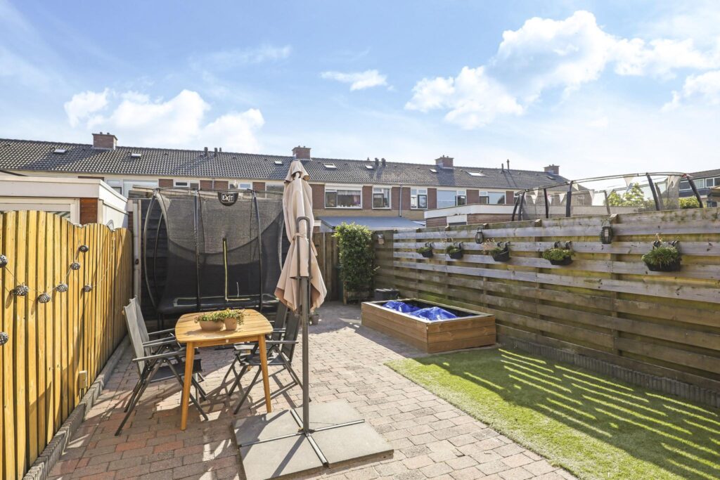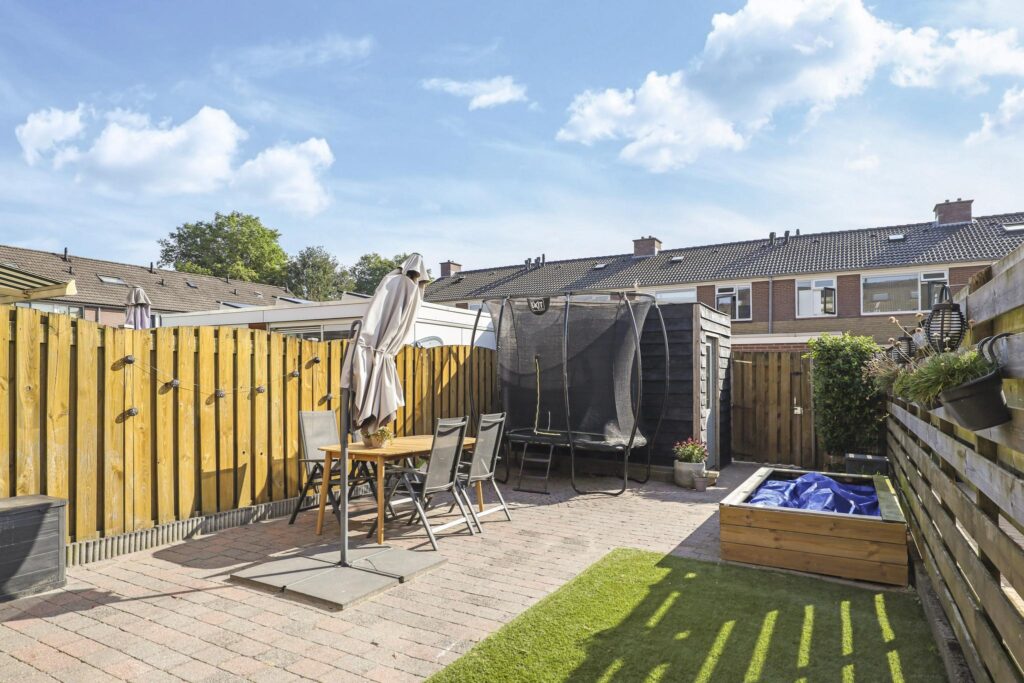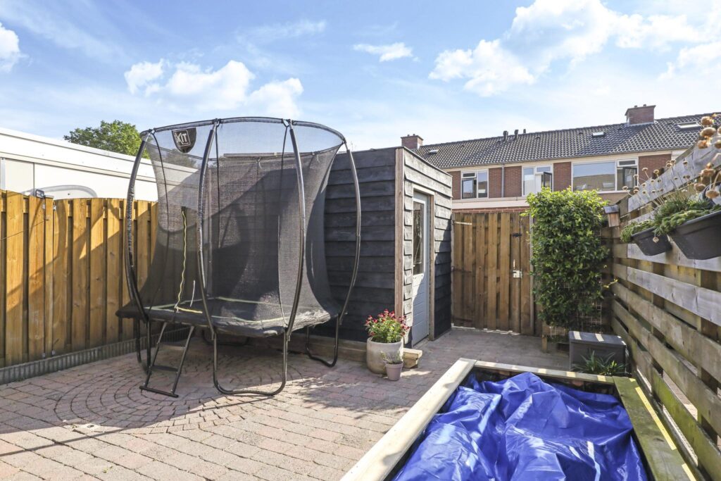 Doordat de achtertuin voor een groot gedeelte is bestraat en is voorzien van een stukje kunstgras, heeft de tuin een onderhoudsarm en verzorgd karakter. Ook zijn er degelijke schuttingen op de erfgrens met de buren geplaatst. Achterin de tuin staat een stenen schuur waar je de nodige tuinspullen kwijt kunt en enkele fietsen kunt stallen. Doordat de schuur met houten rabatdelen is bekleed, krijg je niet de indruk dat de schuur in steen is uitgevoerd. In de schuur is elektra te vinden. Een poort geeft toegang tot het achtergelegen pad waardoor de tuin goed toegankelijk is.