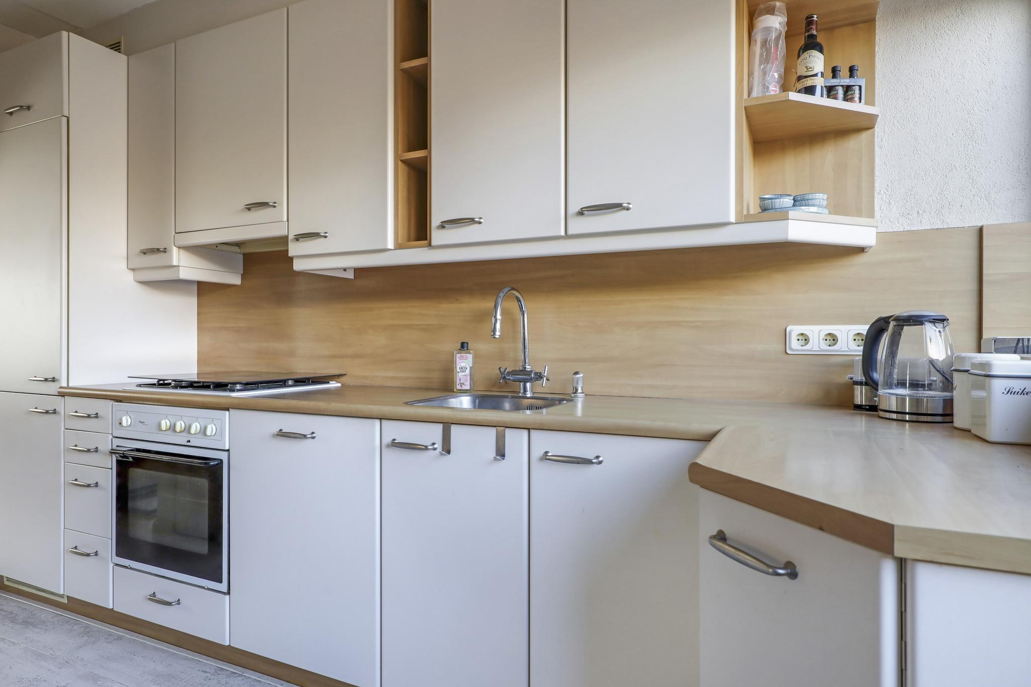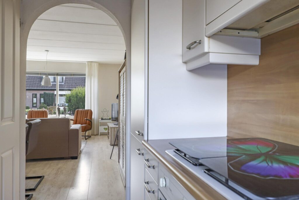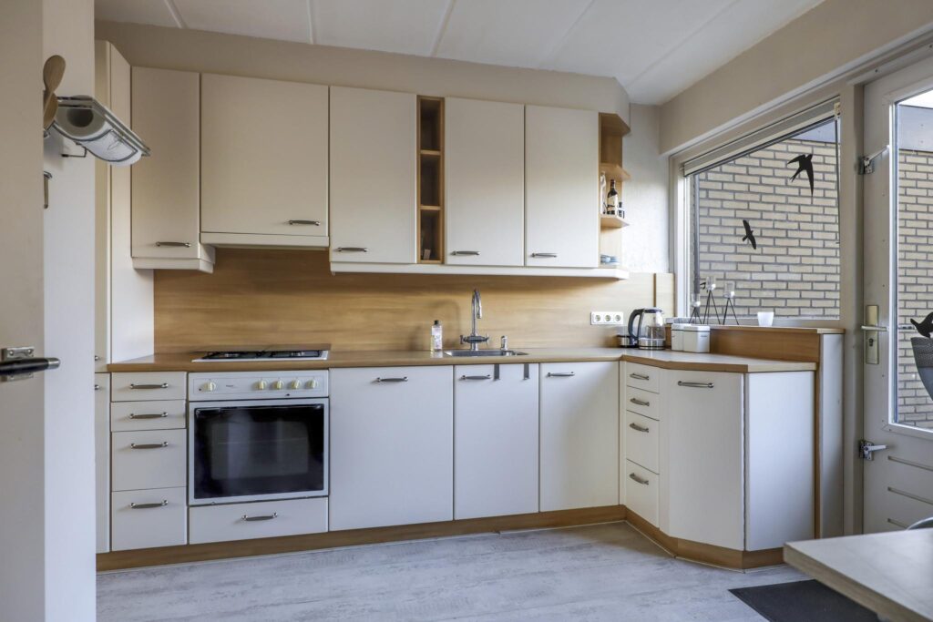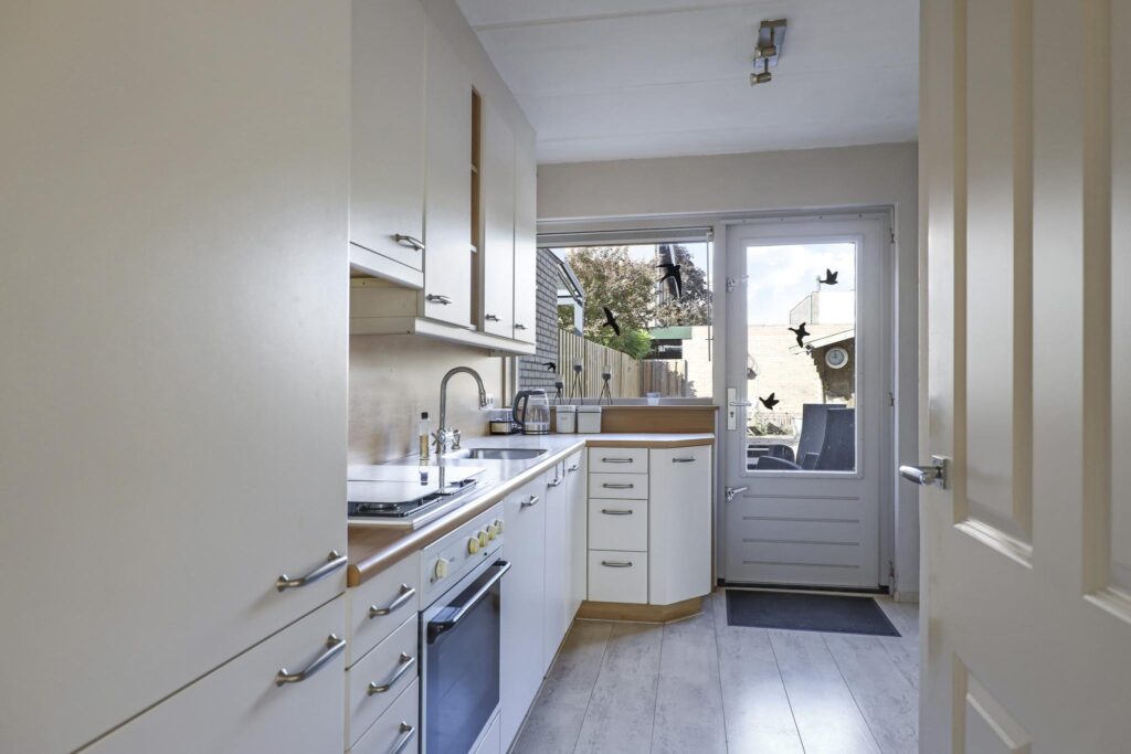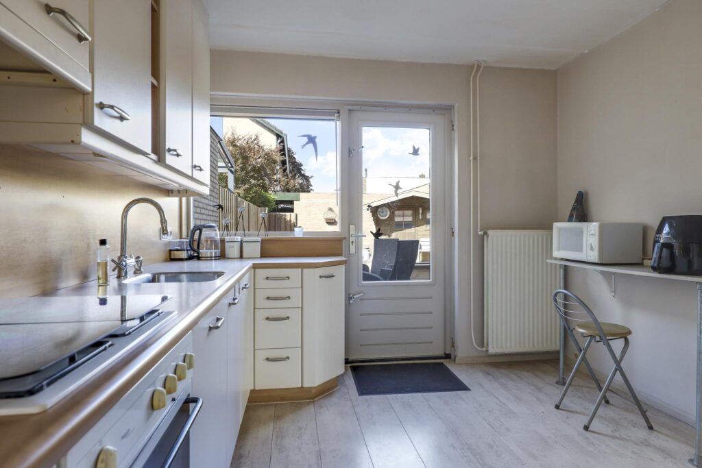 Vanuit de woonkamer is er een doorloop naar de keuken waardoor deze een half-open karakter heeft. De keuken is daardoor tuingericht waarbij ook hier een groot raam voor opvallend veel daglicht zorgt. De keukenopstelling is voorzien van diverse inbouwapparatuur zoals een vaatwasser, een koelkast, een 4-pits gaskookplaat met afzuiger en een oven. Er is voldoende kastruimte, onder meer in de trap/voorraadkast. De keuken is groot genoeg voor een 4-persoons eettafel. Mocht je een grotere keuken wensen, dan zijn er prima uitbouwmogelijkheden. Nu geeft een tuindeur direct toegang tot het buitenterras.