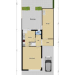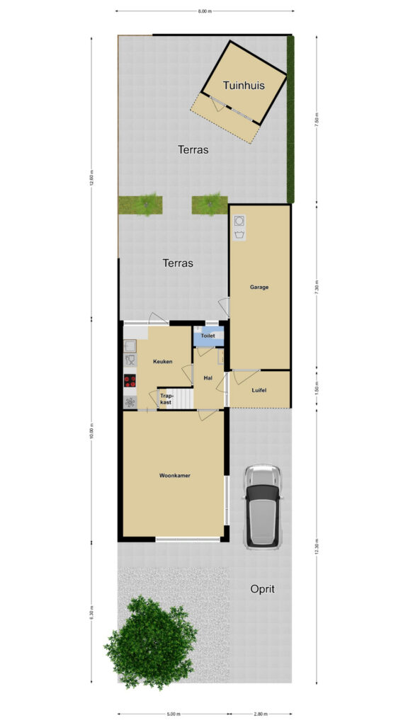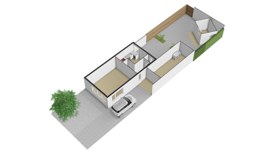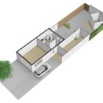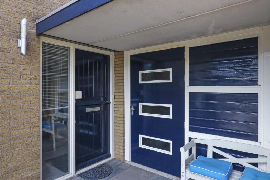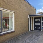Vóór de garage is de oprit gelegen. Deze is lang genoeg om 2 auto’s achter elkaar te parkeren. Een overstek van het platte dak zorgt voor een luifel bij de voordeur waardoor je hier altijd droog staat. In de praktijk zien we wel eens dat men hier de hal vergroot door onder het overstek uit te bouwen. Daardoor creëer je eenvoudig een grotere hal én de mogelijkheid om bijvoorbeeld een kantoor of praktijk aan huis te houden.