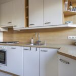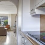 Half-open keuken v.v. inbouwapparatuur en een tuindeur.