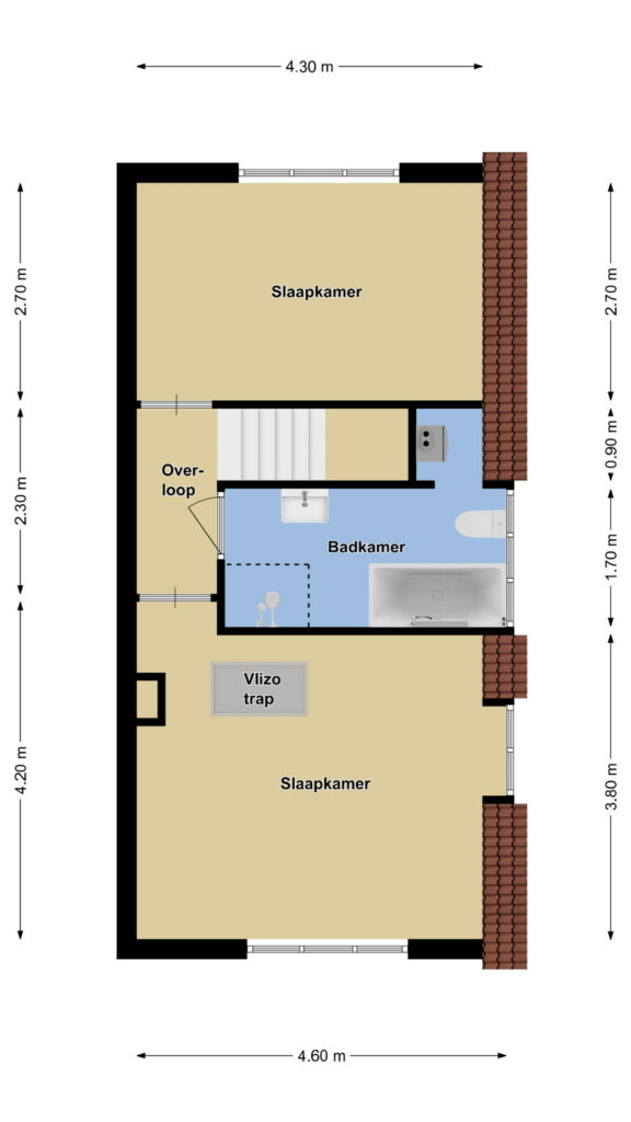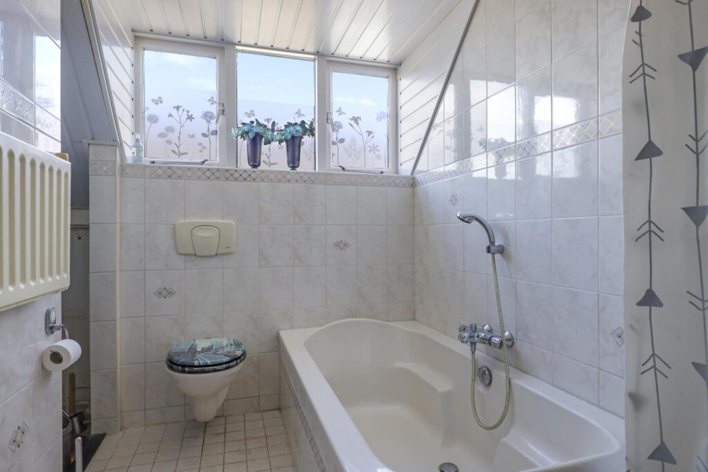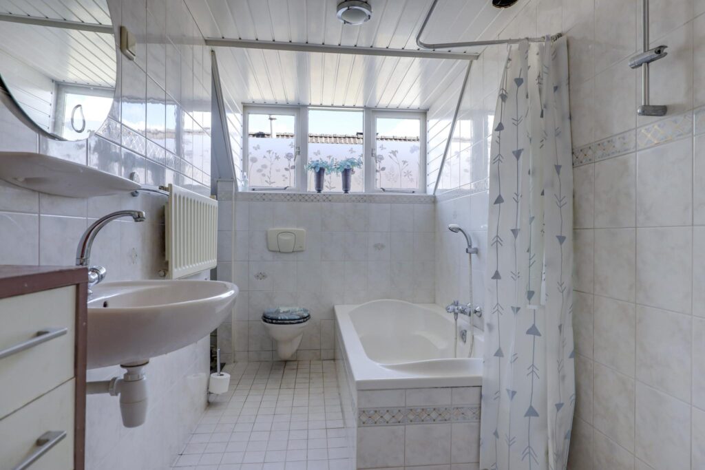 Tussen de slaapkamers in, is de badkamer te vinden. Deze is verrassend ruim, mede door de dakkapel die voor daglicht zorgt. De ruimte is optimaal en compleet ingericht met een douche, een ligbad, een wastafel en een 2e (zwevend) toilet. Boven de wastafel is een planchet (schap) en een spiegel geplaatst. Opvallend is het nisje achterin waar de CV-ketel is geïnstalleerd. Hier zou je een deurtje kunnen maken zodat er een kast ontstaat.