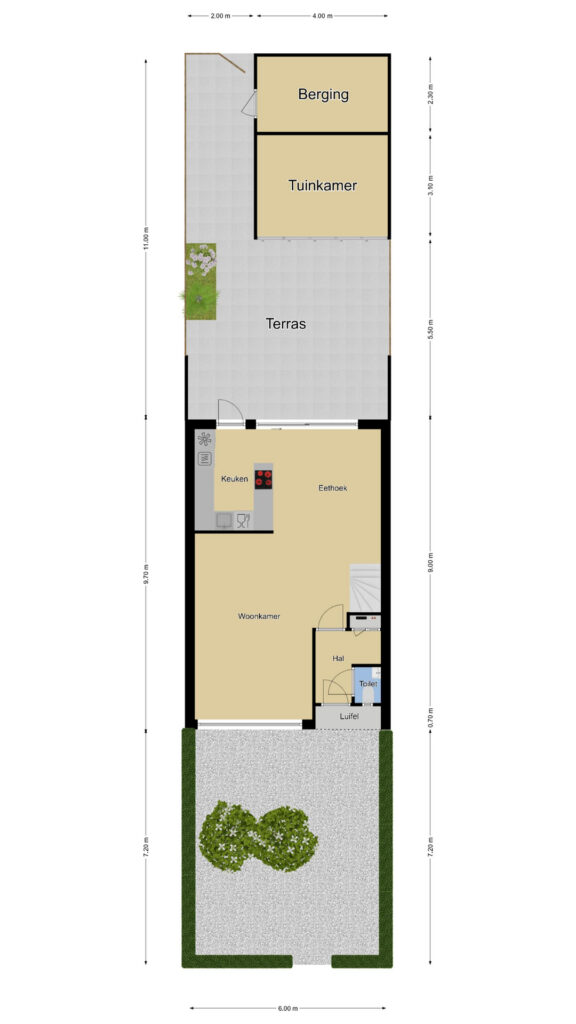 Breedtemaat (binnenmaat) van 5,7 meter (4,8m of 5,1m zijn standaard nieuwbouwmaten)