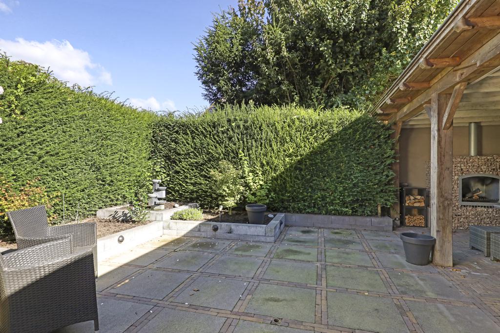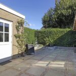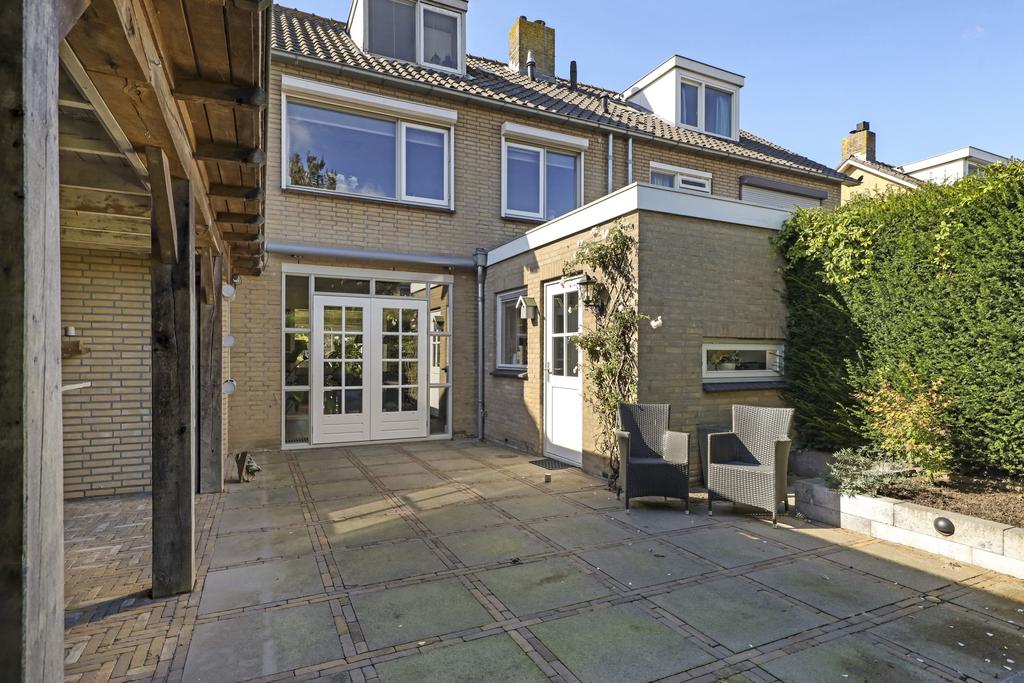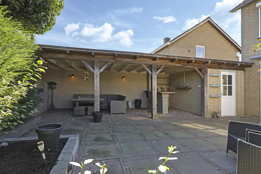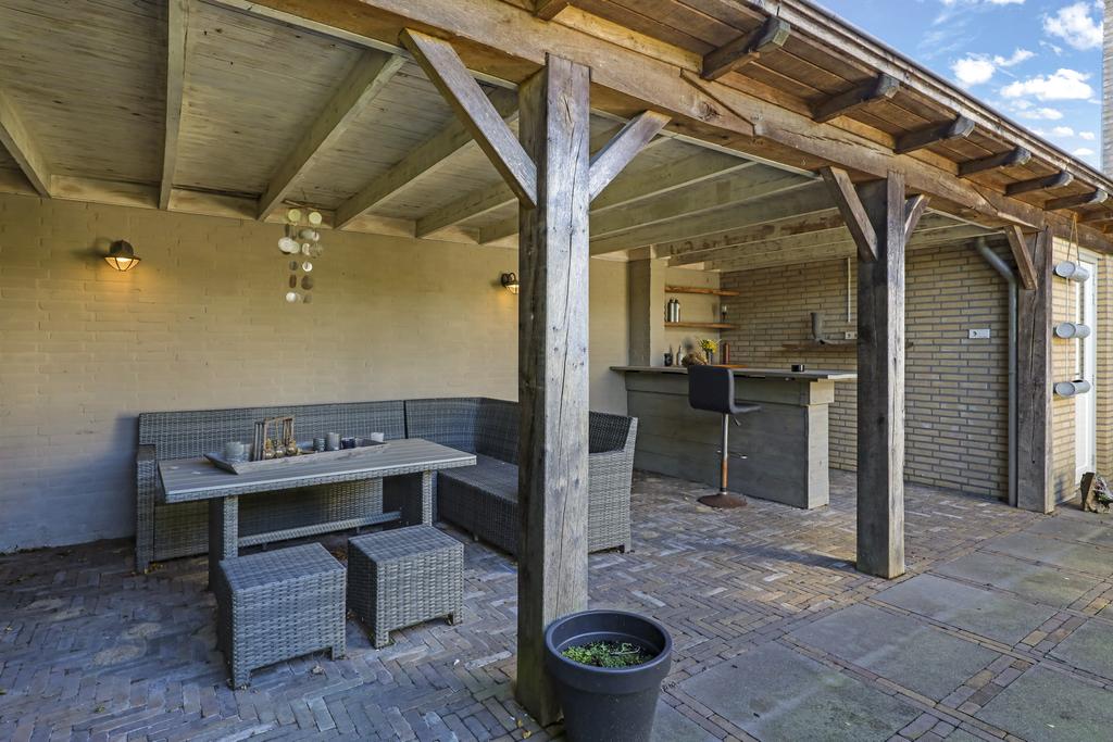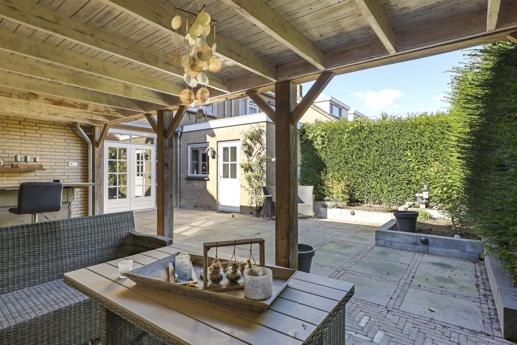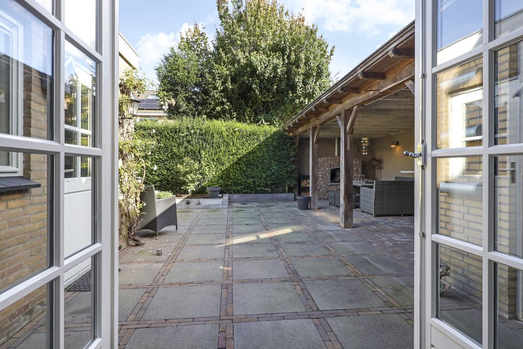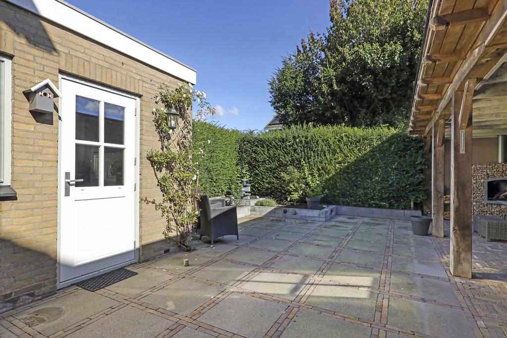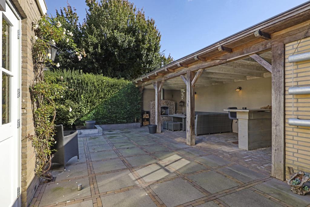 Eén van de pluspunten van deze woning is de achtertuin. Deze heeft een goed formaat (ca. 14 meter diep en 9m breed) en ligt relatief vrij doordat er achter de woning een groene buffer van bomen er voor zorgt dat er nagenoeg geen inkijk is. Grenzend aan de schuur is een robuuste eikenhouten veranda met stijlvolle detaillering gebouwd (3,2m x 7,6m) waar je heerlijk beschut en uit de zon kunt zitten. Hier kun je tot in de late uurtjes lang van het buitenleven genieten, zeker wanneer je de buitenhaard aansteekt. De tuin is relatief onderhoudsvrij waarbij de bestrating geheel in stijl van de woning met o.a. gebakken waaltjes, verzorgd is aangelegd.