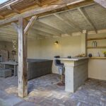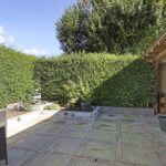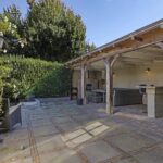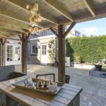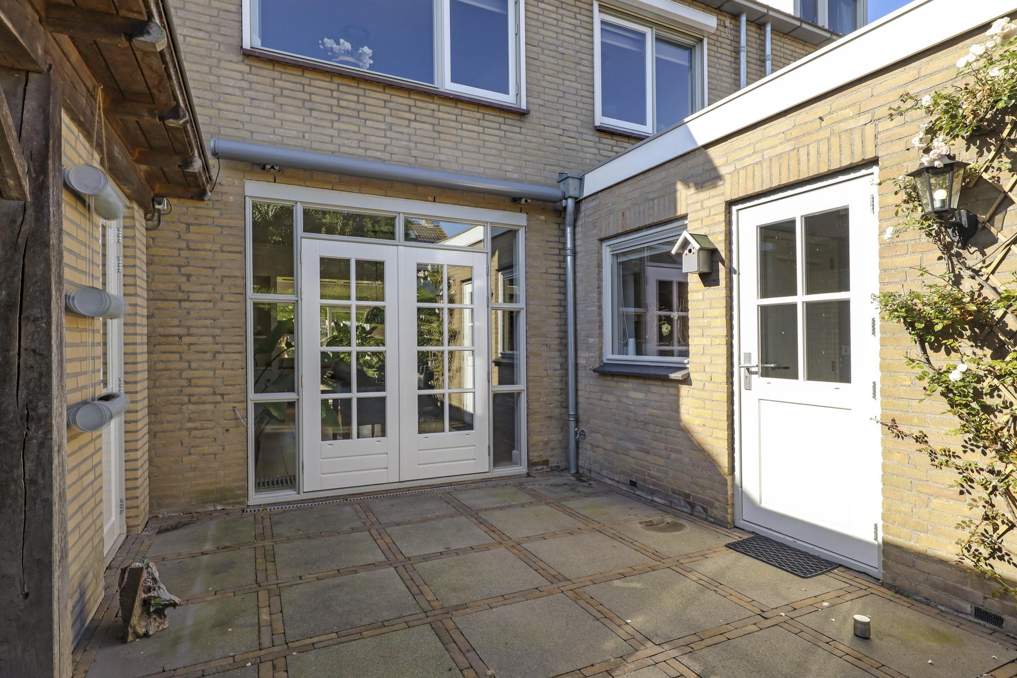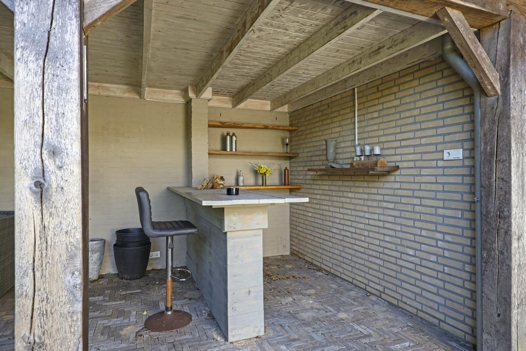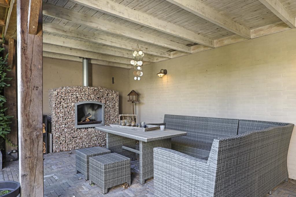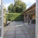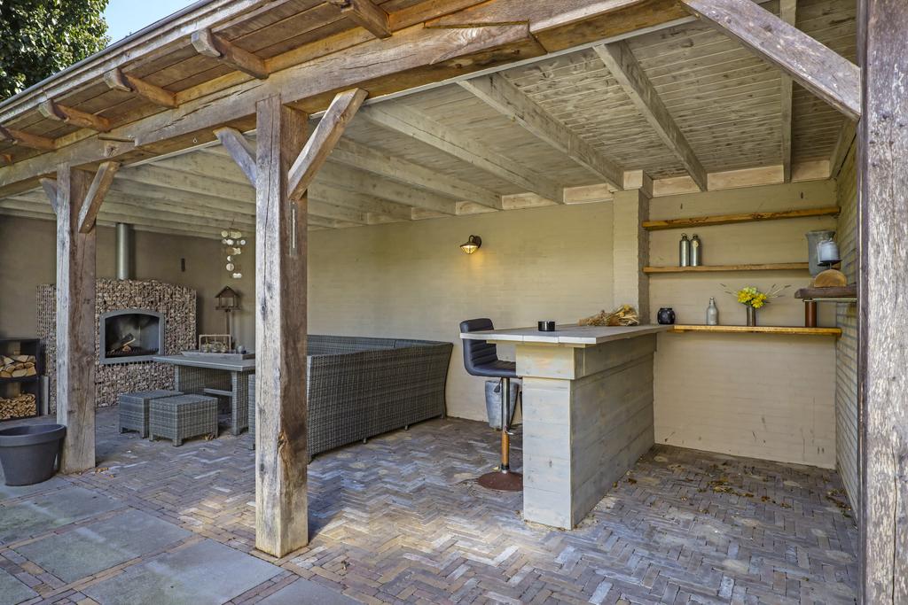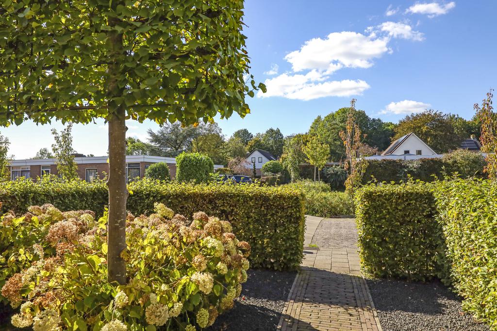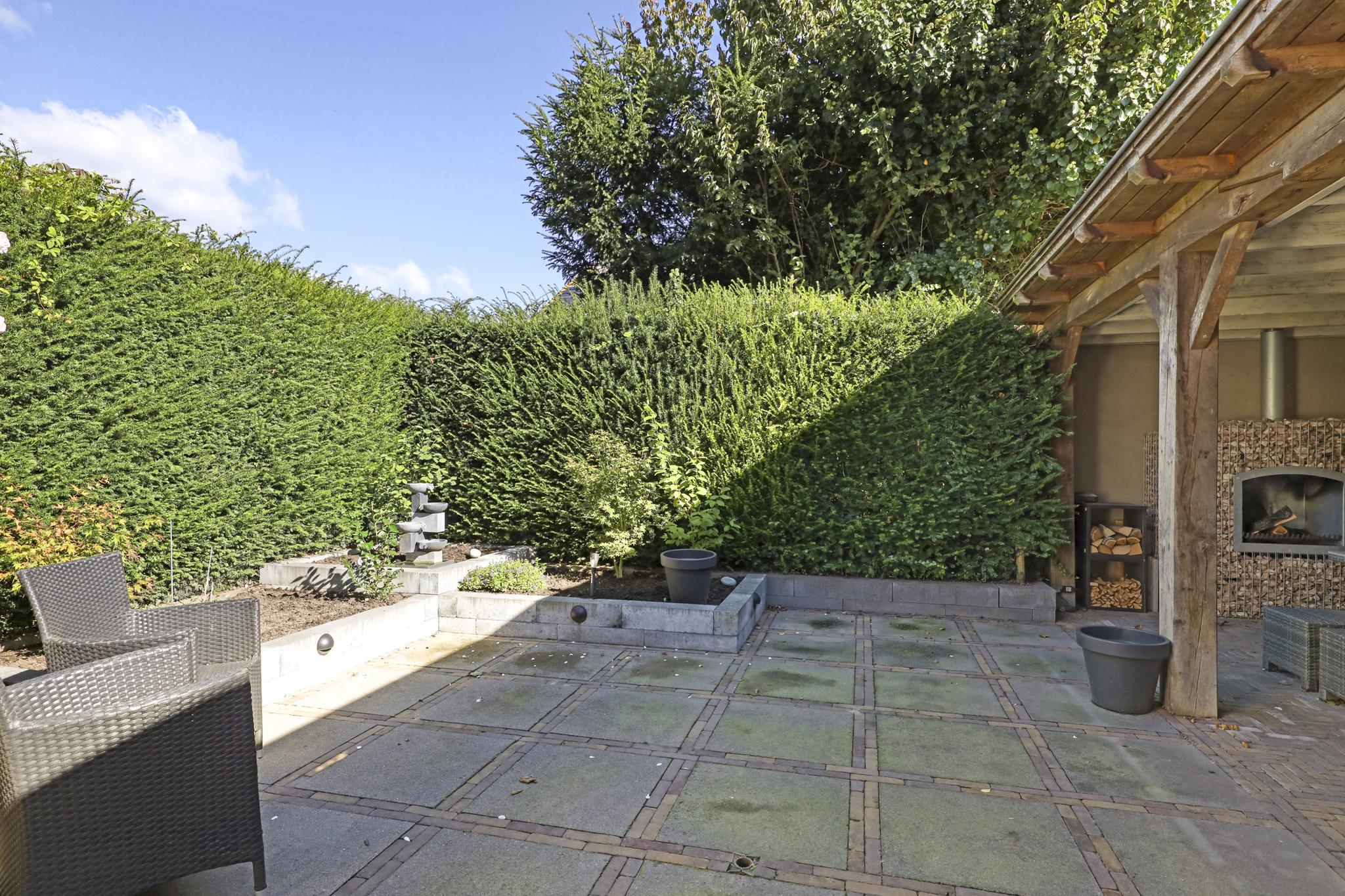 Eén van de pluspunten van deze woning is de achtertuin. Deze heeft een goed formaat (ca. 14 meter diep en 9m breed) en ligt relatief vrij doordat er achter de woning een groene buffer van bomen er voor zorgt dat er nagenoeg geen inkijk is. Grenzend aan de schuur is een robuuste eikenhouten veranda met stijlvolle detaillering gebouwd (3,2m x 7,6m) waar je heerlijk beschut en uit de zon kunt zitten. Hier kun je tot in de late uurtjes lang van het buitenleven genieten, zeker wanneer je de buitenhaard aansteekt. De tuin is relatief onderhoudsvrij waarbij de bestrating geheel in stijl van de woning met o.a. gebakken waaltjes, verzorgd is aangelegd.