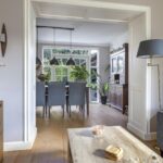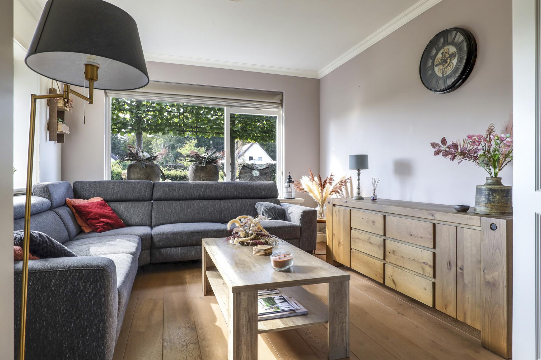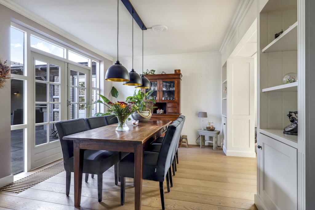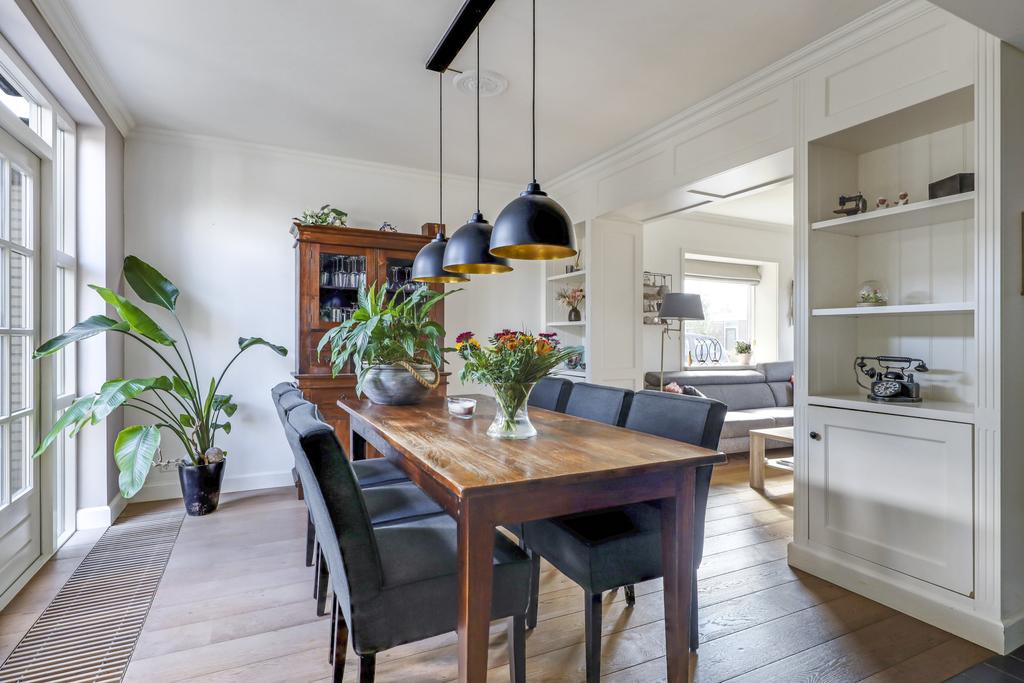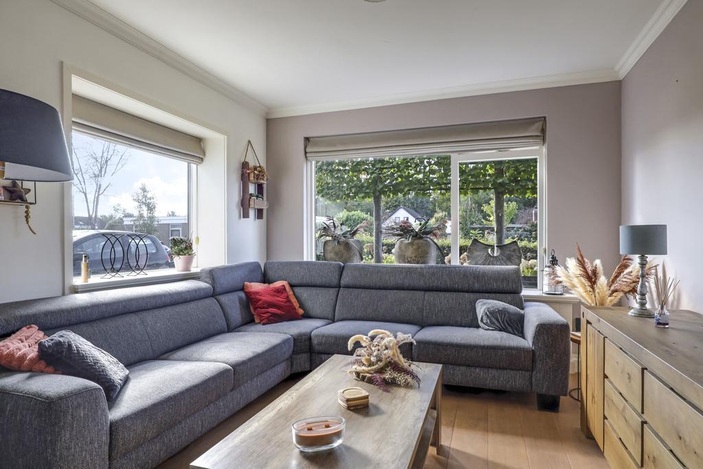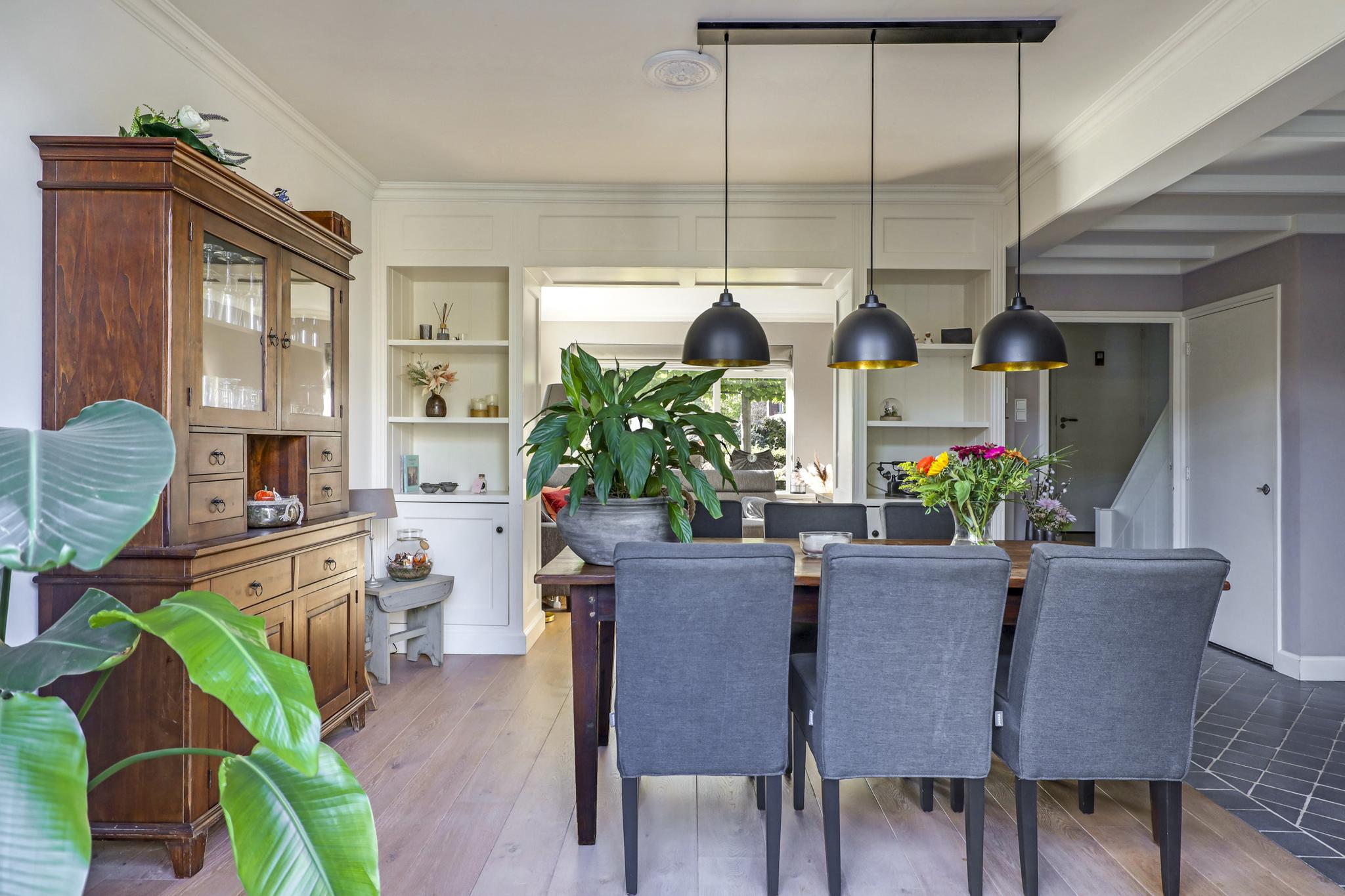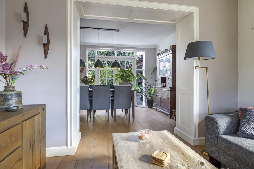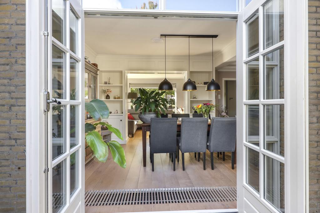 Deze woning heeft een klassieke doorzon-woonkamer met grote raampartijen. Hierdoor is het altijd licht in de woonkamer wat voor een prettige woonsfeer zorgt. Door de gunstige ligging in de straat kijk je aan de voorzijde mooi van je af. Ook aan de achterzijde is veel privacy en daardoor praktisch geen inkijk. Op de vloer ligt een mooie houten vloer welke is afgewerkt met hoge, opstaande plinten. In de achtergevel vinden we een pui met openslaande deuren (met schitterende espagnoletsluiting) waardoor er een directe toegang is tot het buitenterras. Voor de deuren is een convectorput in de vloer aangebracht. De speelse en-suite kastenwand zorgt, naast praktische opbergruimte, voor een sfeervolle indeling van de woonkamer waardoor er als het ware een zitkamer en een eetkamer ontstaat.
