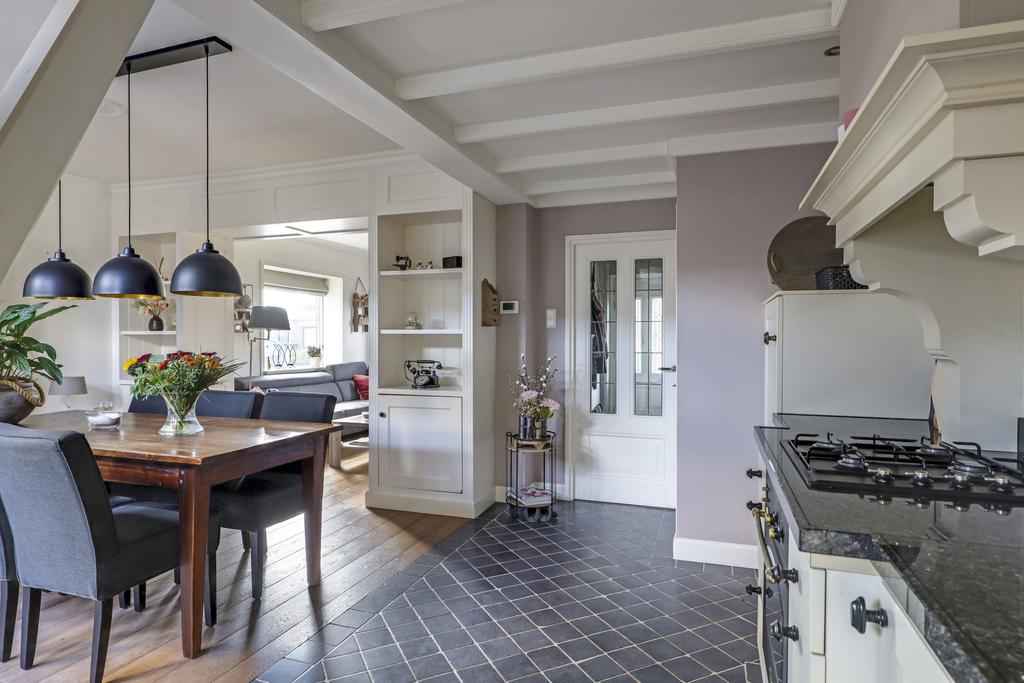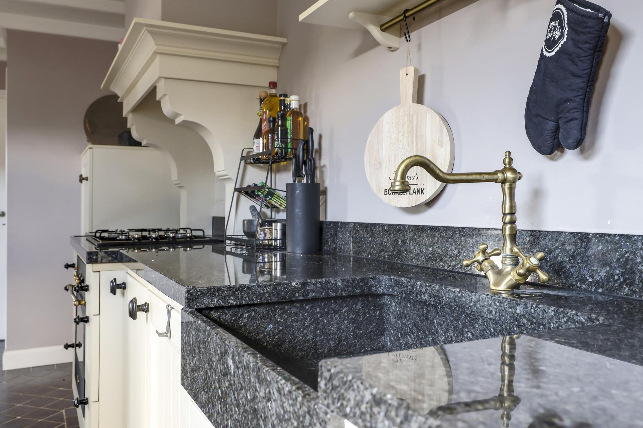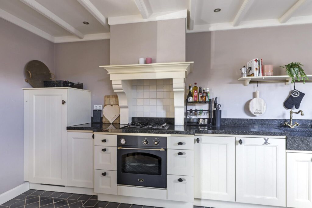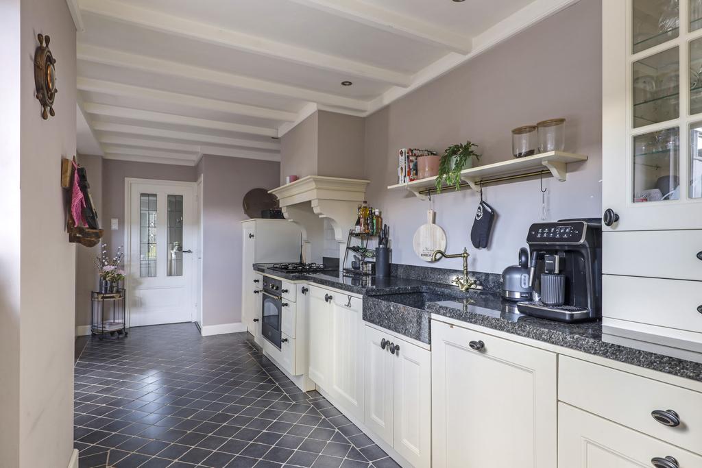 De keuken heeft een open karakter naar de woonkamer en is, mede door de uitbouw, ruim opgezet. Het keukenblok is in een landelijk stijl uitgevoerd waarbij het natuurstenen aanrechtblad meteen in het oog springt. Dit werkblad verspringt naar voren bij het kookgedeelte wat een speels effect geeft. De gootsteen is eveneens in hetzelfde graniet uitgevoerd waardoor het één geheel is met het werkblad. Boven de 4-pits gaskookplaat is een klassieke schouw met sierlijke kranslijst (en afzuiger) aangebracht. De inbouwapparatuur bestaat verder uit een vaatwasser, een hoge oven en een koelkast. Verder zijn er smaakvolle keuzes gemaakt met betrekking tot de paneelfronten, de zwarte grepen en de getrommelde tegeltjes op de vloer. Het balkenplafond met daartussen diverse inbouwspots versterken de landelijke woonsfeer en maken het helemaal af.