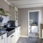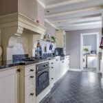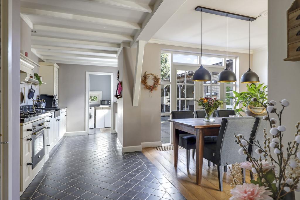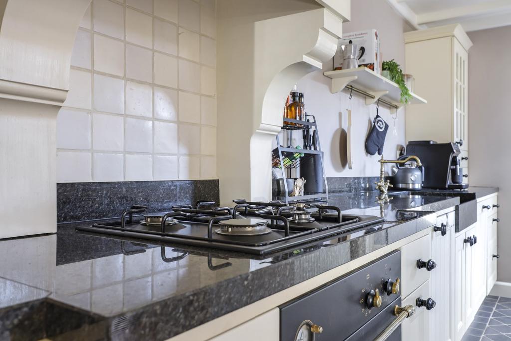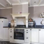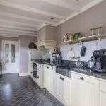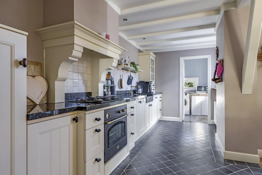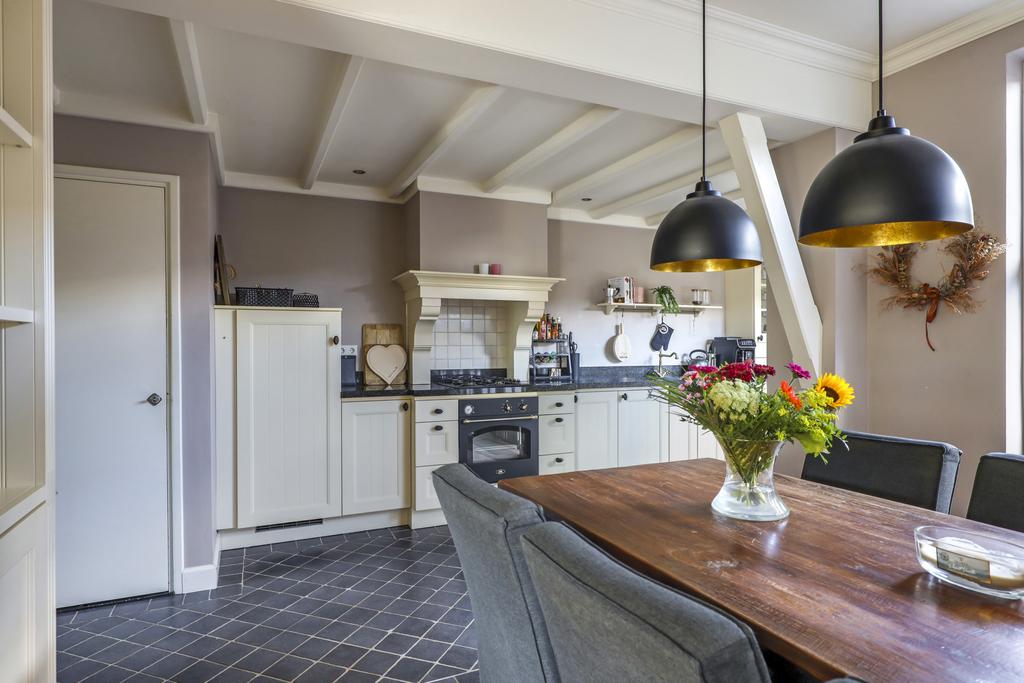 De keuken heeft een open karakter naar de woonkamer en is, mede door de uitbouw, ruim opgezet. Het keukenblok is in een landelijk stijl uitgevoerd waarbij het natuurstenen aanrechtblad meteen in het oog springt. Dit werkblad verspringt naar voren bij het kookgedeelte wat een speels effect geeft. De gootsteen is eveneens in hetzelfde graniet uitgevoerd waardoor het één geheel is met het werkblad. Boven de 4-pits gaskookplaat is een klassieke schouw met sierlijke kranslijst (en afzuiger) aangebracht. De inbouwapparatuur bestaat verder uit een vaatwasser, een hoge oven en een koelkast. Verder zijn er smaakvolle keuzes gemaakt met betrekking tot de paneelfronten, de zwarte grepen en de getrommelde tegeltjes op de vloer. Het balkenplafond met daartussen diverse inbouwspots versterken de landelijke woonsfeer en maken het helemaal af.