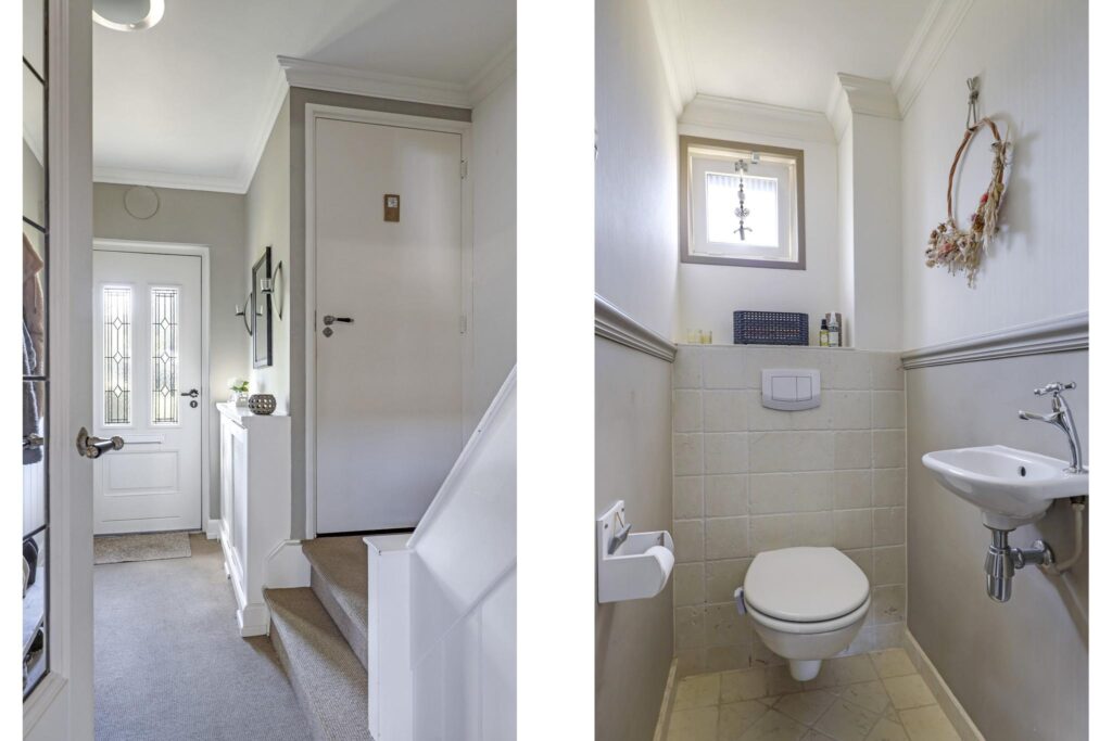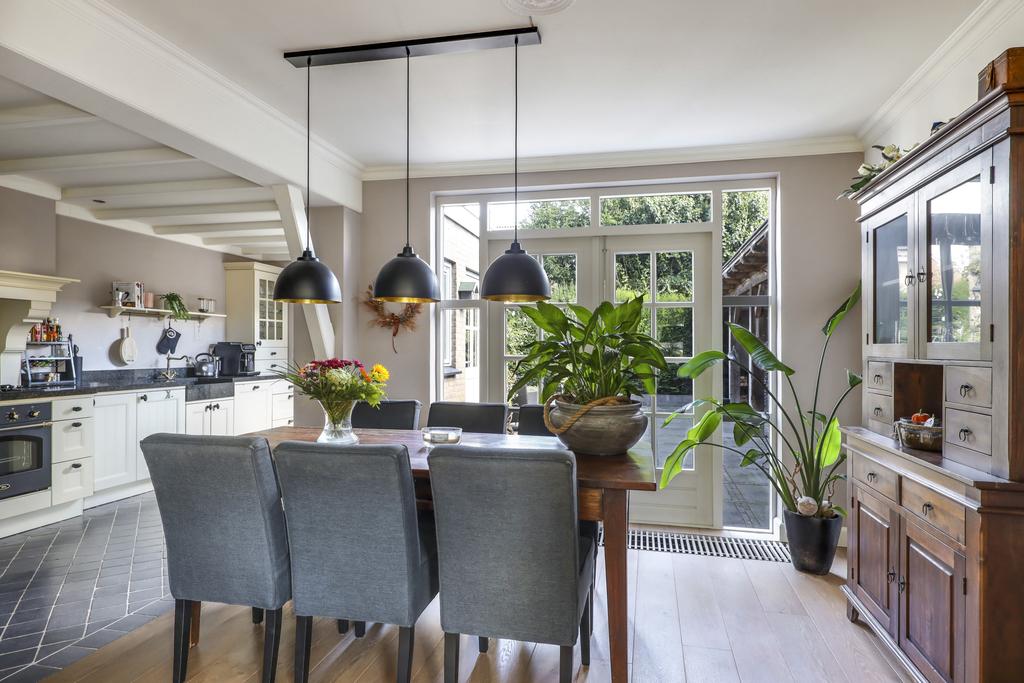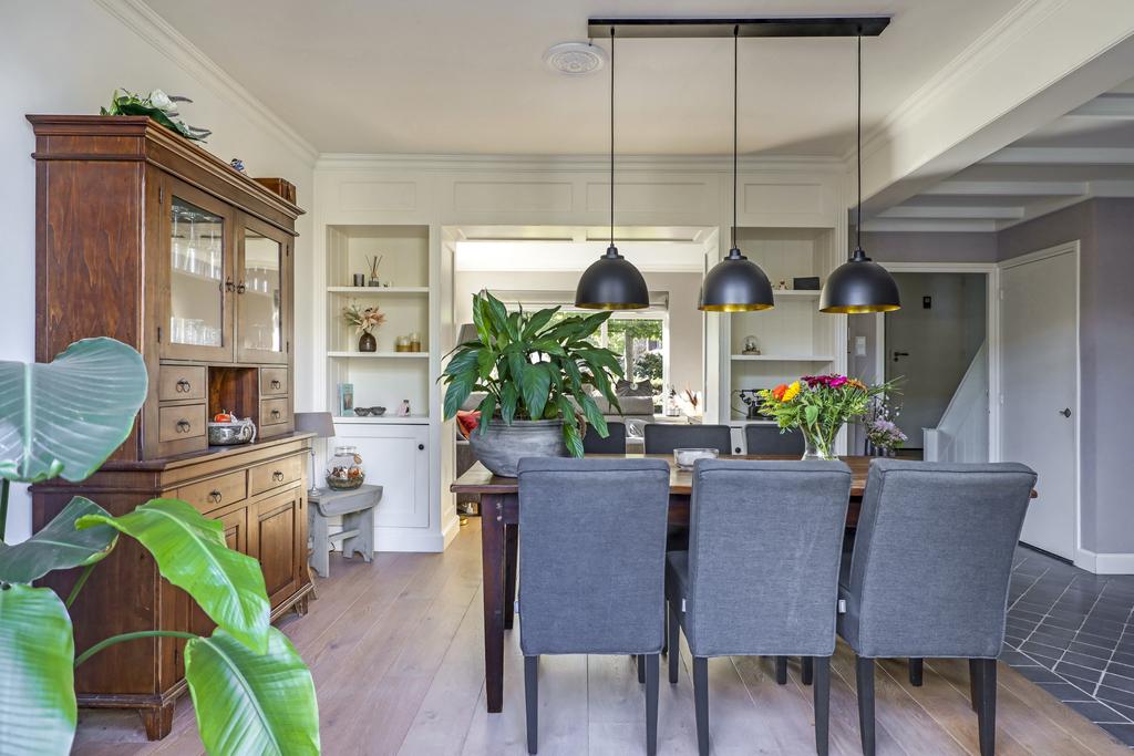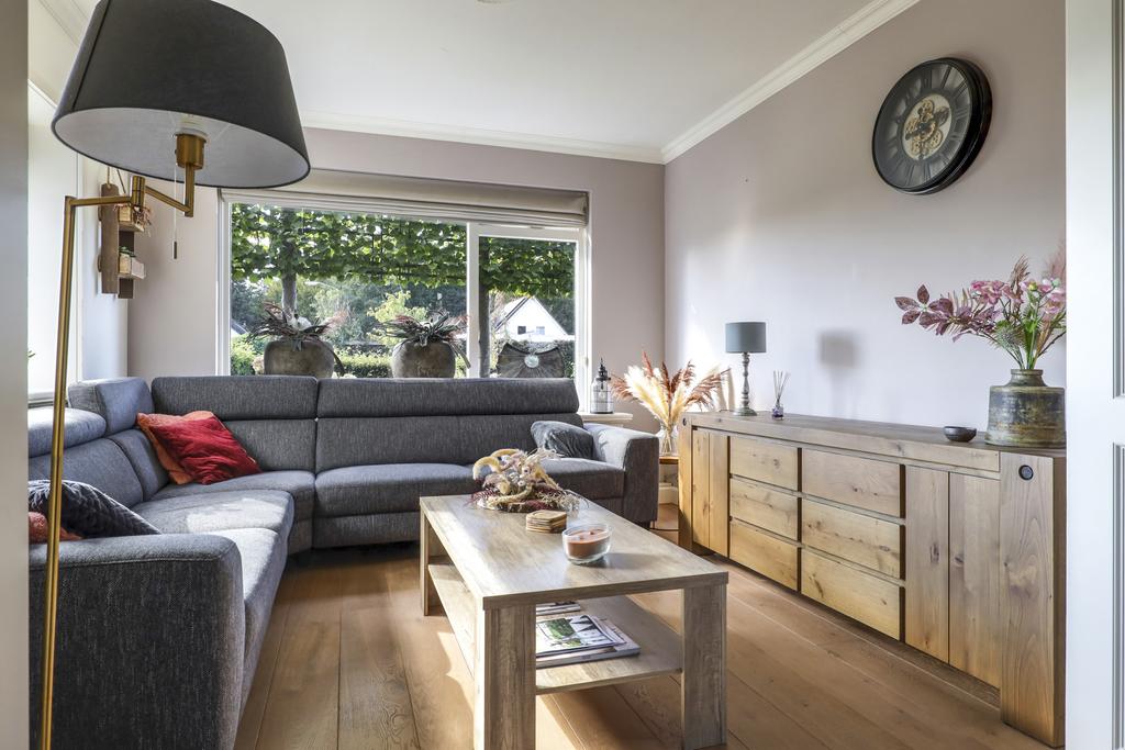 Zodra je hier op de deurmat staat, voel je meteen dat het hier geen standaard woning betreft. Deze woning ademt een landelijke stijl uit wat tot in detail is doorgevoerd in het materiaalgebruik en afwerkingsniveau. Elementen als glas-in-lood (ook in de nieuwe voordeur), lambrisering, een balkenplafond met kraaldelen, stuclijsten langs het plafond en roedeverdeling in de achterpui (met openslaande tuindeuren), zijn zomaar wat voorbeelden. In de woonkamer springt de en-suite kastenwand meteen in het oog en is een staaltje vakwerk van een meubelmaker. Het ontwerp van de keuken sluit naadloos aan op de landelijke stijl die deze woning ademt. De ‘paneelfronten’ in combinatie met de schouw en granieten werkblad creëren een woonsfeer die je niet snel ergens anders zult ervaren in dit prijssegment.