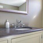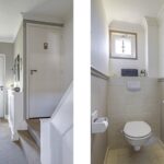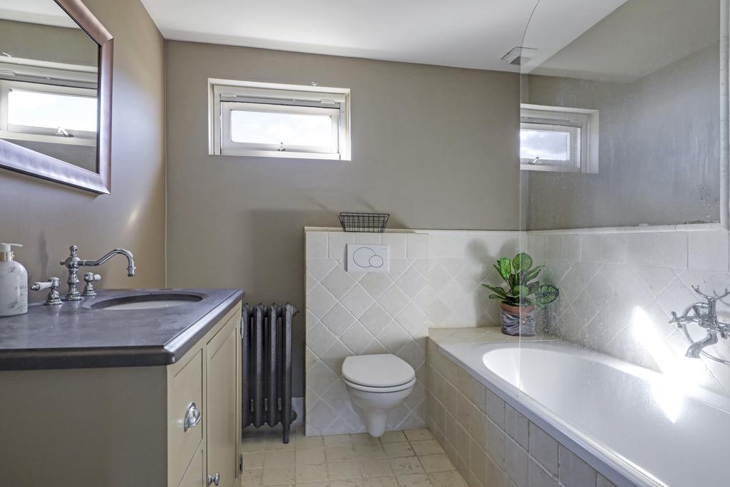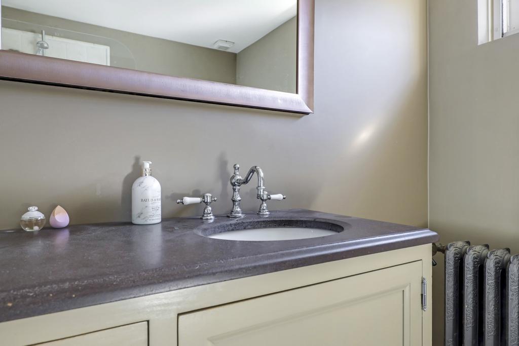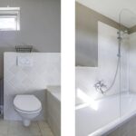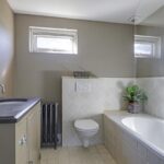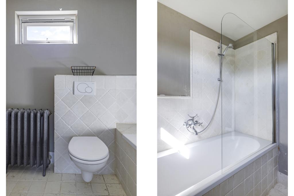 De 5e deur op de overloop is van de badkamer en deze is ruimtelijk ingedeeld met een ligbad/douche, een 2e zwevend toilet en een wasmeubel. Het wasmeubel is niet zomaar een wasmeubel, maar een houten meubel met een natuurstenen blad erop. De kranen met losse ‘hendels’ zijn daarbij op het blad geplaatst. Dit soort wasmeubels komen we vaak alleen tegen in duurdere, klassieke woningen en zijn doorgaans erg prijzig. De gietijzeren ledenradiator op pootjes lijkt rechtstreeks uit een klooster te komen en is eveneens een uniek element in de woning. Verder heeft de badkamer een raam (met rolhor), waardoor je op natuurlijke wijze kunt ventileren.