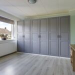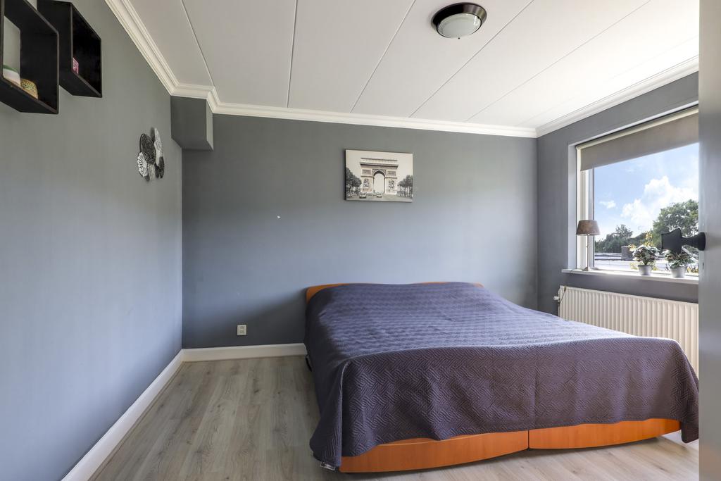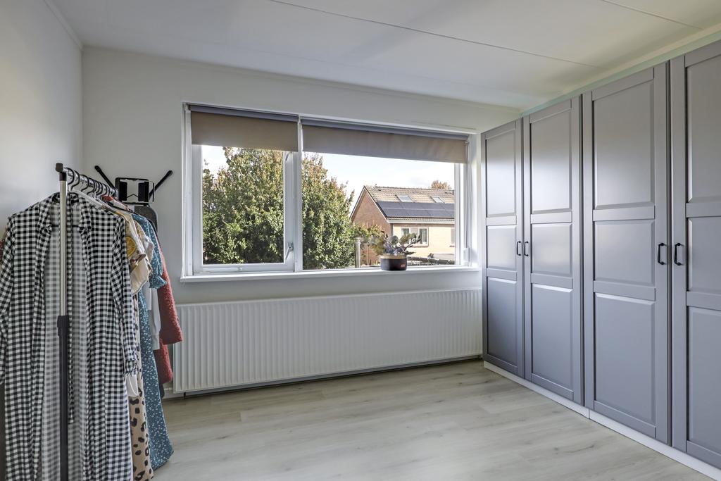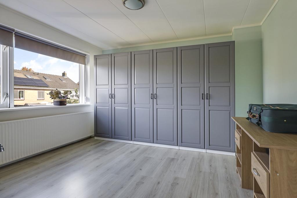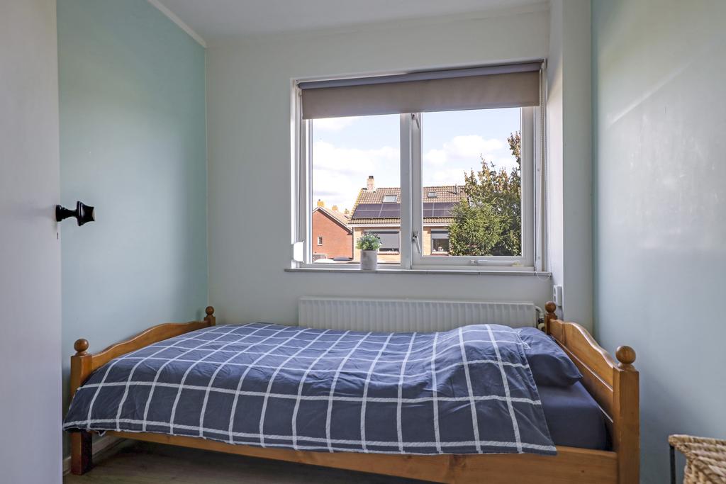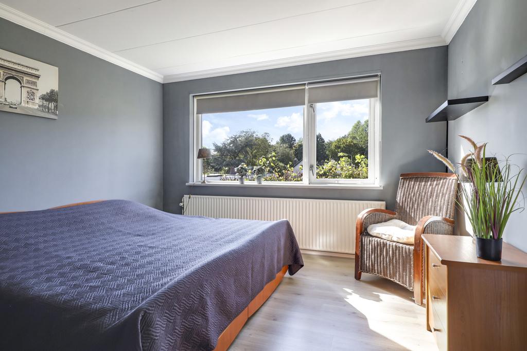 Via de hal en trapopgang komen we op de 1e verdieping terecht. Deze woonlaag telt 3 slaapkamers van respectievelijk 13m2, 13m2 en 5m2 groot. Doordat de woning een mooie breedtemaat van 6 meter heeft (binnenwerks) zijn de 2 grootste slaapkamers verrassend ruim opgezet. Je kunt hierdoor prima een grote linnenkast kwijt terwijl de loopruimte om een 2-persoonsbed behouden blijft. Alle kamers hebben dezelfde vergrijsd eiken laminaatvloer gekregen. De openslaande ramen hebben ieder een eigen rolhor, zodat insecten geen kans krijgen. De slaapkamer aan de voorzijde heeft een screen (zonwering) en de slaapkamers aan de achterzijde rolluiken. Deze kamers zijn dan ook geheel te verduisteren. Noemenswaardig is de vaste kast op de overloop die erg handig kan zijn als kledingkast voor de 3e slaapkamer.