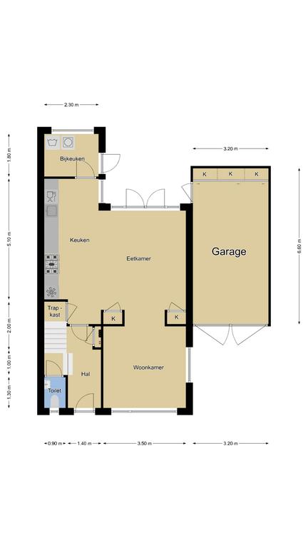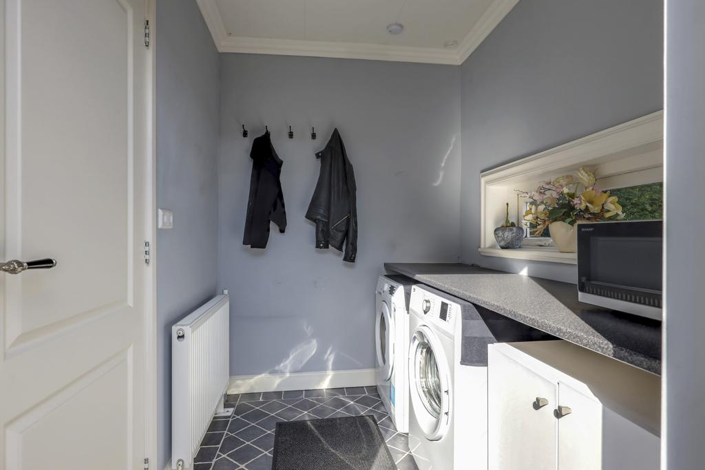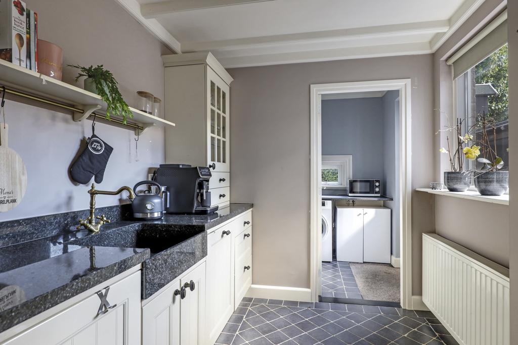 Via de keuken is de achtergelegen bijkeuken te bereiken. Deze ruimte is erg praktisch en biedt plaats aan de wasmachine, wasdroger en een vriezer. Ook is vanuit de bijkeuken de achtertuin bereikbaar.