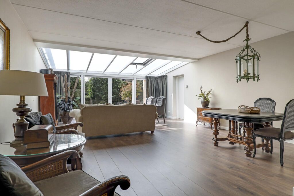 Woonkamer met serre-aanbouw voorzien van dubbele schuifpui naar buitenterras