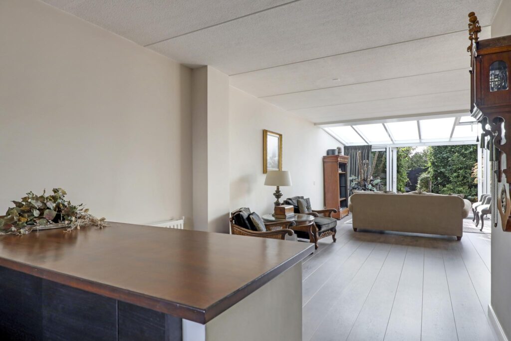 De woonkamer is een bijzonder prettige leefruimte in deze woning. De serre-aanbouw zorgt namelijk voor een unieke beleving met een ruimtelijk gevoel en veel lichtinval. Door de ruimte ben je vrij om je eigen opstelling en indeling te maken. Je hoeft hier niet bang te zijn of dat die grote hoekbank en/of lange eettafel hier wel past. Bovendien zorgt het vele glas ervoor dat je het gevoel krijgt in de tuin te zitten. Een groot pluspunt is en dubbele schuifpui waardoor je het buitenleven eenvoudig bij de woonkamer betrekt. Het afwerkingsniveau is verzorgd met strakke wandafwerking en een trendy laminaatvloer met hoge plinten. In de donkere avonduren kun je een leuke woonsfeer creëren door de spotverlichting in de dragers van de serre te dimmen.